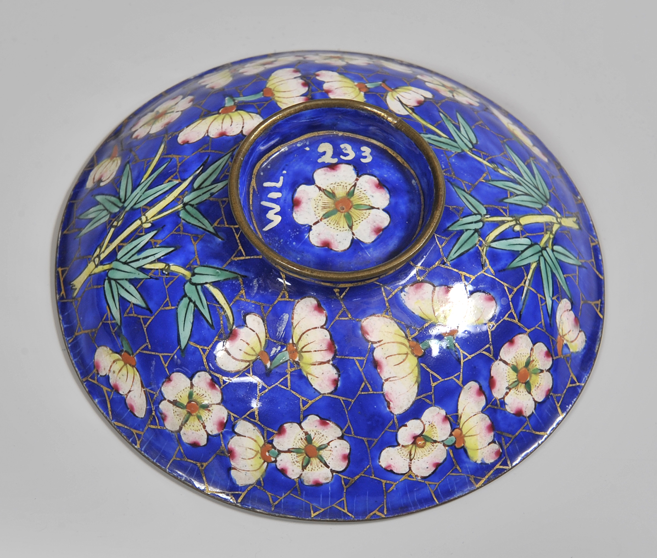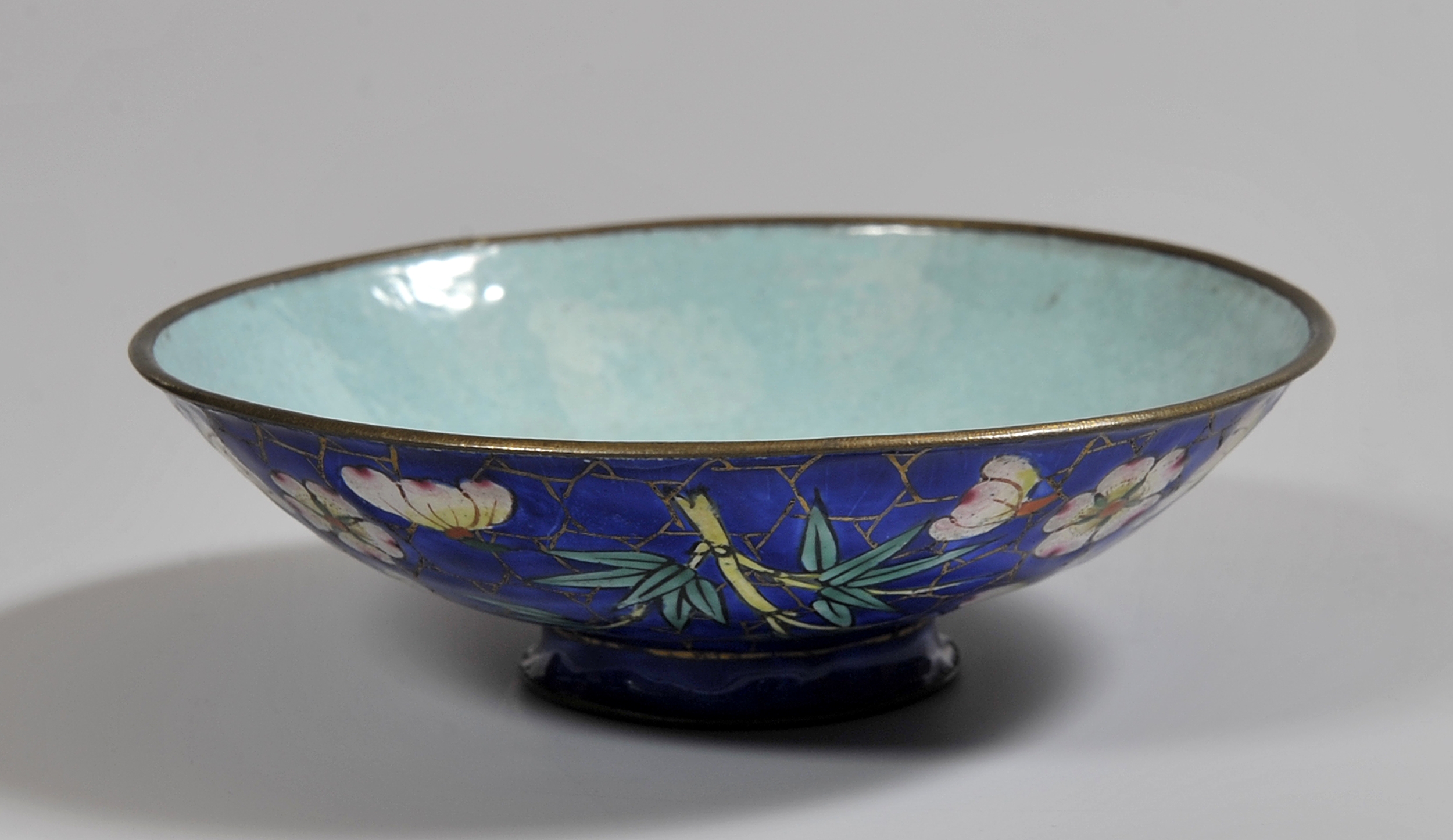 Czarka wykonana w technice emalii na miedzi. Okrągła, niska, rozszerzająca się ku górze, na krótkiej, cylindrycznej stopce. Całą zewnętrzną powierzchnię czarki pokrywa emalia w głębokim kobaltowym kolorze. Zdobią ją gęsto rozmieszczone białoróżowe kwiaty śliwy i gdzieniegdzie zielone gałązki bambusa na tle złotego wzoru przypominającego spękany lód. Od spodu denko ozdobiono pojedynczym kwiatem śliwy. Wnętrze naczynia pokryto emalią o barwie turkusowej.