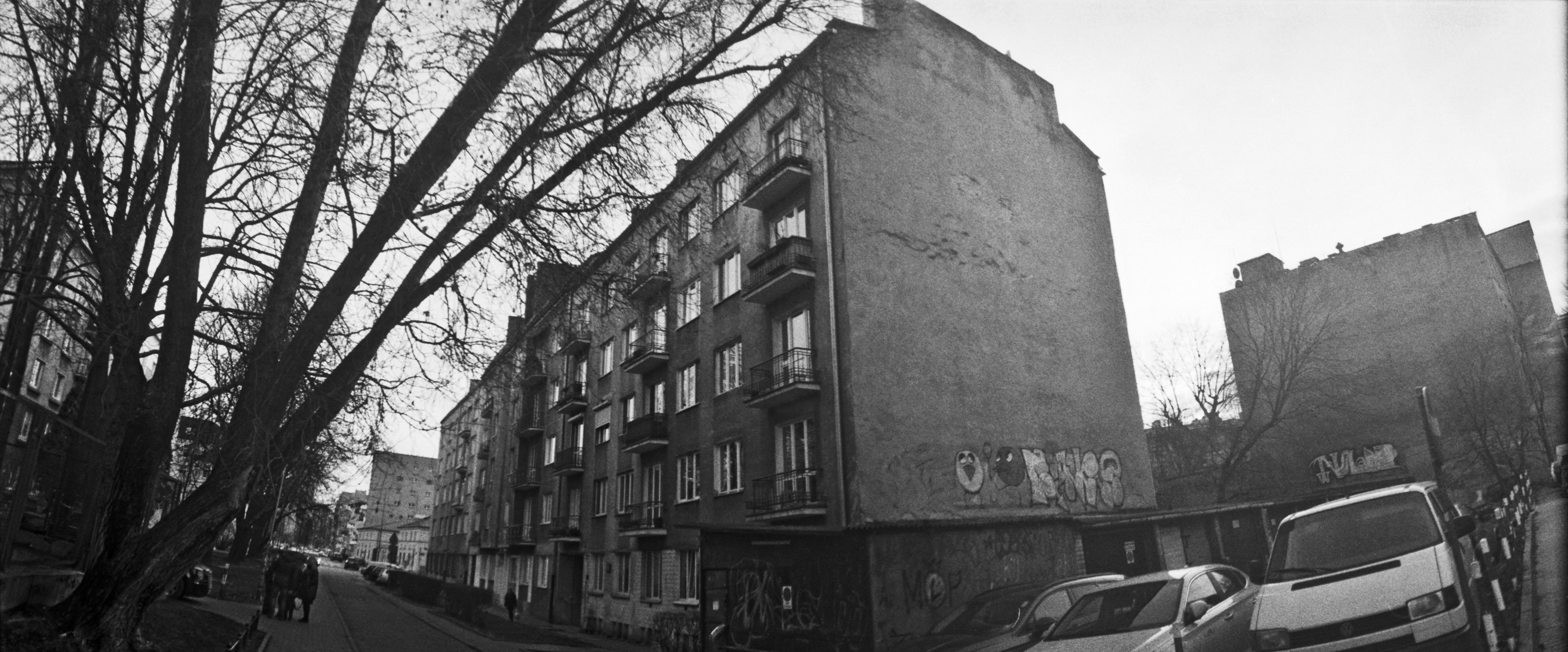 Drugie z czarno-białych ujęć, obok MPOLIN-M1067, wykonanych szerokokątnym obiektywem prezentujące aktualny widok budynku przy ul. Żelaznej 103 w Warszawie.