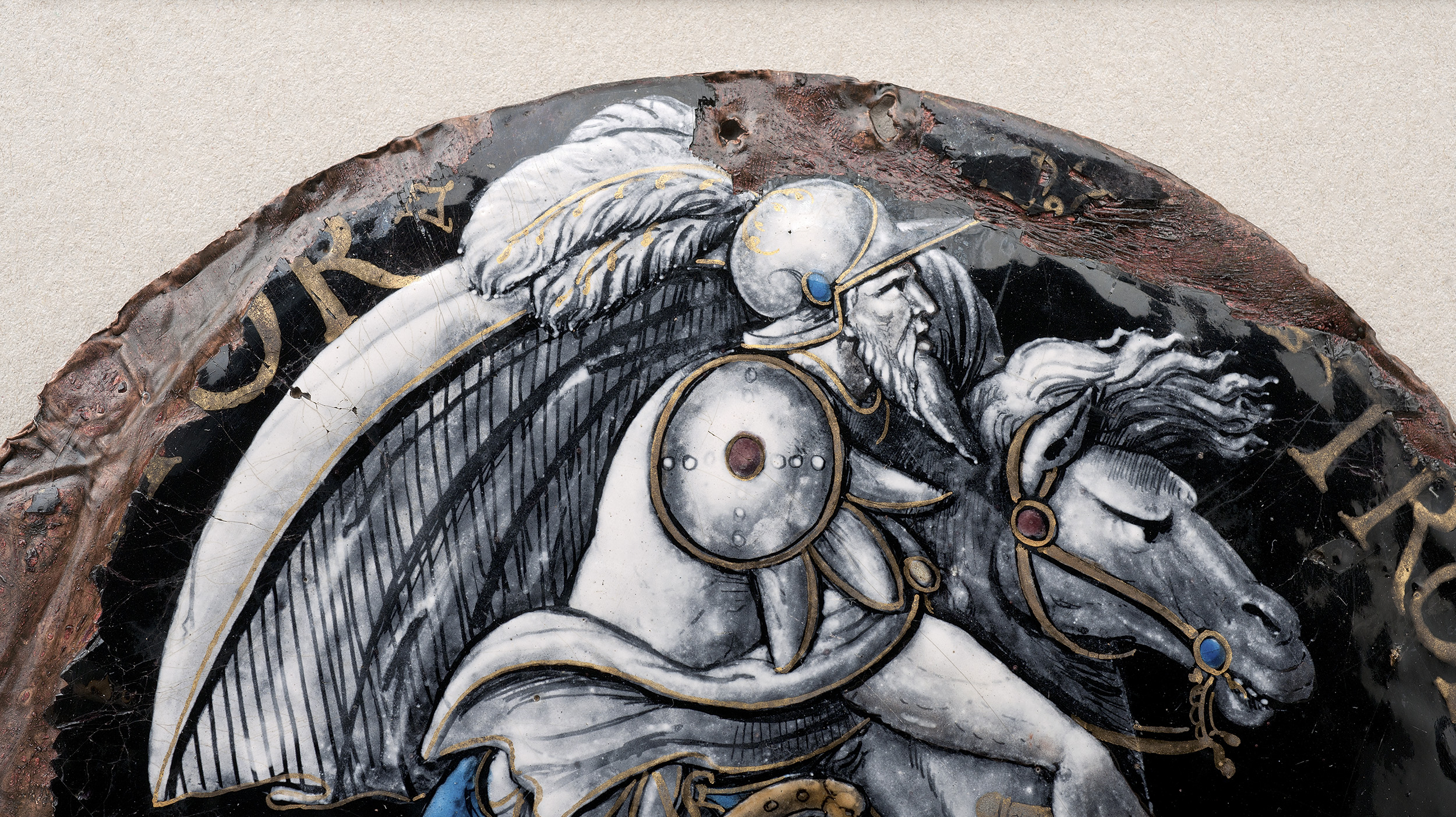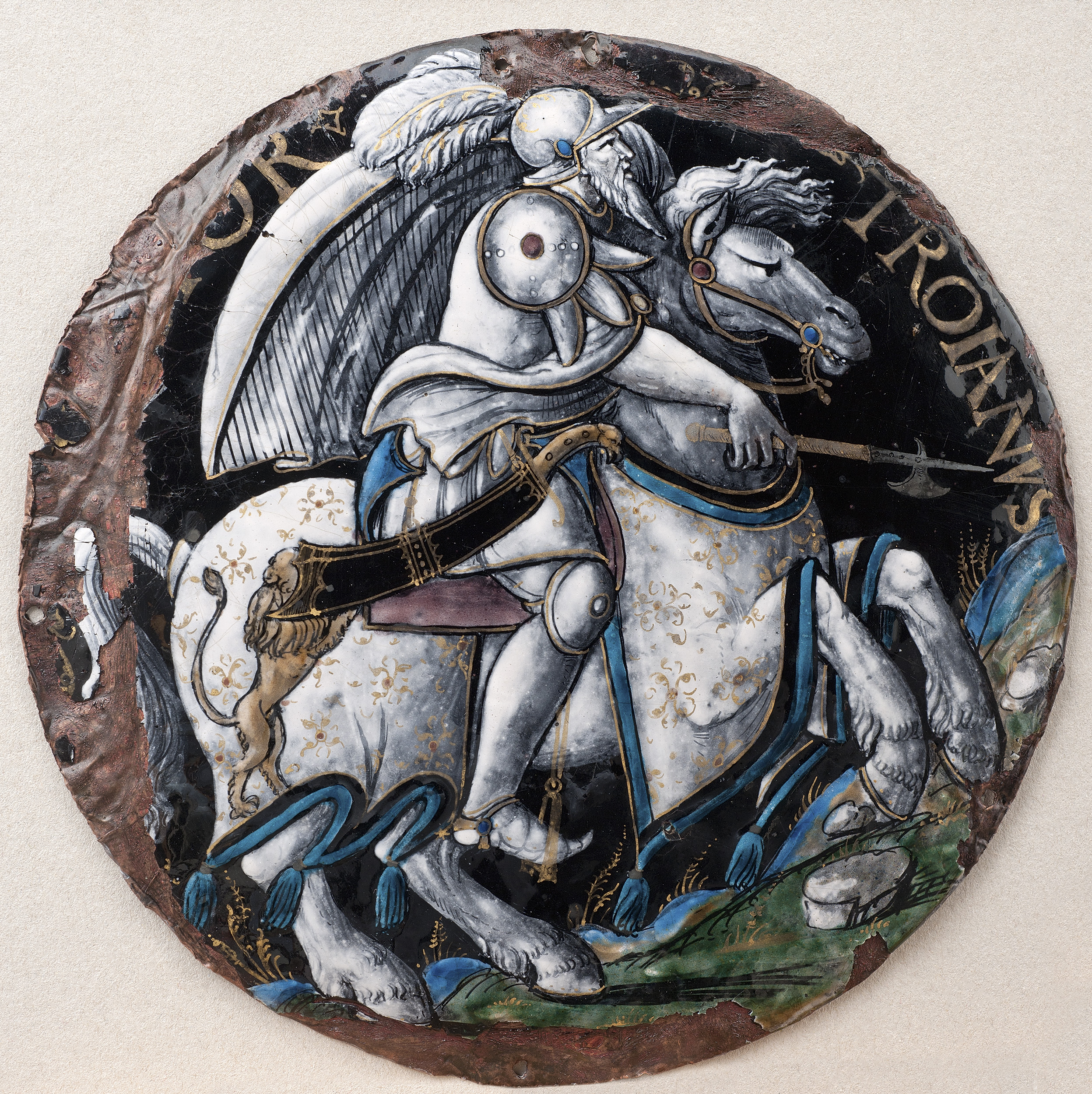 Okrągła plakieta z wizerunkiem konnego rycerza, wypełniającym niemal całkowicie jej powierzchnię, pokryta emalią z dekoracją en grisaille na czarnym tle ze złoceniami. Przedstawienie ożywiają kolorystyczne akcenty detali w tonacji niebieskiej, zielonej, ugrowej i fioletu. Siwego, w prawo zwróconego, galopującego konia dosiada brodaty rycerz w pełnej zbroi i hełmie z pióropuszem, z czekanem w prawym ręku. U jego prawego boku zwisa szeroka pochwa z osadzonym w niej mieczem. Nad plecami unosi się rozwiany pędem wiatru płaszcz. Koń okryty ozdobnym czaprakiem z niebieskimi frędzlami. Na wysokości zadu konia, na czapraku, widoczny wizerunek wspiętego lwa. Wokół skraju górnej krawędzi widoczna inskrypcja pisana złotymi literami (częściowo wykruszona): „Hector Troianus”.