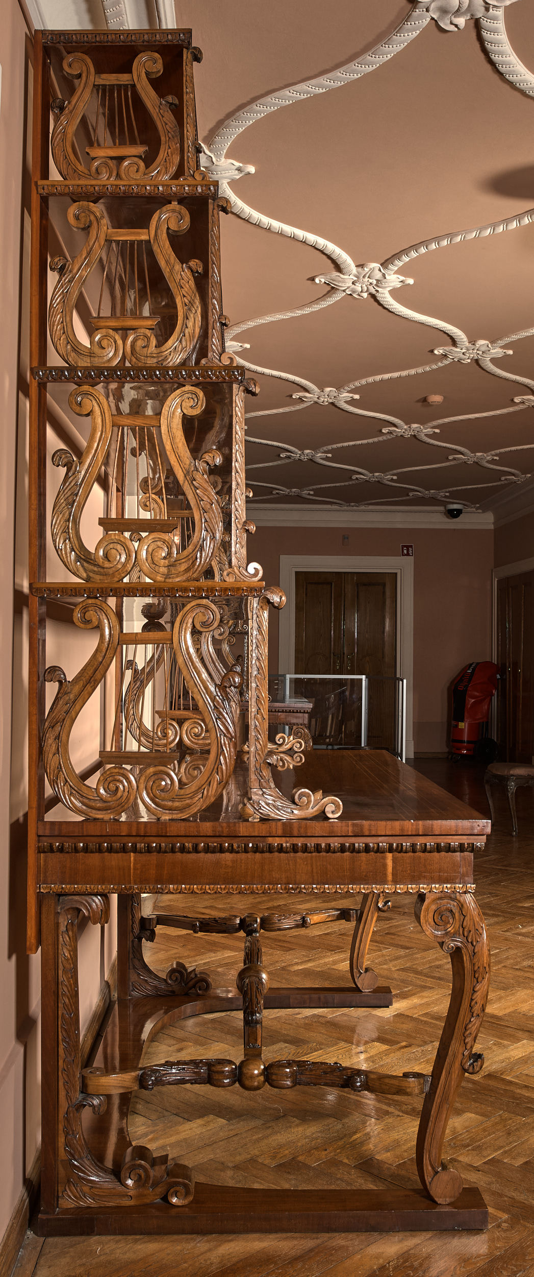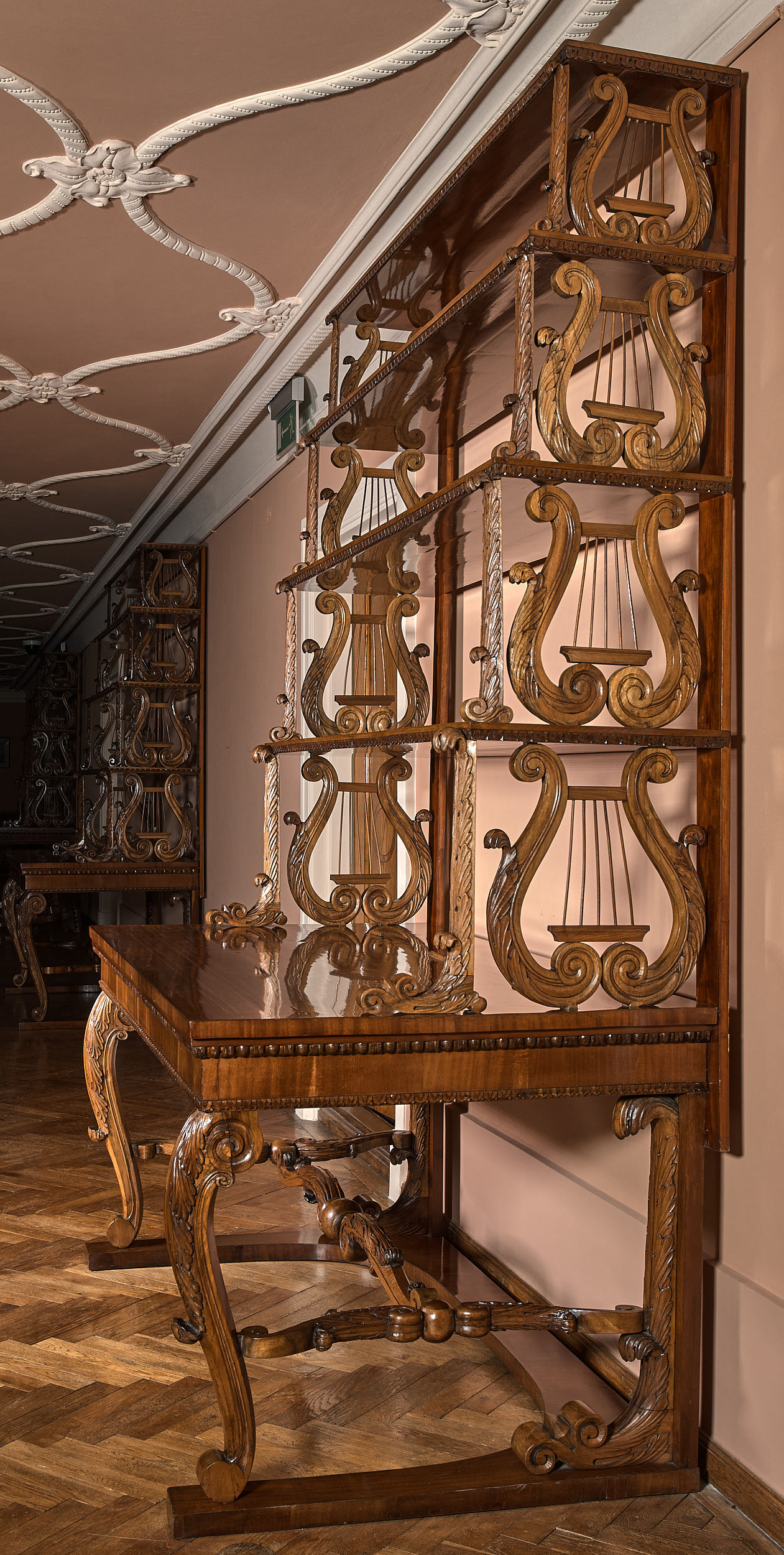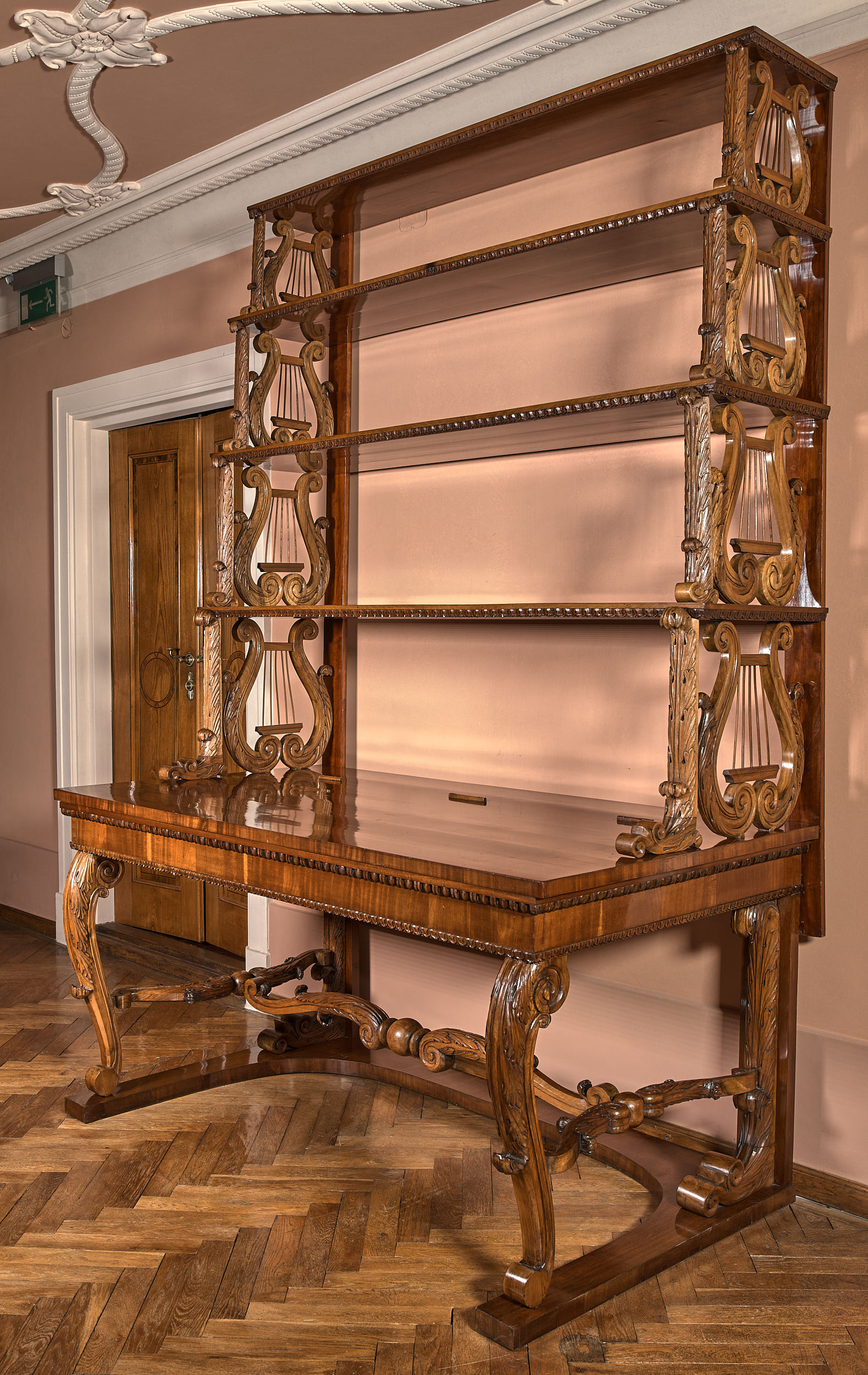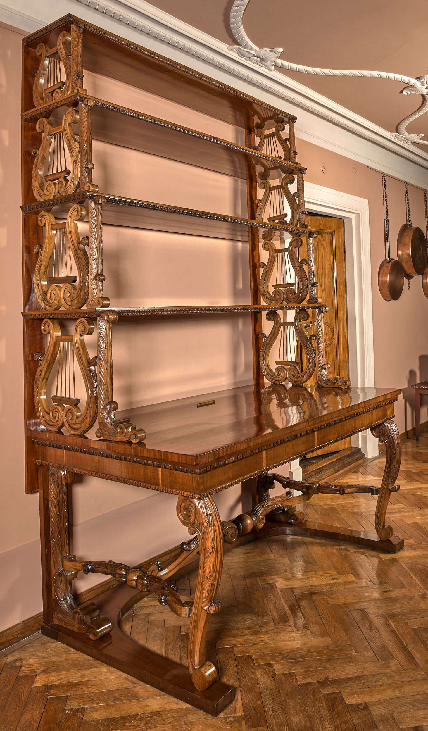Prezentowany stół konsolowy z półkami jest jednym z czterech identycznych mebli wraz z S.520MŁ; S.524MŁ; S.542MŁ. Stanowią one uzupełnienie kompletu dla sześciu półkolistych konsol S.3705MŁ; S.4211MŁ; S.4213MŁ; S.4205MŁ; S.4507MŁ; S.4209MŁ. Podobieństwo użytych materiałów i detali świadczy o wspólnym pochodzeniu warsztatowym zestawu mebli, najwyraźniej wykonanego na indywidualne zlecenie i przeznaczonego do potrzeb ekspozycyjnych. Łacińskie słowo „consol”, tłumaczone jako pocieszenie, przeszło do wielu języków europejskich. We Francji terminem „console”, w znaczeniu wsparcia lub podpory, nazwano wprowadzone pod koniec XVII w. przyścienne wsporniki, postumenty, stoły. Konsole pełniły funkcję dekoracyjną, służyły do ekspozycji rzeźb, zegarów, waz i podobnych wyrobów używanych do ozdoby wnętrz reprezentacyjnych. Grupowano je symetrycznie ustawiając między oknami lub drzwiami, a dla większej stabilności mocowano zazwyczaj do ściany. Przylegający do niej tył konsoli pozostawał nieobrobiony, w odróżnieniu od boków skierowanych do widza. Spopularyzowane w ciągu XVIII w. konsole przybierały kształty zgodne z panującą modą, z użyciem charakterystycznych form stylistycznych i detali. Opisywanej konsoli nadano formę prostokątnego stołu z czterokondygnacyjną przyścienną półką - nastawą. Konsola wspiera się czterema nogami na wąskiej, otwartej przodem podstawie typu płozy. Politurowane blaty i podstawę fornirowano warstwą mahoniu. Wyraźny akcent w wyglądzie mebla stanowi snycerka zdobiąca nogi z łączyną oraz ażurowe boki zwężających się do góry półek nastawy. Motyw liry w podporach półek i liści akantu nadają meblowi lekkość późnego klasycyzmu. Jednak przejrzysta i prosta forma mebla jest typowa dla stylu biedermeier, dominującego w Europie środkowej od drugiego do piątego dziesięciolecia XIX w.