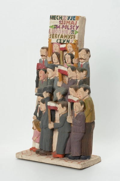 Rzeźba „1,2,3 Maj” powstała pod koniec życia artysty. Jest to kompozycja statyczna, przyścienna i płaskorzeźbiona, wykonana w jednym kawałku drewna lipowego. Postacie ustawione piętrowo, to schematycznie ujęte sylwetki mężczyzn ubranych w garnitury i trzymających w dłoniach chorągiewki biało-czerwone i czerwoną. Porządek pochodu i jednorodną kolorystykę zakłóca barwna plama – stojąca w pierwszym rzędzie dziewczynka w różowej sukience. Najciekawszym elementem jest jednak napis umieszczony na transparencie trzymanym przez cztery kobiety: „Niech żyje 1,2,3 Maj w Polscy Ludowej serca, myśli, czyny”. Jest to z jednej strony hasło poprawne ideologicznie i częste w Polsce Ludowej (1945–1989), z drugiej zaś sprytne „ przemycenie” święta 3 Maja zniesionego w 1951 roku, na który władze ludowe patrzyły z wrogością. Był to prawdopodobnie światopoglądowy manifest artysty.