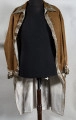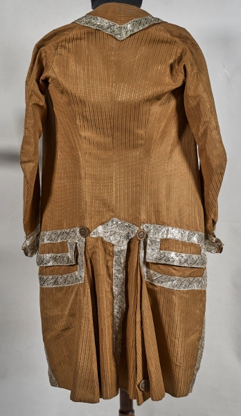 Frak z jasnobrązowego jedwabiu prążkowanego, obszyty srebrną bortą. Przody fraka zaokrąglone, dochodzące do siebie, nie zapinane mimo jedenastu guzików przyszytych na prawym przodzie (na borcie). Na lewym borcie imitacja jedenastu dziurek. Guziki bardzo dekoracyjne. Płaskie, obciągane materiałem, haftowane bajorkiem i cekinami. Plecy fraka dopasowane trzema pionowymi zaszewkami, które są rozcięte od dołu do linii bioder. Poły fraka dość wąskie, założone z tyłu w fałdy umocowane na dwóch guzikach, Przez środek fraka rozcięcie. Kołnierz zszywany przez środek z ostrymi rogami. Rękawy długie, wąskie, o dwóch szwach. Mankiet odwijany, zapinany na dwa mniejsze guziki. Na linii bioder, po bokach głębokie kieszenie przecinane. Frak dekorowany jest srebrną bortą. Taśmą tą obszyto kołnierz, brzegi przodów, mankiety, klapy kieszeni. Cały frak łącznie z rękawami podszyty białą jedwabną podszewką. Kołnierz i wnętrze kieszeni wyłożone szarym lnem. Uszyty w Polsce, datowany na XVIII/XIX wiek.