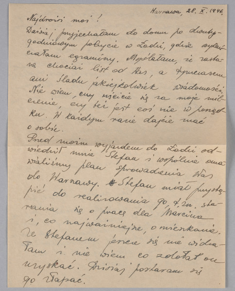 „Dzisiaj przyjechałam do domu po dwutygodniowym pobycie w Łodzi, gdzie wykończałam egzaminy. [...] Przed moim wyjazdem do Łodzi odwiedził mnie Stefan i wspólnie omawialiśmy plan sprowadzenia Was do Warszawy. Stefan miał przystąpić do realizowania go, tzn. starania się o pracę dla Marcina i, co najważniejsze, o mieszkanie. [...] U mnie stare dzieje. Egzaminy nareszcie odwaliłam, teraz już na stałe przeniosłam się do Warszawy. Studia chcę ułożyć tak, żeby pozostać na Uniwersytecie Łódzkim. Będę chyba musiała co tydzień jeździć na seminaria. Poza tym, możliwe, że będę chodzić tu na Akademię Nauk Politycznych, ale to jeszcze nie pewne. No i pozostanie robota w «Życiu», chyba będę pracować w Zarządzie Głównym. [...] Jak miewa się szanowny obywatel Aleksander?”.