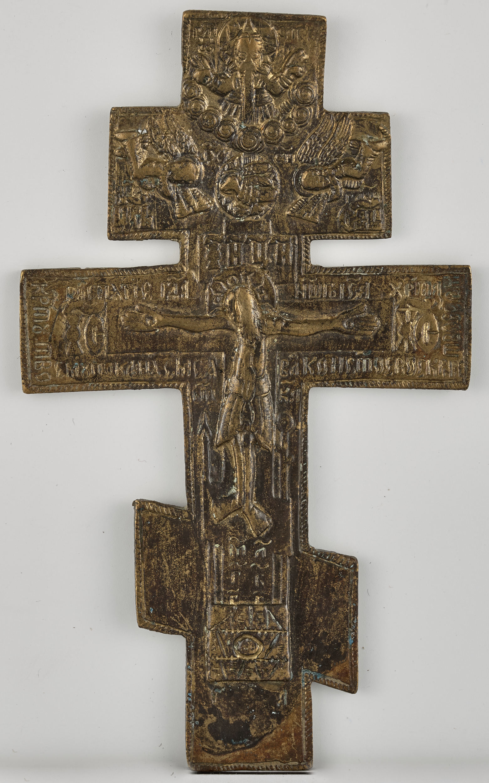 Na Rusi powszechnie używano krzyży odlewanych ze stopów metali. Początkowo pierwowzorem dla nich były wyroby rzemieślnicze z Bizancjum. Z czasem rozwinęły się rodzime ośrodki produkcji. Wypracowano własne typy przedstawień. Najbardziej rozpowszechniony był krzyż ośmiokończasty o trzech poprzecznych belkach (S.12789MŁ – 12795MŁ; S.12869MŁ; S.12871MŁ – 12876MŁ). Poczynając od końca XVII po XX w. produkcja odlewanych przedmiotów kultu skupiła się w rekach staroobrzędowców - zwolenników staroruskiej tradycji cerkiewnej. Byli oni prześladowani na skutek anatemy, inaczej wyłączenia lub klątwy, nałożonej podczas soboru w latach 1666-1667, gdy ostatecznie dopracowano reformę liturgiczną cerkwi moskiewskiej. Staroobrzędowcy, nie uznający powierzchownej ozdobności, wypracowali własne typy wyrobów. Upowszechniły się one i były naśladowane w całej Rosji, używane także przez wyznawców oficjalnej doktryny. Szczególnym kultem staroobrzędowcy otaczali krzyż, w obrębie którego istotną rolę odgrywały napisy identyfikacyjne i modlitwy towarzyszące wizerunkowi Ukrzyżowania, umieszczane także z tyłu. Wspólnoty starowierców nie były jednomyślne co do szczegółów przedstawień oraz napisów towarzyszących Ukrzyżowaniu. Bezpopowcy, którzy zrezygnowali z posługi kapłanów, różnili się w poglądach od popowskich wspólnot. W wypracowanych przez popowców wzorach w zwieńczeniu Ukrzyżowania dopuszczano wizerunek Pana Zastępów – starotestamentalnego Jahwe Sabaoth, poniżej którego przedstawienie gołębicy symbolizowało Ducha Świętego. W „titulusie” umieszczonym nad głową skazanego Chrystusa popowskie wspólnoty używały skrótu ІНЦИ oznaczającego Jezus Nazarejczyk Car (Król) Judei, w odróżnieniu od bezpopowców uważających taki napis za heretycki, zapoczątkowany wraz z reformą przez patriarchę Nikona. Pozostałe napisy na krzyżach omówiono pod S.12793MŁ.