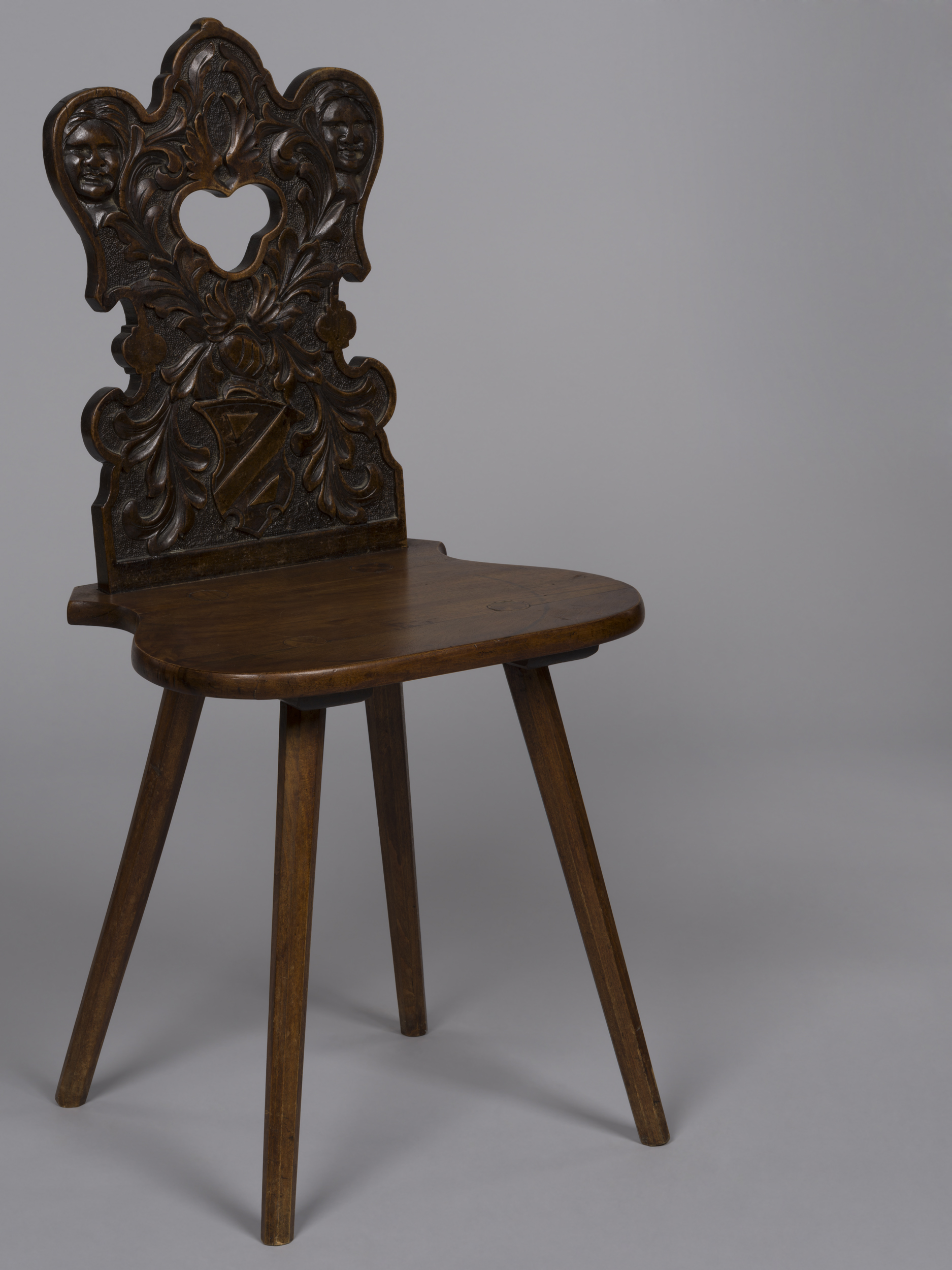 Zydel o podkowiastym gładkim siedzisku, wsparty na czterech lekko rozchylonych, nieco zbieżnych nogach o przekroju ośmioboku. Pod siedziskiem znajdują się dwie deski. w których parami osadzone zostały nogi. Deska oparcia została wpuszczona w siedzisko i połączona z nim za pomocą klinów. Jej kształt jest wykrojowy, od góry zamknięty faliście trzema łukami, w połowie wysokości przewężony i niżej ponownie się rozszerzający. Krawędzie podkreślone są ornamentem wstęgowym. W bocznych łukach zwieńczenia wyrzeźbione zostały dwie twarze. Pośrodku górnej części oparcia znajduje się otwór o kształcie odwróconego czworoliścia. Poniżej niego przedstawiony został kartusz herbowy z hełmem i labrami w formie roślinnych wici rozpostartych na cztery strony wypełniając przestrzeń całego oparcia. W polu widnieje lewy skos i dwa trójkąty.