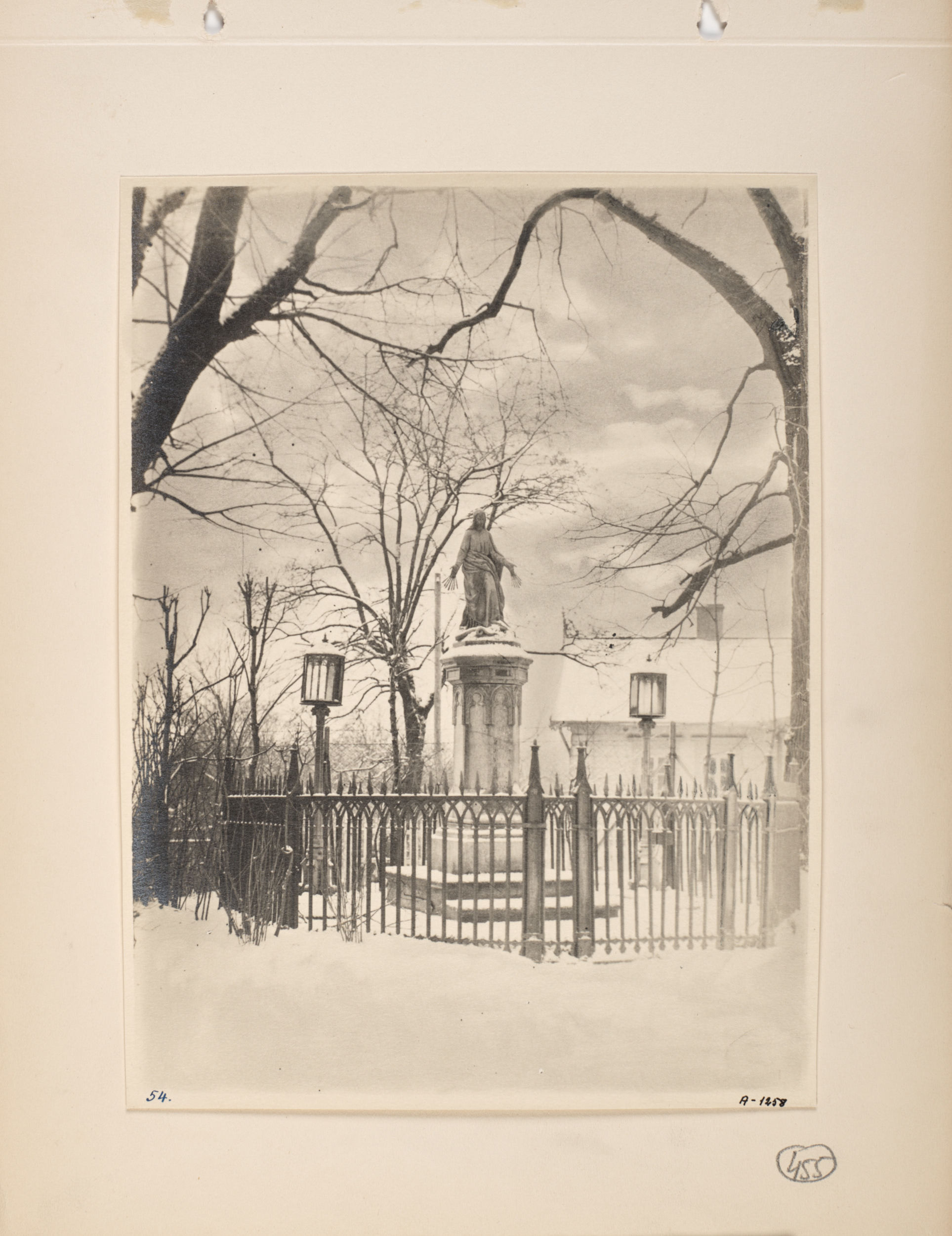 Fotografia przedstawia metalową figurę Matki Boskiej tzw. Immaculata na kamiennym neogotyckim sześciobocznym cokole i czworobocznej, dwupoziomowej podstawie. Na cokole umieszczony został napis O/MARYJO! /BEZ/GRZECHU/POCZĘTA/ MÓDL SIĘ/ ZA/NAMI/ A.D./ MDCCCLII . Figura ze stojącymi po jej bokach latarniami otoczona jest neogotyckim kutym płotem. Kiedy w l. 20 wykonano te fotografie figura Matki Boskiej znajdowała się już w obrębie parku łańcuckiego, tak jak obecnie. Wcześniej stała na terenie miasta. Dopiero w związku z wykupieniem tego terenu od miasta przez Romana Potockiego, podczas modernizacyjnych prac w rezydencji łańcuckiej, prowadzonych przez III ordynata Romana Potockiego i jego żonę Elżbietę z Radziwiłłów, włączono go w obręb parku.
