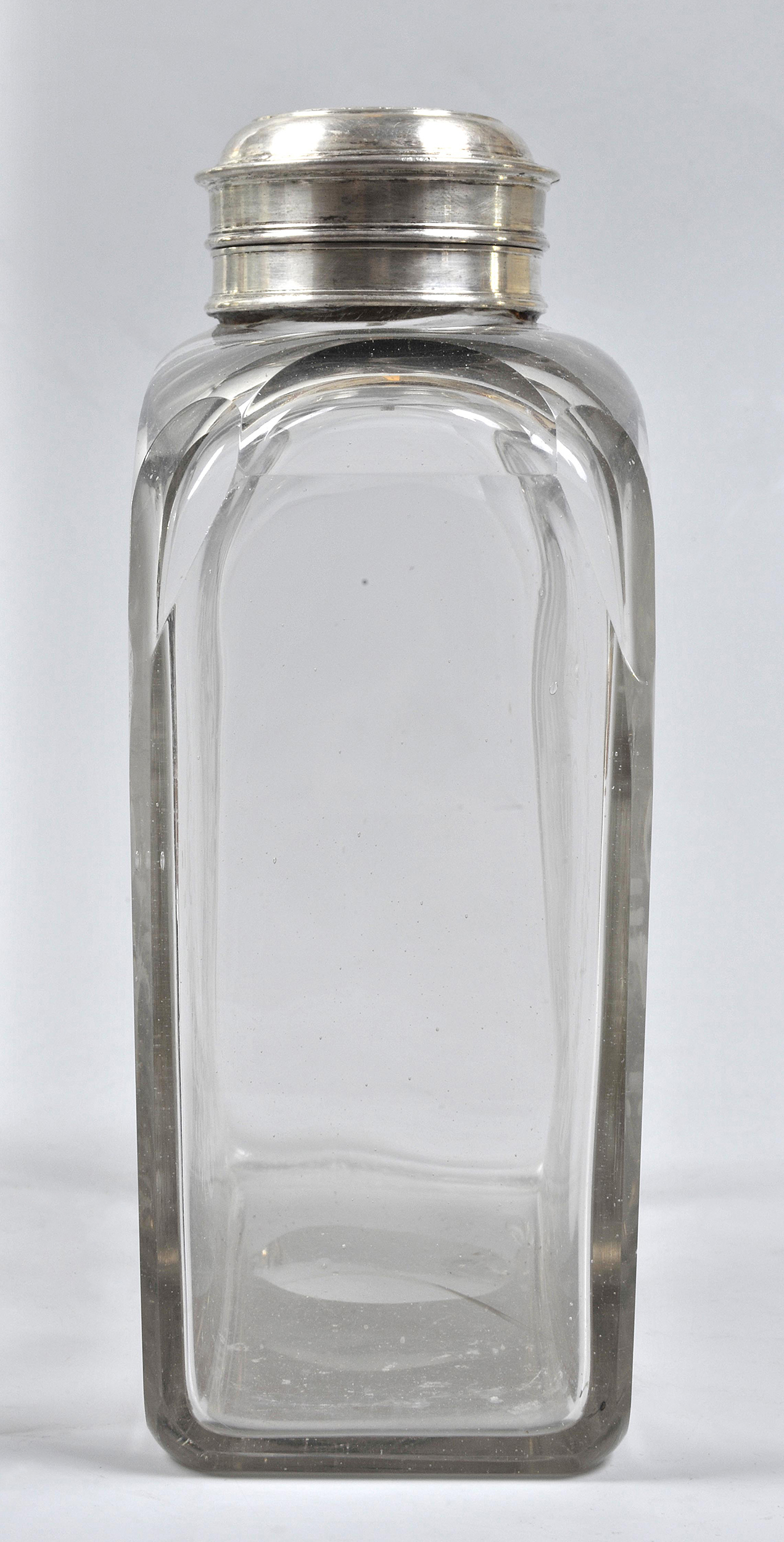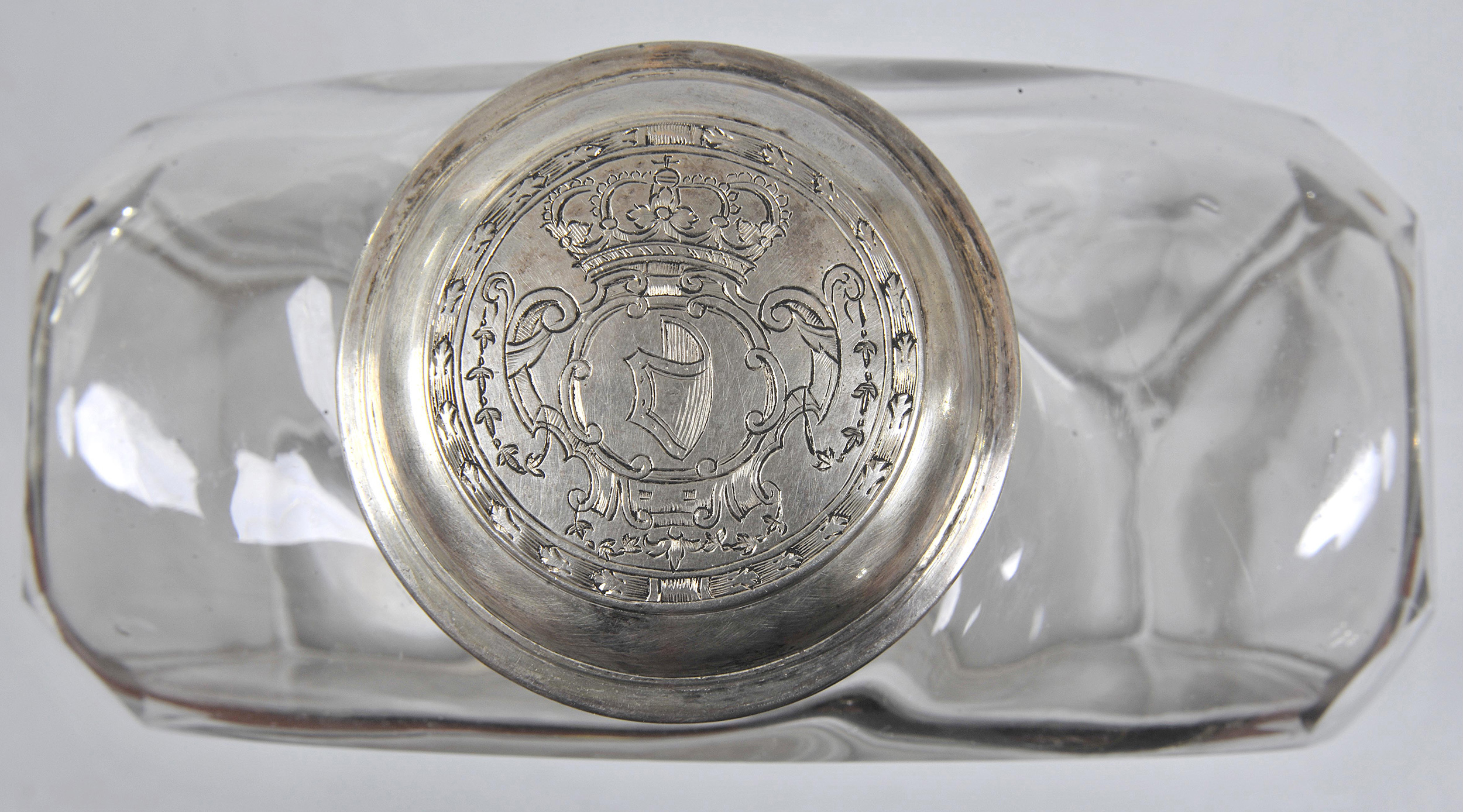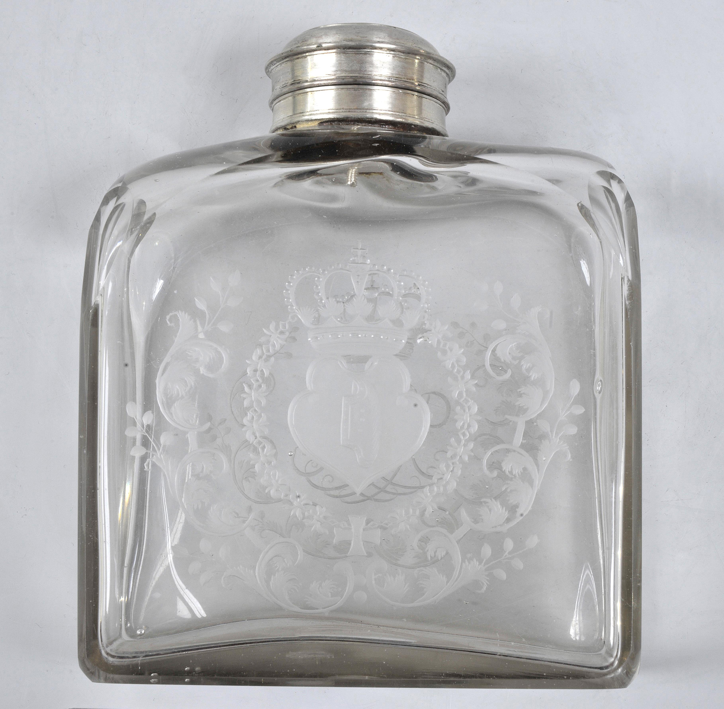 Prostopadłościenna flasza ze szkła przezroczystego o niskiej szyjce w srebrnej oprawie. W kolekcji wilanowskiej znajduje się komplet sześciu takich flasz (Wil.100-Wil.105). Główną ozdobę naczynia stanowi dekoracja rytowana matowo i przeźroczyście na obu szerszych ściankach. Po jednej stronie umieszczono pole w z herbem Janina pod koroną królewską, otacza je łańcuch orderu św. Ducha, a całość okala dodatkowo wieniec roślinny. Po drugiej stronie flaszy w analogicznym obramowaniu umieszczono monogram „CRP”. Na srebrnym obramieniu szyjki oraz korku butli wygrawerowano napis „N.3” (na wierzchu korka powtórzono herb Janina). Takie numery pojawiają się także na innych butlach z kompletu, świadczą one o pierwotnym pochodzeniu naczyń z dwóch różnych zestawów – trzy z nich są nieco wyższe i noszą numery 1-3, a trzy z nich niższe i ponumerowane 7-9.