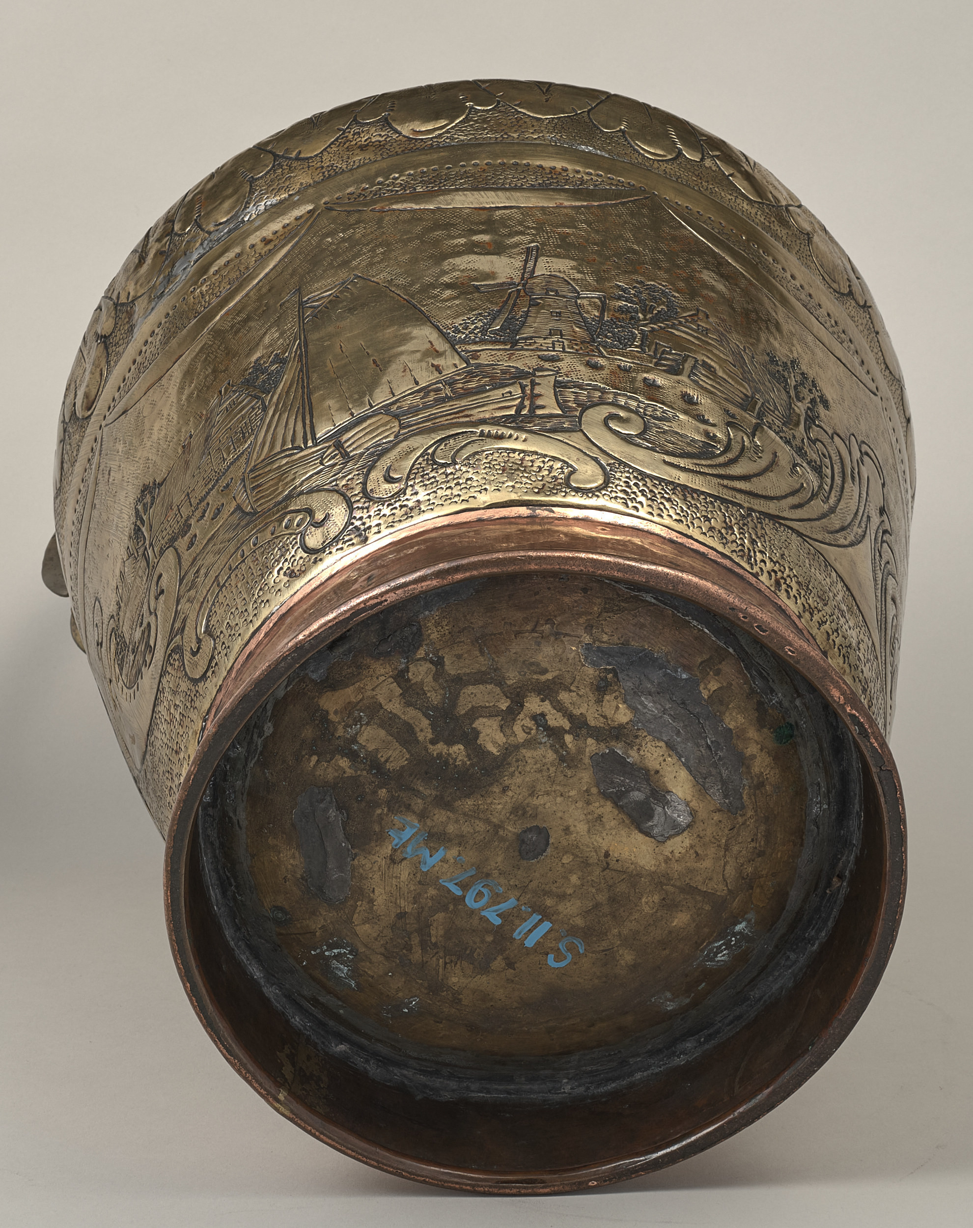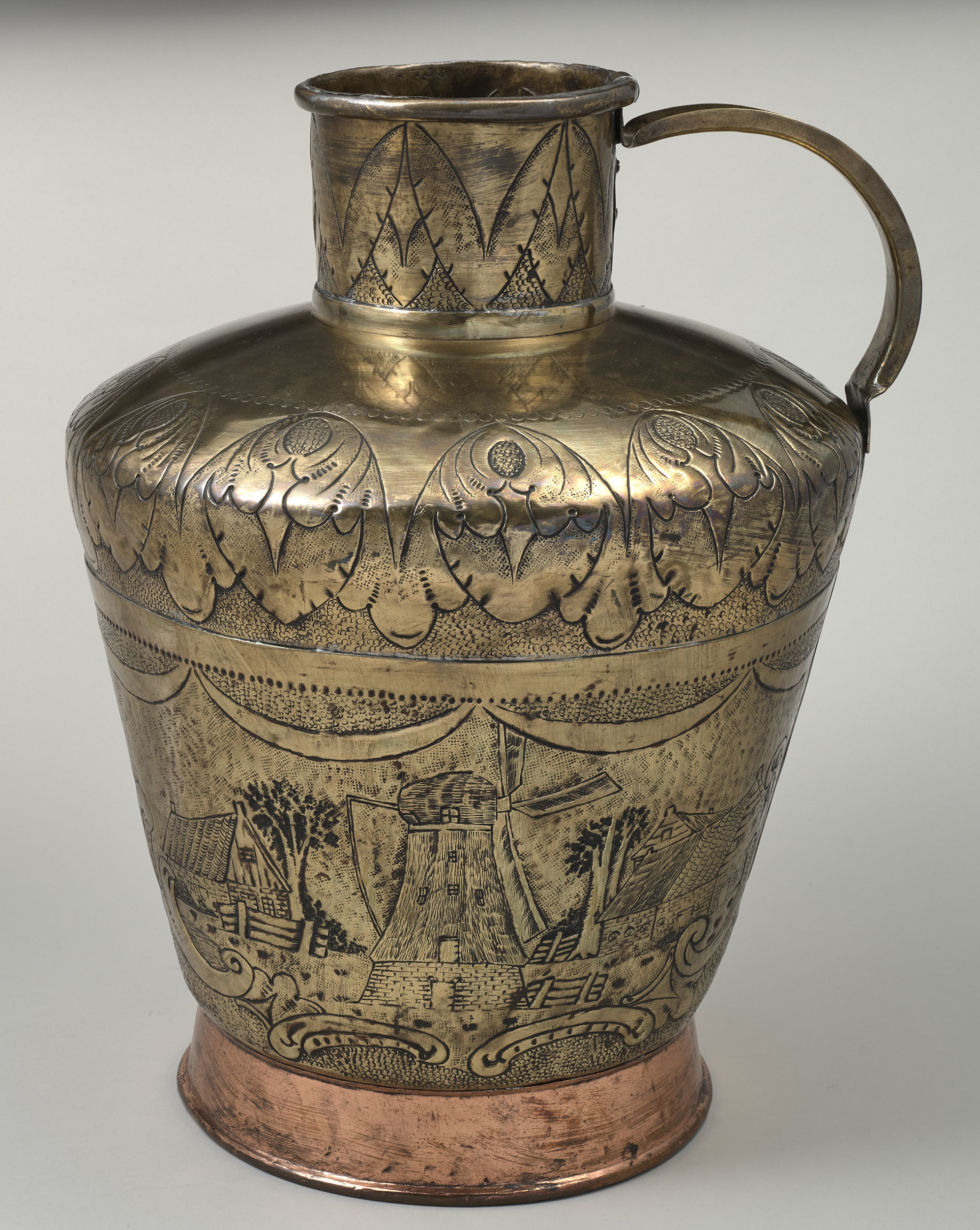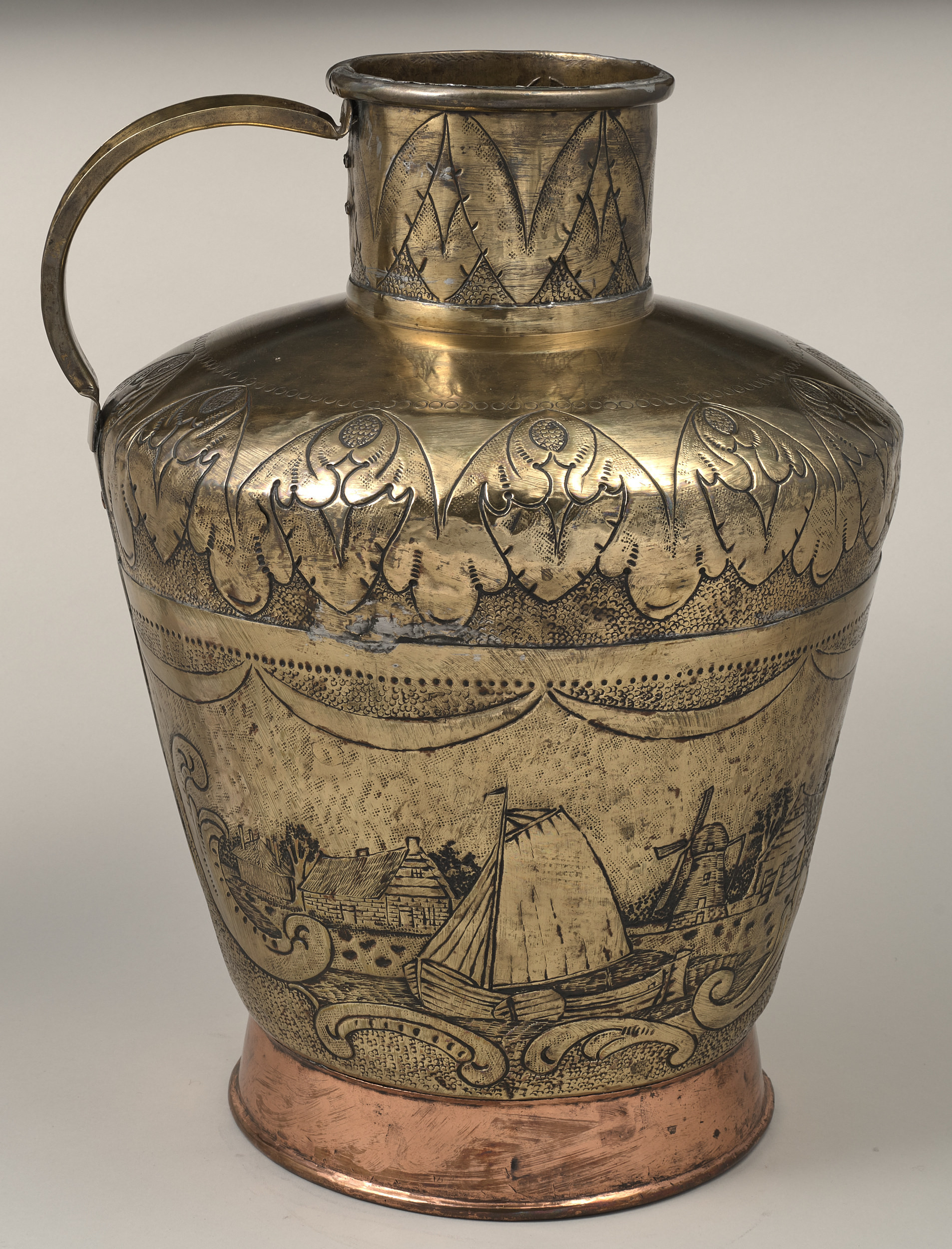Dzban duży z blachy miedzianej i mosiądzu, z kolekcji muzealnej, pochodzi z końca XIX wieku. Korpus dzbana w kształcie kielicha spoczywa na okrągłej, dość wysokiej podstawie rozszerzającej się ku dołowi Górą korpus zwęża się i przechodzi w cylindryczną szyję zakończoną pierścieniem. Z boku dzbana kabłąkowaty uchwyt, biegnący od szyi do najszerszego punktu korpusu. Szyja i górna część brzuśca zdobiona ornamentem z dużych lancetowatych liści. Pozostała część brzuśca dekorowana ornamentem wolutowym i krajobrazami wiejskimi (wiatraki, łodzie, budowle). Dzban eksponowany jest na Korytarzu Wschodnim II piętra, gdzie zgromadzone są wyroby (naczynia) z miedzi, będące w znacznej części pozostałościami po niezachowanych kuchniach zamkowych.