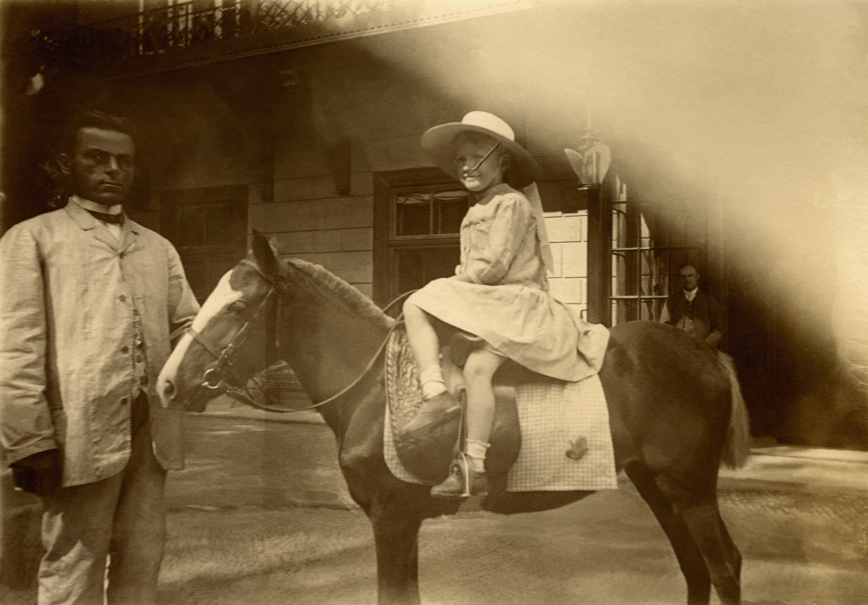 Helena Maria Sierakowska z Lubomirskich, była córką ostatniego ordynata przeworskiego Andrzeja Lubomirskiego. Fotografia przedstawia Helena jako kilkuletnia dziewczynkę siedzącą w damskim siodle na kucu, obok niej stoi pracownik ordynacji przeworskiej. Fotografia została wykonana nieopodal pałacu w Przeworsku. Kucyk na imię Figa.