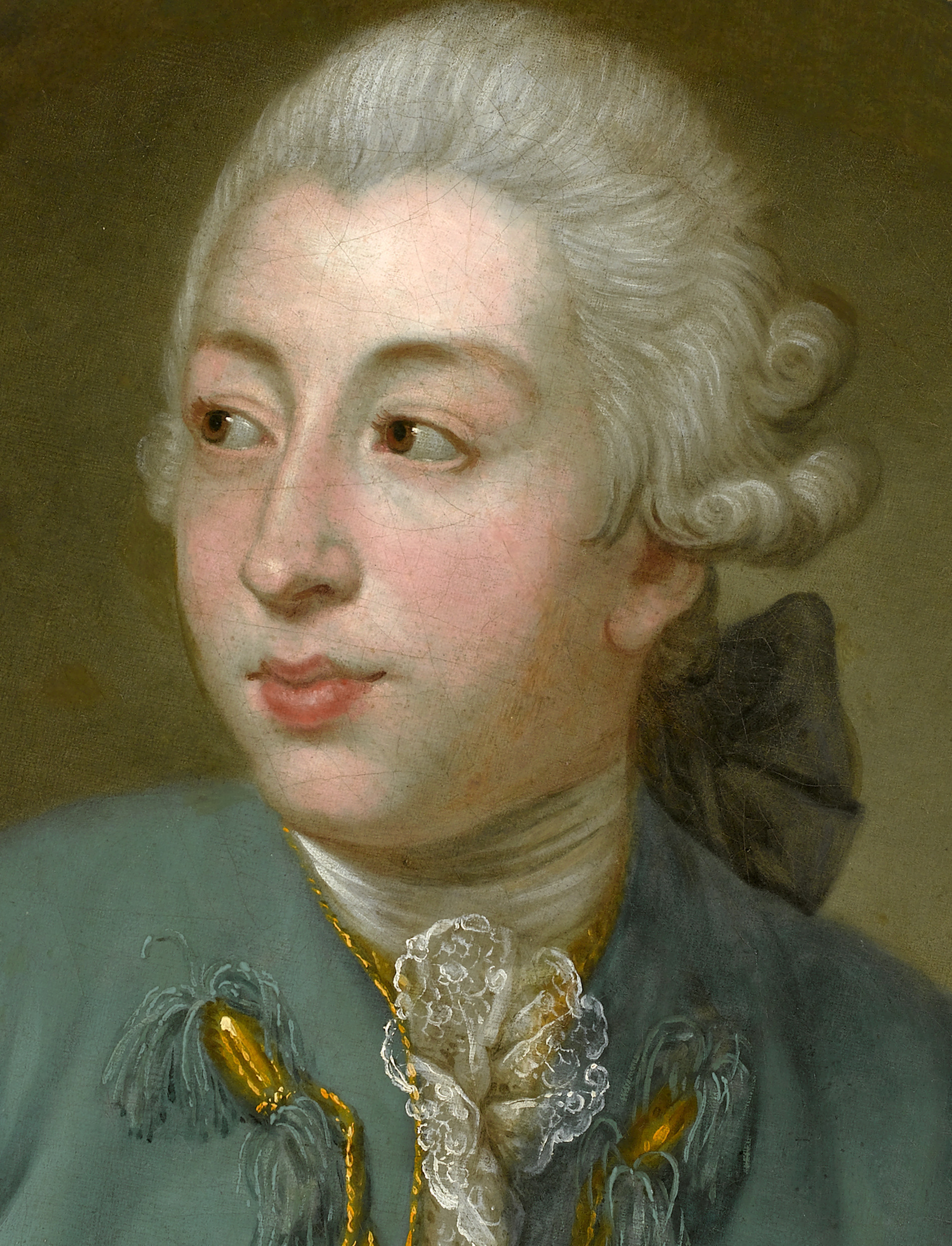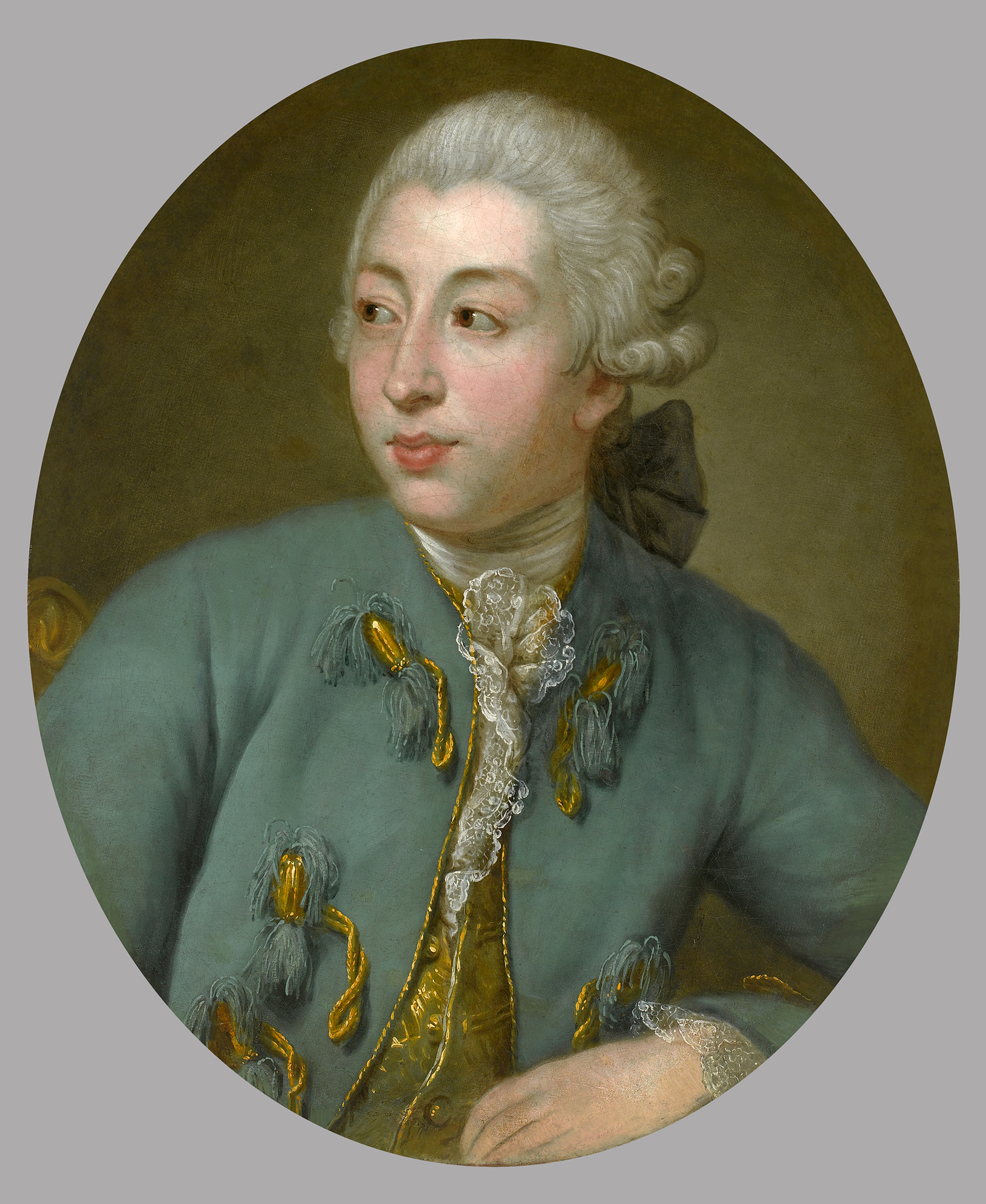 Pewny siebie, choć niezbyt urodziwy arystokrata pozuje dla potomnych. Ustawiony en face mężczyzna wspiera się na lewej ręce, a głowę zwraca w przeciwnym kierunku. Nosi pudrowaną perukę z harcapem przewiązanym znacznych rozmiarów czarną kokardą, która wystaje zza szyi. Zielony frak zdobią niedopięte złote pętlice z guzikami, pod brodą strojny muślinowy żabot z koronką, podobnie wykończone rękawy. Zwrócona ¾ do widza uróżowana twarz modnisia zastygła w oczekiwaniu, może zaciekawieniu.