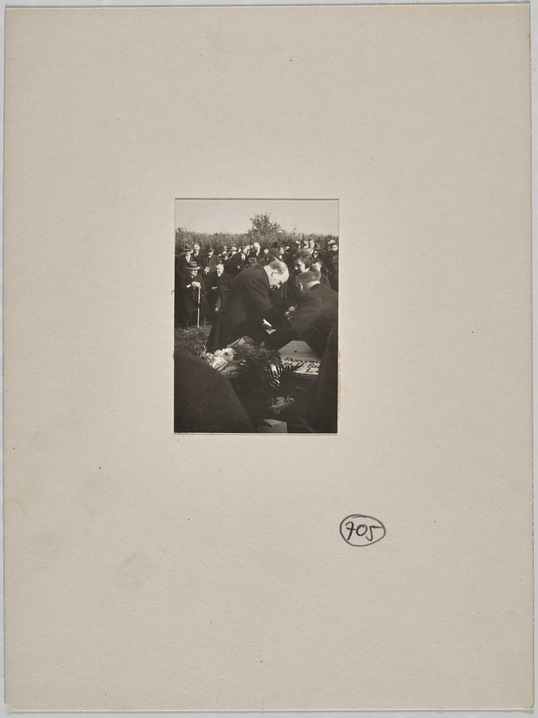 Fotografia zbiorowa przedstawiająca uroczystość związaną z Państwowym Liceum im. Henryka Sienkiewicza w Łańcucie odbywającą się na dziedzińcu szkolnym. Fotografia z lat 30. XX wieku. Na pierwszym planie widoczny Alfred Antoni Potocki IV, ordynat łańcucki nachylający się nad stołem wraz z niezidentyfikowanym mężczyzną. Na stole widoczny jest biały karton z napisem „ Państwo […] im H. Się […] w Ła […]”. Za ordynatem, widoczne dwie uczennice w beretach z godłem. W dalszym planie duże grono osób siedzących na krzesłach oraz stojących za siedzącymi.