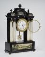 Reprezentacyjny zegar konsolowy w obudowie mającej kształt architektonicznej wolnej arkady dekorowanej masą perłową, flankowanej parami alabastrowych kolumn od góry połączonych uskokowym gzymsem zwieńczonym trzema kopułkami ze sterczynami. Pomiędzy kolumnami podwieszony jest mechanizm zegara z okrągłą emaliowaną tarczą i długim lekkim wahadłem. Arkada ustawiona jest na wysokim, prostym cokole dekorowanym malowanym olejno pejzażem Helenentals w Baden (Austria) z zamkiem Weilburg w tle, zbudowanym miedzy 1823 przez arcyksięcia Karola. W cokole wmontowana jest pozytywka.