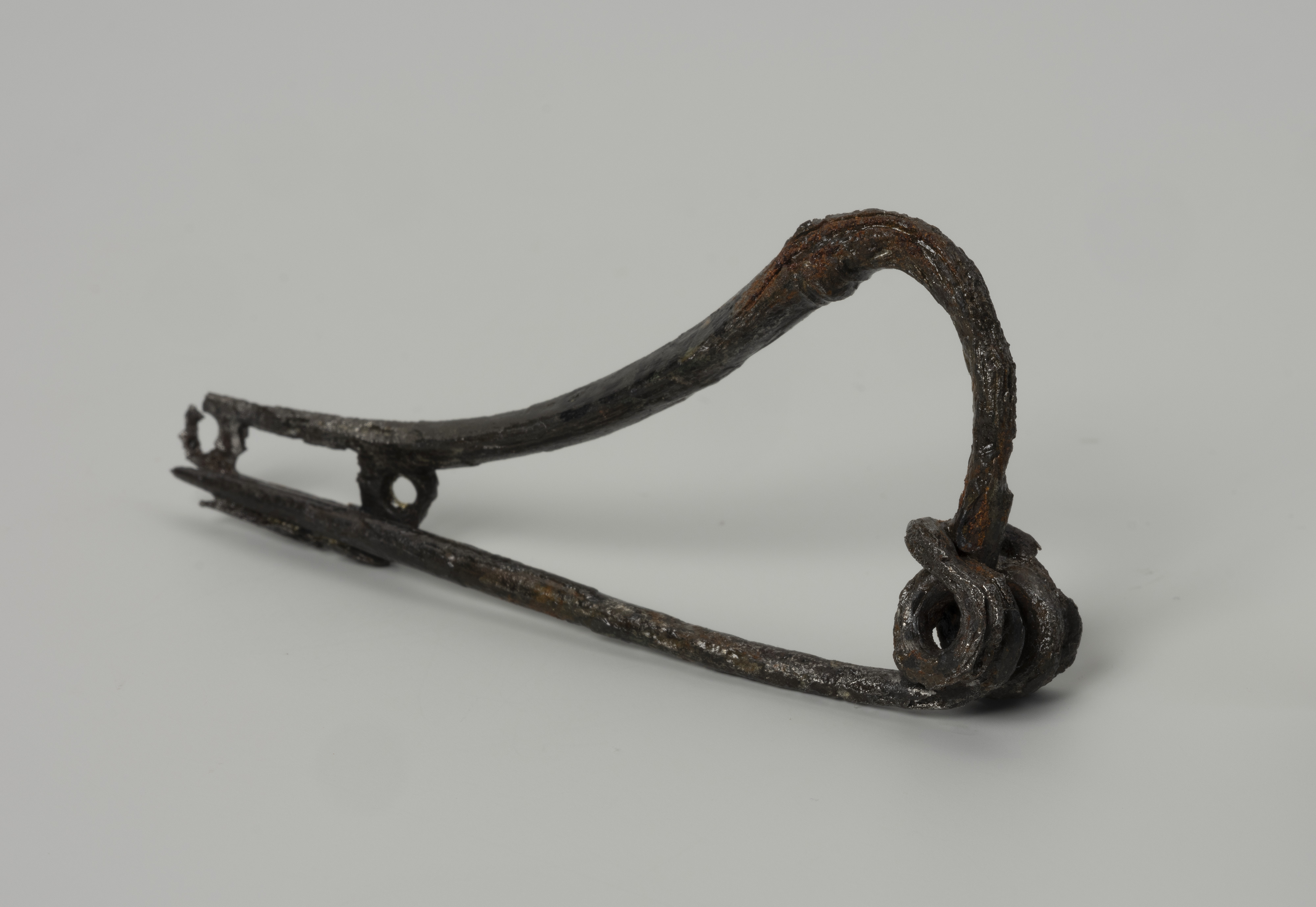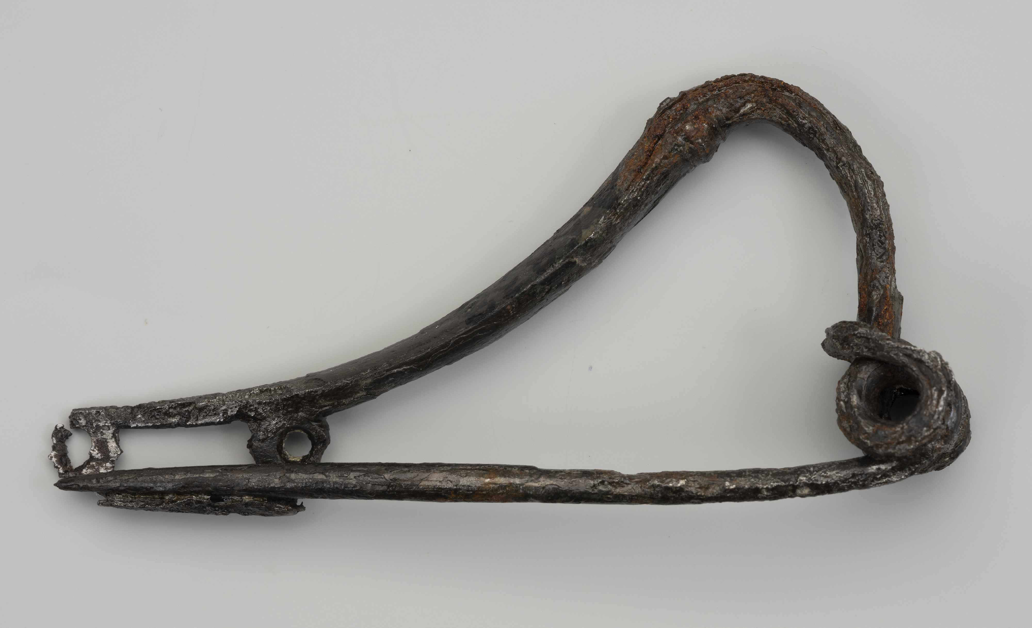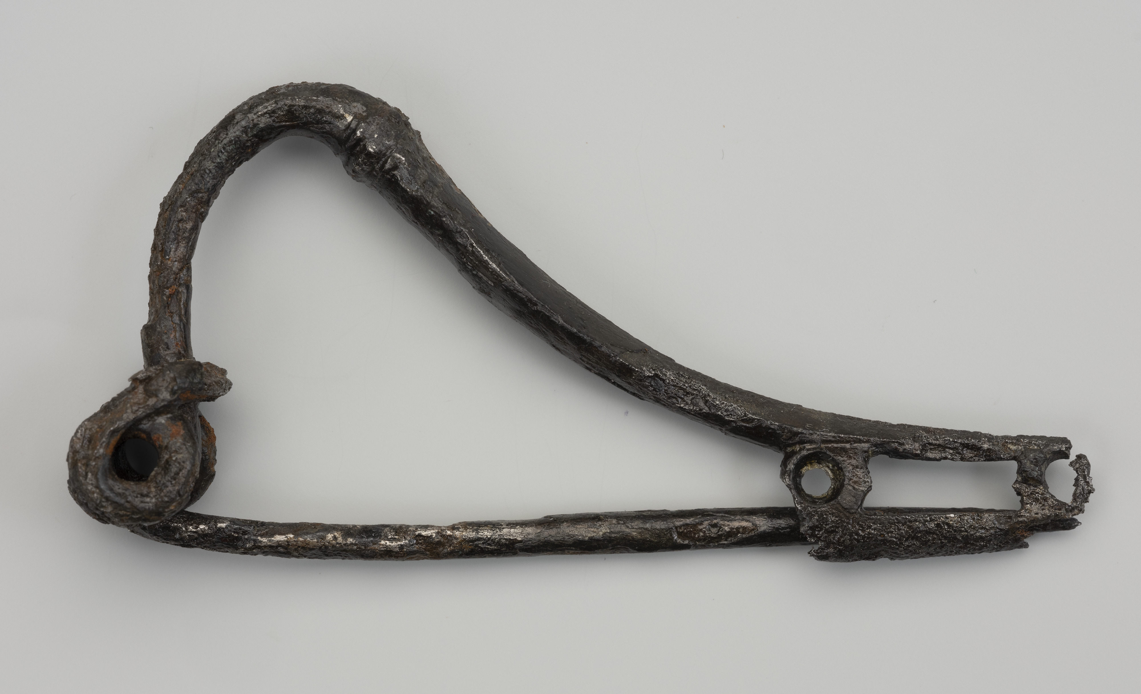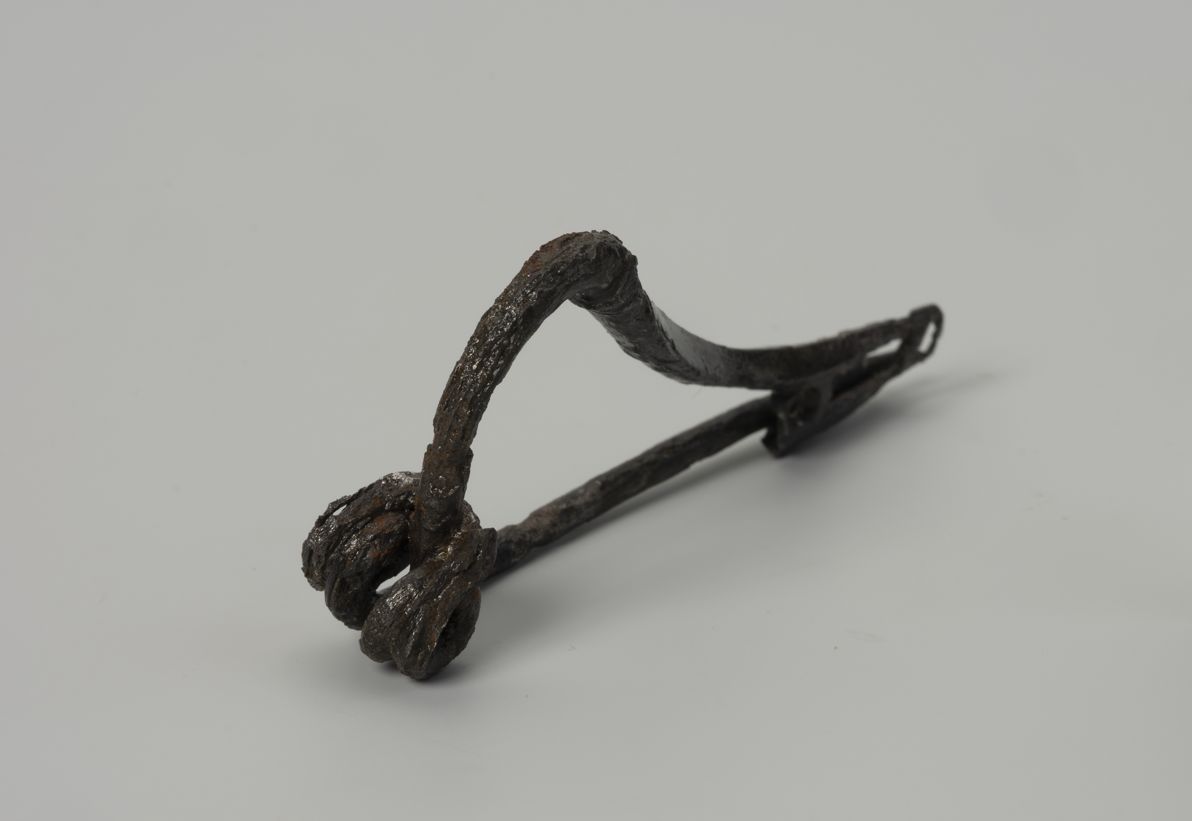Prezentowana, żelazna fibula posiadająca cechy wariantu N według typologii Józefa Kostrzewskiego (1885–1969) pochodzi ze zniszczonego grobu ciałopalnego na cmentarzysku w Drawsku Pomorskim. W archiwalnych dokumentach niemieckiego poprzednika Muzeum Narodowego w Szczecinie – Pommersches Landesmuseum in Stettin, dotyczących pierwszych tamtejszych odkryć, grób, w którym miała zostać zlokalizowana zapinka oznaczono numerem inwentarzowym 5944, bez nadania numeru obiektu archeologicznego. Poza prezentowaną zapinką do tego samego zespołu grobowego przyporządkowano jeszcze dwie inne fibule, w tym jedną podobną, które jednak zaginęły. Grób zawierać miał ponadto dwa naczynia i przęślik gliniany oraz fragment żelaznego sierpa. Jest jednak dość prawdopodobne, że zabytki przypisane do grobu 5944 pochodzą w rzeczywistości z kilku różnych zniszczonych pochówków ciałopalnych.