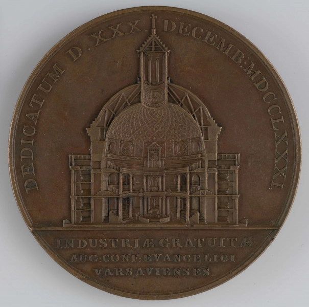 Jego awers zdobi popiersie architekta w prawym profilu, w peruce, we fraku i kamizelce oraz w halsbandzie i koronkowym żabocie, otoczone łacińską inskrypcją, w tłumaczeniu: „Szymon Amadeusz Zug architekt elektora saskiego”. Tytuł architekta elektora saskiego Zug otrzymał w 1772 roku. Na odwrocie widnieje nowatorski w ówczesnym medalierstwie pionowy przekrój budowli, we wnętrzu której są widoczne ołtarz, ambona, organy, galerie, wieńcząca kopułę latarnia oraz architektoniczne wiązania. Przedstawienie dopełnia treść w otoku: DEDICATUM D.XXX. DECEMB[ris]:MDCCLXXXI, w tłumaczeniu: „Poświęcona dnia 30 grudnia 1781” – oraz poziomy napis w odcinku: INDUSTRIAE GRATUITAE AUG[ustanae]:CONF[essinis] EVANGELICI VARSAVIENSES, w tłumaczeniu: „Za bezinteresowną działalność ewangelicy warszawscy wyznania augsburskiego”.