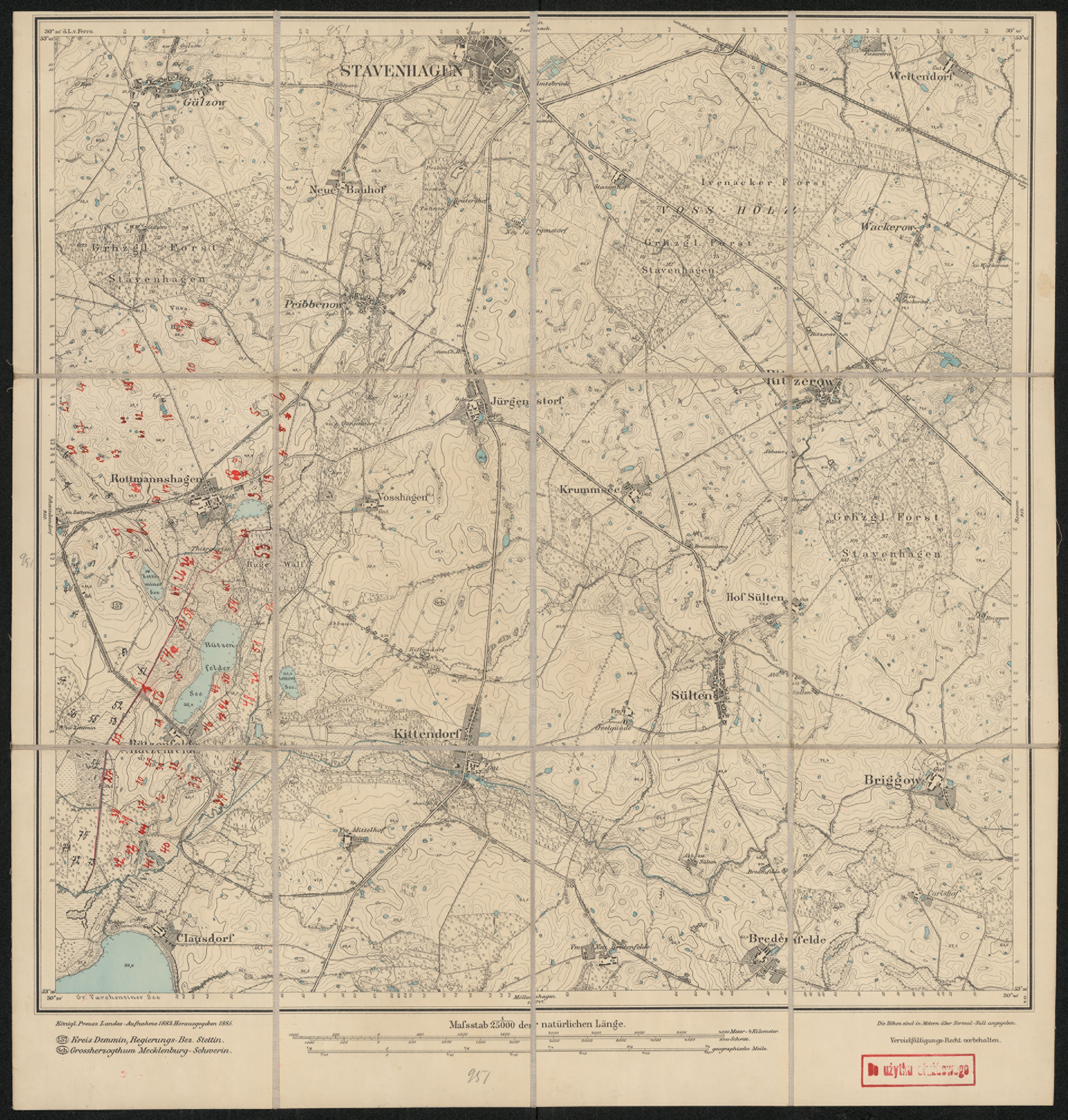 Mapę 951 Stavenhagen I opracowano w 1883, a wydano w 1885 roku. Obejmuje obszar w pobliżu miejscowości Stavenhagen, Kreis Demmin, Reg. Bez. Stettin, Prov. Pommern, dziś Kreis Mecklenburgische Seenplatte, Bundesland Mecklenburg-Vorpommern, Niemcy. Jest jedynym zachowanym egzemplarzem arkusza przedwojennej mapy topograficznej oznaczonego godłem 951, zawierającym dane o lokalizacji obiektów i ich nazw w zasobie archiwalnym Flurnamen Sammlung. Na drukowanej mapie ręcznie naniesiono warstwę z numeracją obiektów fizjograficznych odnoszących się do miejscowości: Rottmannshagen, Rützenfelde.