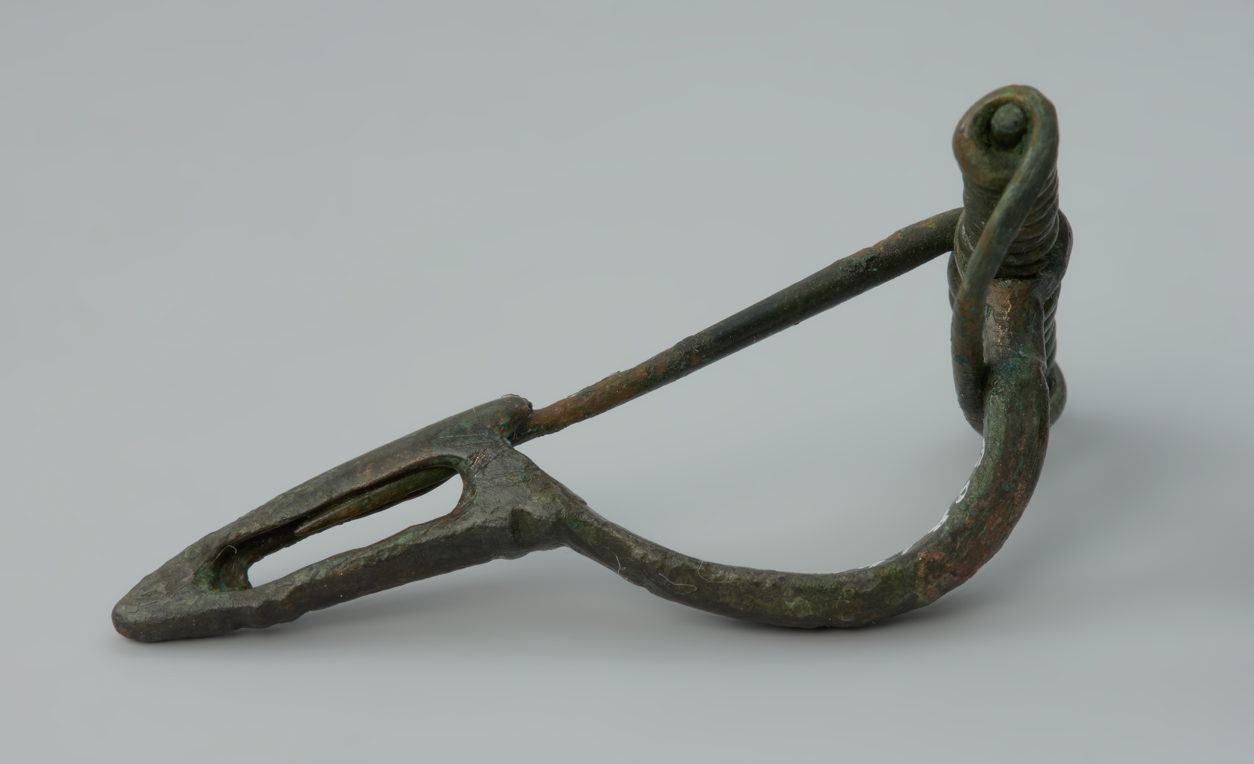 Zapinki są bardzo zróżnicowaną grupą ozdób. Dzielą się na wiele wariantów w zależności od konstrukcji, ornamentyki czy gatunku metalu, z którego je wykonano. Fibule różnych typów użytkowane były w określonych przedziałach czasowych. Prezentowana zapinka należy do typu z podwiniętym na końcu kabłąkiem przechodzącym bezpośrednio w tzw. stopkę, czyli zaczep do szpili. Elementy konstrukcji wskazują na III wiek. Uwagę zwraca szeroka sprężynka o wielu zwojach oraz okazała cięciwa przechodząca pod nieco rozszerzonym kabłąkiem. Wizualnie przypomina kuszę, dlatego w archeologii okresu rzymskiego fibule tego typu określane są jako „kuszowate”. Zapinka stanowiła element wyposażenia jednego z grobów szkieletowych z okresu wpływów rzymskich, odkrytych w 1890 roku na terenie parku dworskiego w Redlu. Ze skąpych danych archiwalnych wynika, że jeden z odkrytych pochówków zawierał dwa szkielety. Do naszych czasów zachowały się dwie kolejne zapinki z brązu, w tym jedna kuszowata, zapinka ze srebra, grzebień kościany oraz paciorki bursztynowe, szklane i emaliowane.
