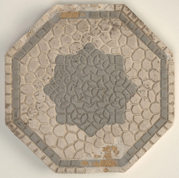 Sześciokątna płytka ceramiczna. Płytka nieszkliwiona. Na licu widoczny dwubarwny wzór (w kolorach beżu i szaroniebieskim). W centralnym punkcie znajduje się szaroniebieska sześcioramienna gwiazda. Wzdłuż krawędzi biegnie szaroniebieski pas. Cała powierzchnia płytki pokryta jest przestrzennym, nierównomiernym wzorem naśladującym spękania. Na odwrocie w części centralnej widoczny jest znak producenta w postaci sześcioramiennej gwiazdy.