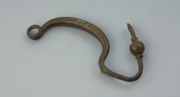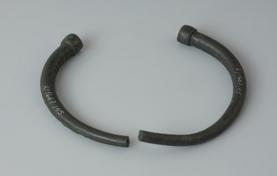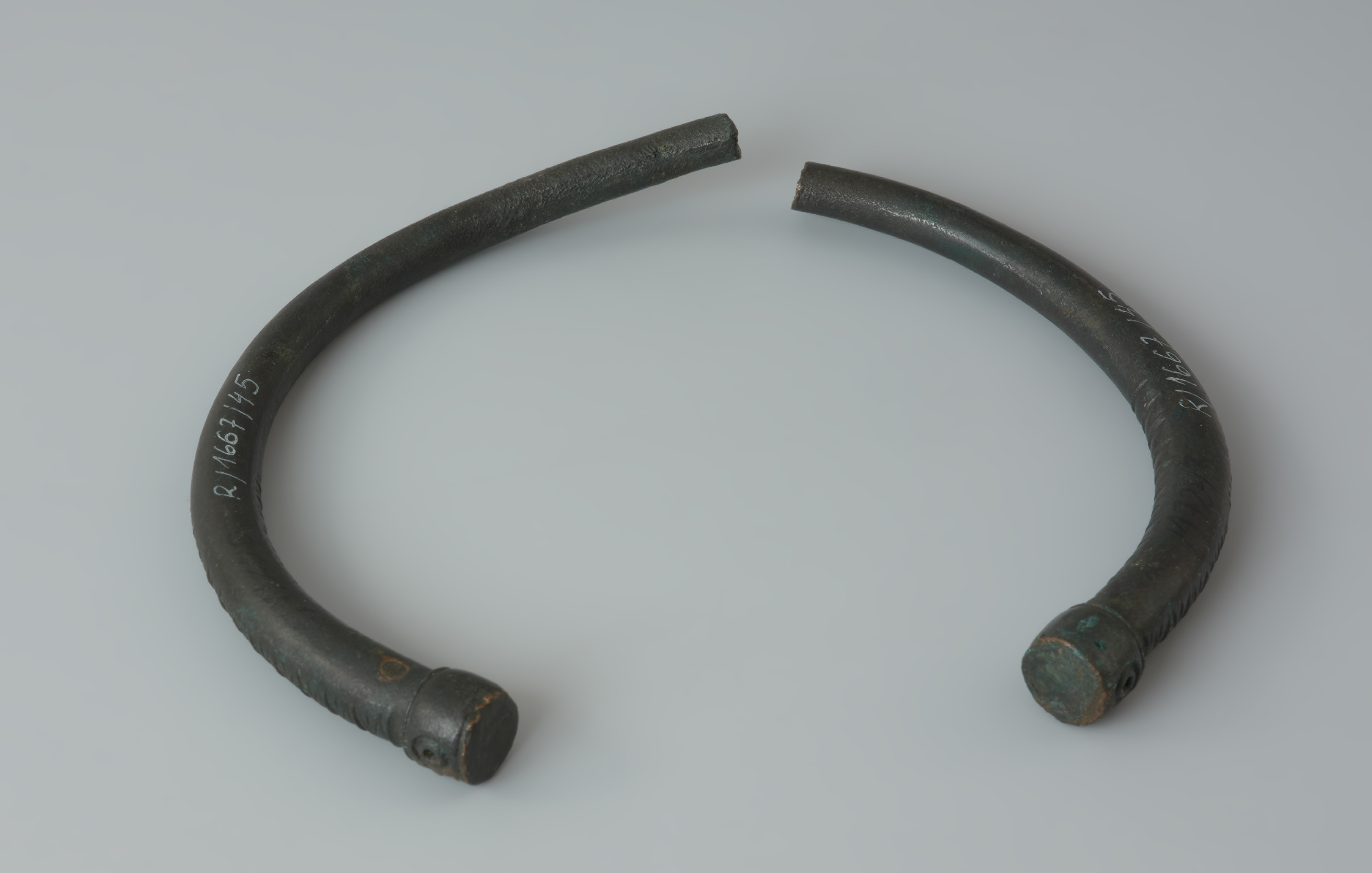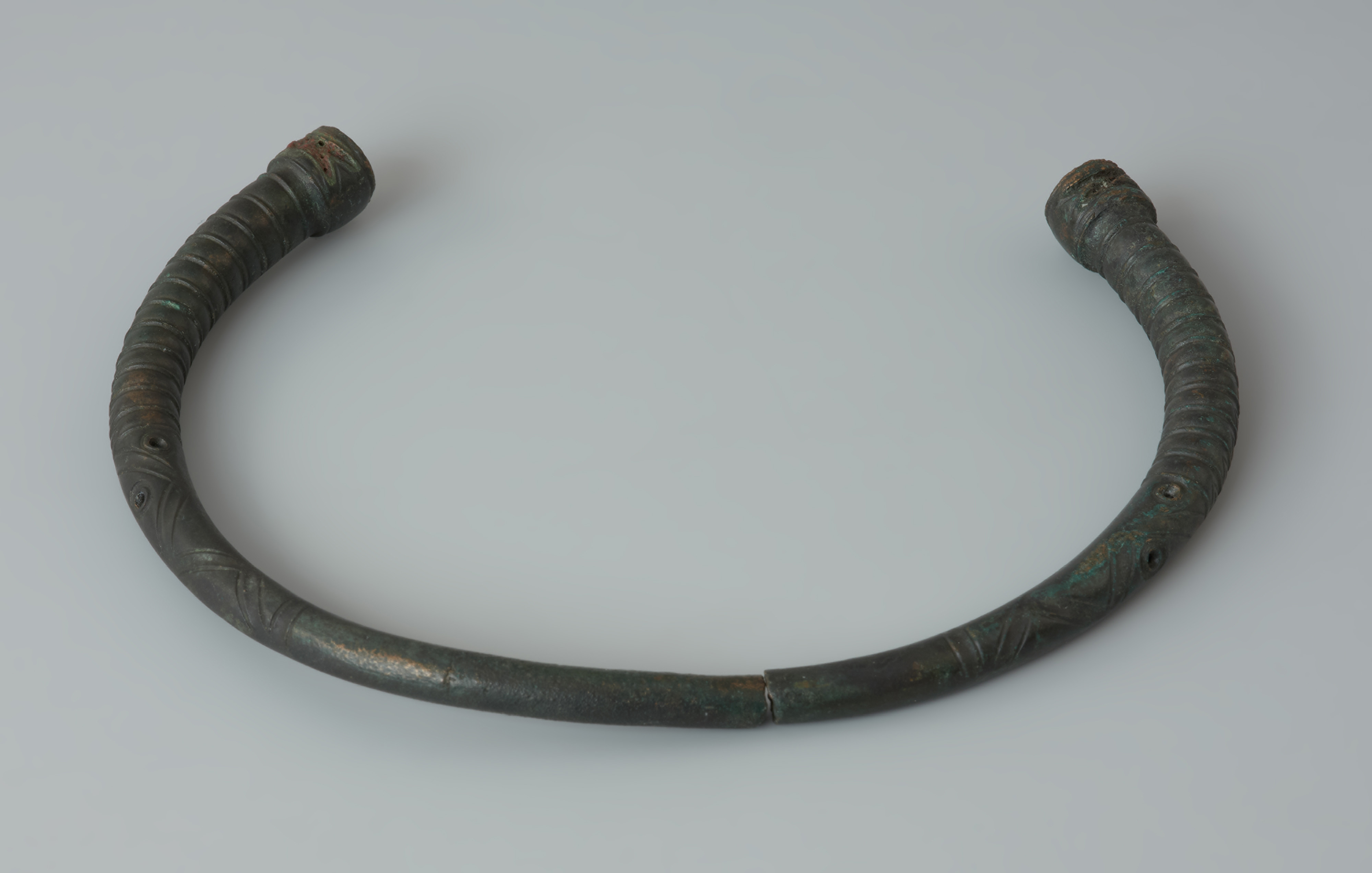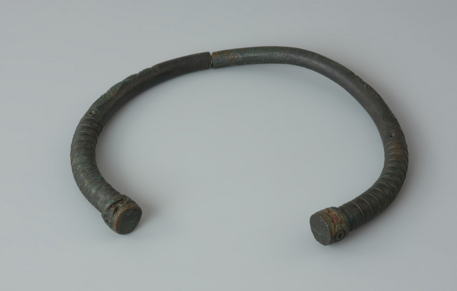 Naszyjnik z brązu z krótkimi cylindrycznymi zakończeniami i zdobieniem od strony zewnętrznej zachował się w dwóch częściach. Reprezentuje jedną z kilku odmian tych ozdób szyi o zróżnicowanych kształtach zakończeń. Począwszy od III wieku p.n.e. germańscy mieszkańcy Pomorza Zachodniego zaczęli stosować ozdoby, w tym naszyjniki i fibule do spinania odzieży, charakterystyczne dla ludności celtyckiej, zamieszkującej wówczas południowe Niemcy i Słowację. Zjawisko to określone zostało mianem „latenizacji”, czyli przejmowania niektórych elementów kultury celtyckiej przez ludność innego pochodzenia. W tym czasie Pomorze Zachodnie było objęte osadnictwem kultury jastorfskiej o całkowicie odmiennej obrzędowości i formach przedmiotów użytkowych niż w kulturze lateńskiej. Na przykład na cmentarzyskach jastorfskich nie ma typowych dla kultury lateńskiej grobów męskich wyposażonych w broń. Szczegóły na temat odkrycia prezentowanego naszyjnika nie zachowały się w archiwaliach. Wiadomo jedynie, że został odkryty przypadkowo w 1922 roku na terenie żwirowni w Tarnówku, pow. goleniowski. Był elementem wyposażenia ciałopalnego grobu popielnicowego nakrytego kamieniem, który na podstawie cech konstrukcyjnych i wyposażenia można wiązać z obrzędowością ludności kultury jastorfskiej.