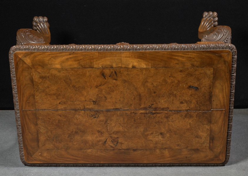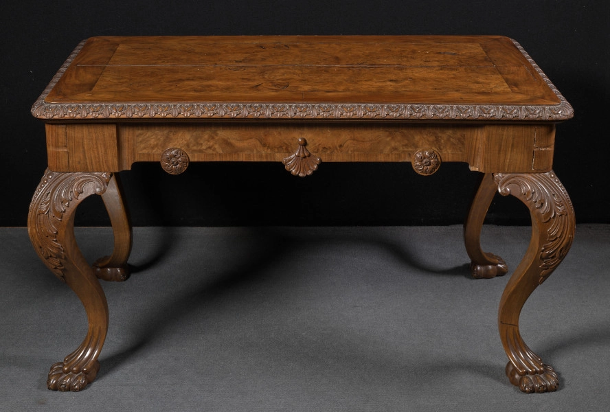 Niski, prostokątny stolik w typie angielskim, naśladujący elementy mebli angielskich z ok. 1740 r. Każdy z odpowiadających sobie boków stolika wykonany identycznie. Nogi wygięte, tzw. „cabriole legs”, o czterech wyraźnych kantach, zakończone u dołu formą rozpłaszczonej łapy zwierzęcej. Oskrzynienie proste o zaokrąglonych narożnikach, nad nogami lekko wysunięte. Na środku każdego boku niewielki rzeźbiony motyw, jakby odwróconego w dół wachlarza. Na dłuższych bokach dodatkowo po dwie symetrycznie ułożone rozetki w kole. Blat o zdwojonej płycie. Górna - niska, gładka, dolna - wysunięta, ozdobiona rzeźbionym ornamentem roślinnym. Podobnie nogi rzeźbione u nasady w motywy roślinne i perełki. Blat i oskrzynienie fornirowane jasnym orzechem. Na spodzie blatu fornir mahoniowy. Górną część blatu zdobi duża, prostokątna płycina z forniru w plamki z czeczoty brzozowej. Na cofniętych, środkowych częściach oskrzynienia prostokątne płyciny z podobnego forniru z czeczoty brzozowej.