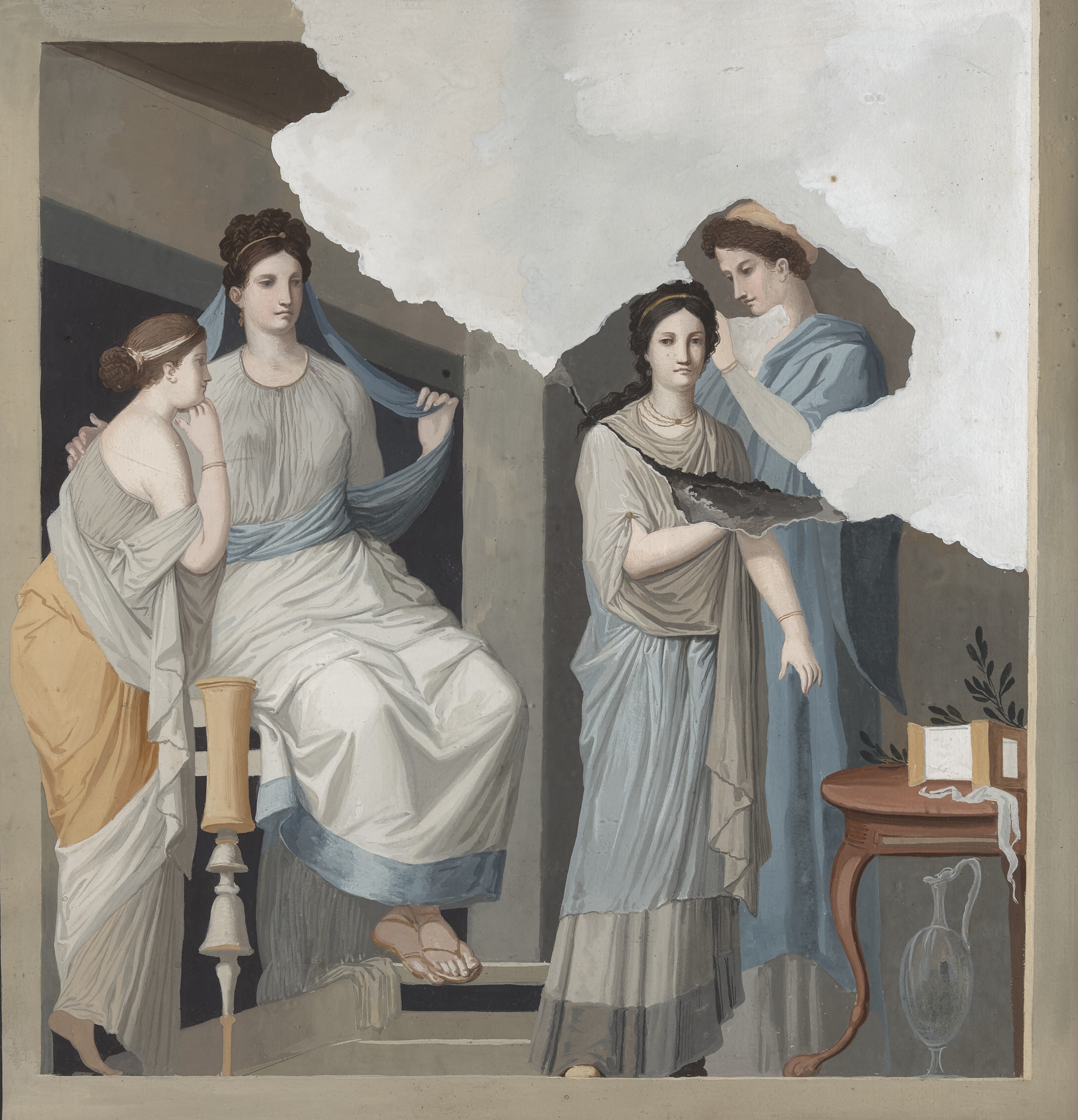 Obrazek z dawnej kolekcji Potockich, nieznanego malarza z XIX w przedstawia scenkę rodzajową – cztery kobiety poprawiające sobie nawzajem stroje i fryzury w antycznym wnętrzu, obok nich na stoliku owalne lustro i drobiazgi „kobiece”. W obrazku brak dużego fragmentu po stronie prawej u góry. Jest to kopia malowidła odkrytego w jednym z domów zalanego lawą i zasypanego popiołem wulkanicznym Herculanum. Wybuch wulkanu Wezuwiusz miał miejsce w 79 r, a oba zasypane miasta czyli Pompeje i Herculanum zostały odkryte w 80 –tych latach XVIII w i odtąd malarstwo nazywane pompejańskim stało się bardzo popularne wśród arystokracji hołdującej modzie. Wyróżniono cztery style malarstwa pompejańskiego. Oczywiście, niejako ”poza tymi stylami” rozwijało się malarstwo przedstawiające martwe natury zdobiące sale jadalne, a złożone z ptaków, owoców, ryb czy naczyń z wodą. Oprócz tego spotyka się malowane wprost na ścianach portrety przedstawiające mieszkańców domu. Łańcucki obrazek zamówiony przez księżnę marszałkową Lubomirską zdobi Apartament Chiński na I p zamku, a właściwie pokój pompejański, czyli salonik w tym apartamencie.