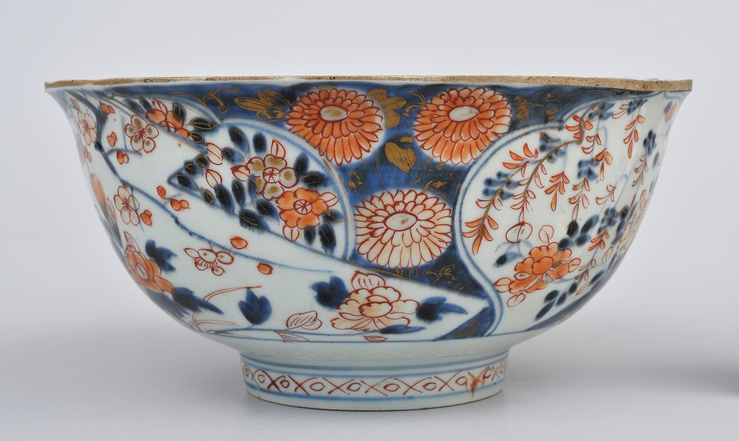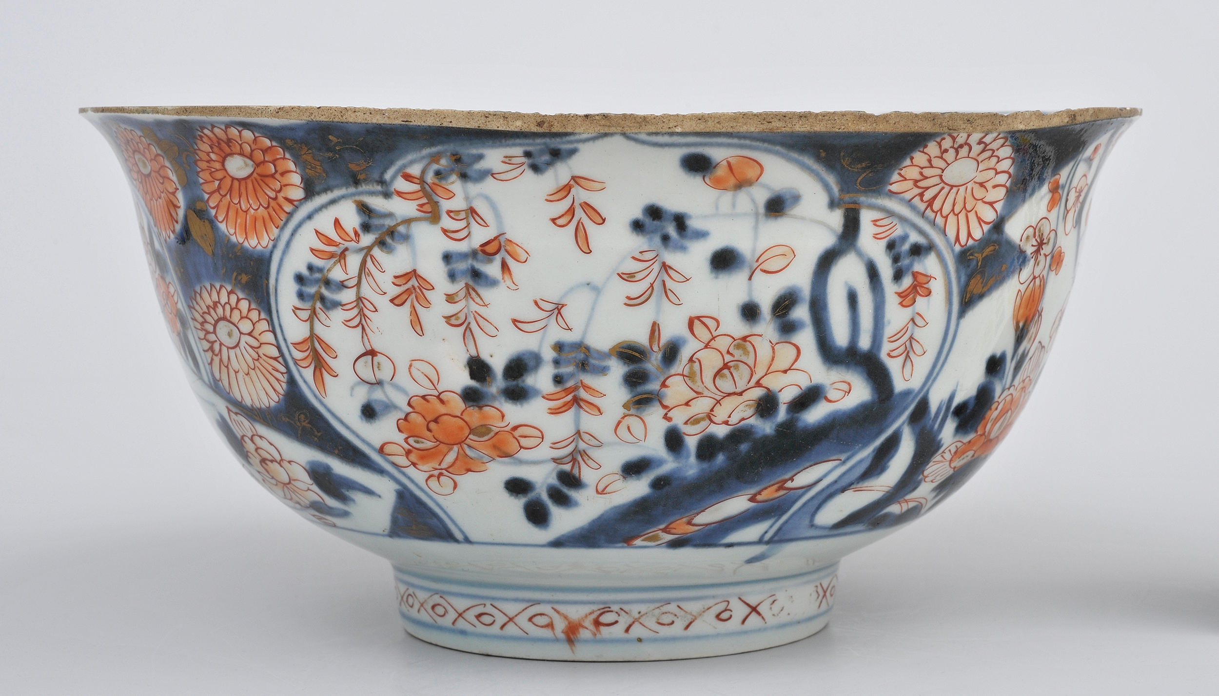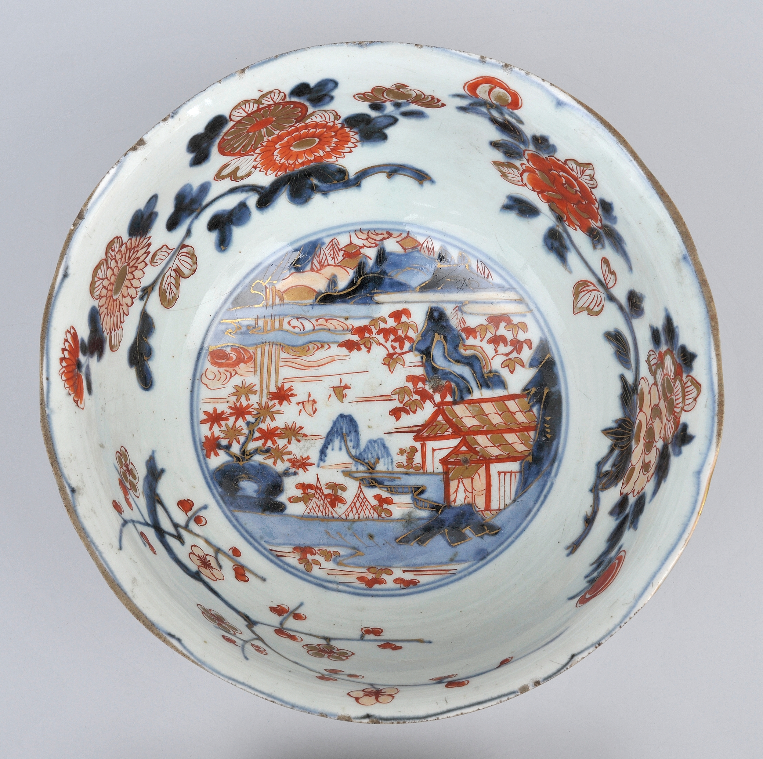 Głęboka, okrągła misa na niskiej stopce, z delikatnie wywiniętą krawędzią wylewu. Ciemny kobalt dekoracji zewnętrznej naczynia został wzbogacony motywami kwiatowymi i rezerwami, czyli polami wyodrębnionymi krawędzią, wypełnionymi zdobieniami. Kobaltowe tło misy zdobią kwiaty chryzantemy i złote liście – częściowo starte, ze względu na stosunkowo nietrwałą technikę złocenia naszkliwnego. Rezerwy wypełniają motywy m.in. peonii i ukwieconych gałązek wiśni. Na dekorację wewnętrzną misy składają się trzy kompozycje kwiatowe – z chryzantemami, peoniami i wiśnią. Lustro naczynia wypełnia sceneria o charakterze pejzażowo-architektonicznym.