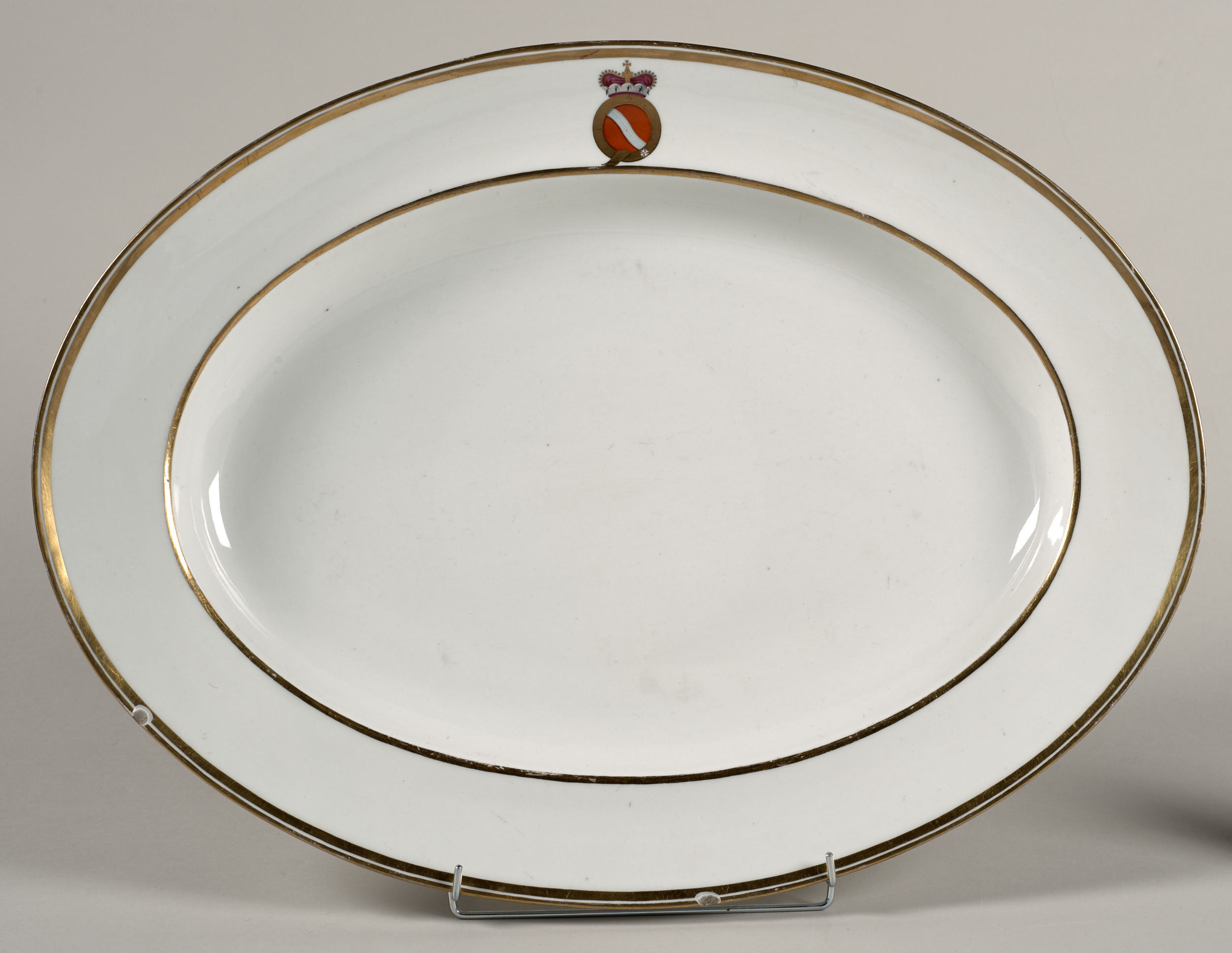 Półmisek serwisowy z herbem Lubomirskich Szreniawa. Półmisek z serwisu obiadowego w stylu klasycystycznym wykonanym w manufakturze porcelany w Wiedniu około 1806-1807 r. Wytwórnia ta powstała w 1718 r. jako druga w Europie, po Miśni, manufaktura porcelany, działała do 1864 r. Serwisy obiadowe, śniadaniowe, do herbaty, kawy i czekolady stanowiły zasadniczą część produkcji wiedeńskiej wytwórni, zwłaszcza od 4 ćw. XVIII w. Półmisek został zakupiony przez muzeum w Łańcucie w 1982 r. wraz z innymi naczyniami należącymi do serwisu obiadowego. Powyższy półmisek jest owalny, głęboki, zdobiony złotymi paskami. Na kołnierzu malowany herb Lubomirskich Szreniawa z krzyżęm maltańskim. Zapewne serwis, którego część stanowiły zakupione przez muzeum naczynia należał do Henryka Lubomirskiego (1777-1850), który był wychowankiem księżny Izabeli Lubomirskiej (1736-1816), właścicielki łańcuckiego zamku. Monogram wiązany HL namalowany jest czarną farbą na spodzie niektórych naczyń tego serwisu. Henryk Lubomirski był kawalerem maltańskim od 1796 r.