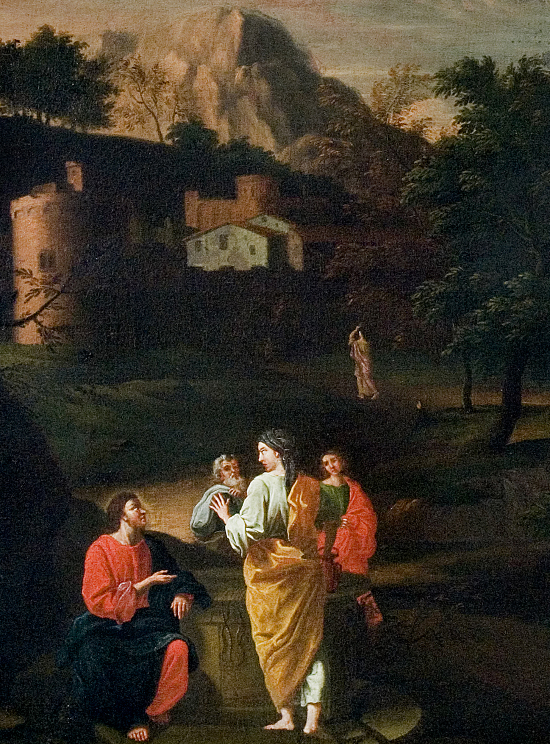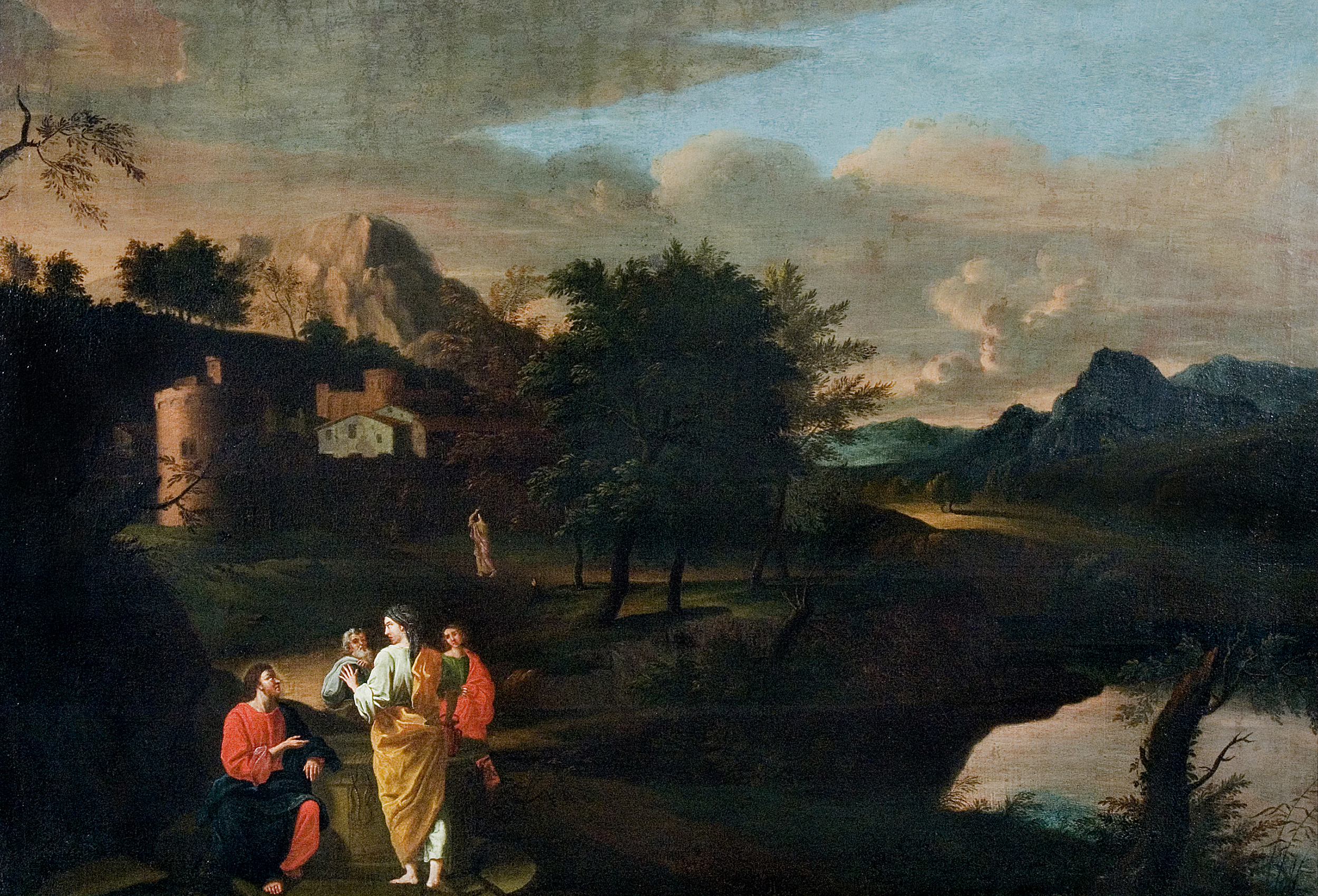 Obraz powstał w kręgu Nicolasa Poussina, być może wyszedł spod pędzla Gaspara Dugheta zw. Poussin. Był on wpływowym pejzażystą mieszkającym w Rzymie, którego inspiracją był jego szwagier Nicholas Poussin, którego imię przyjął, oraz Claude Lorraine. Ci trzej malarze szkicowali razem przemierzając obszary podmiejskie i wiejskie wokół Rzymu. Dughet wzorem starszych kolegów wykorzystywał rysunki wykonane z natury jako podstawę swoich wyidealizowanych scen malowanych w pracowni lub jako freski dekoracji pałaców rzymskich. Kontekst ten sprawia, że – przy świadomości istnienia jednego jeszcze malarza z rodziny podpisującego się „Poussin” – bardzo trudno dziś rozgraniczyć zakresy wpływów i przypisać te przepiękne krajobrazy za całą pewnością któremuś z malarzy. Jest co prawda element różnicujący malarzy Dugheta – rzadko wplatał w swe krajobrazy epizody historyczne, biblijne czy mitologiczne. Pojawiają się tu zatem wątpliwości, gdyż mamy sztafaż biblijny: przypowieśc o Chrystusie i Samarytance. Wiele obrazów Dugheta zostało zakupionych podczas ery Grand Tour w XVIII w. przez brytyjskich turystów. Kilka obrazów z tego kręgu znalazło się także w zbiorach Izabeli Lubomirskiej i Stanisława Kostki Potockiego.