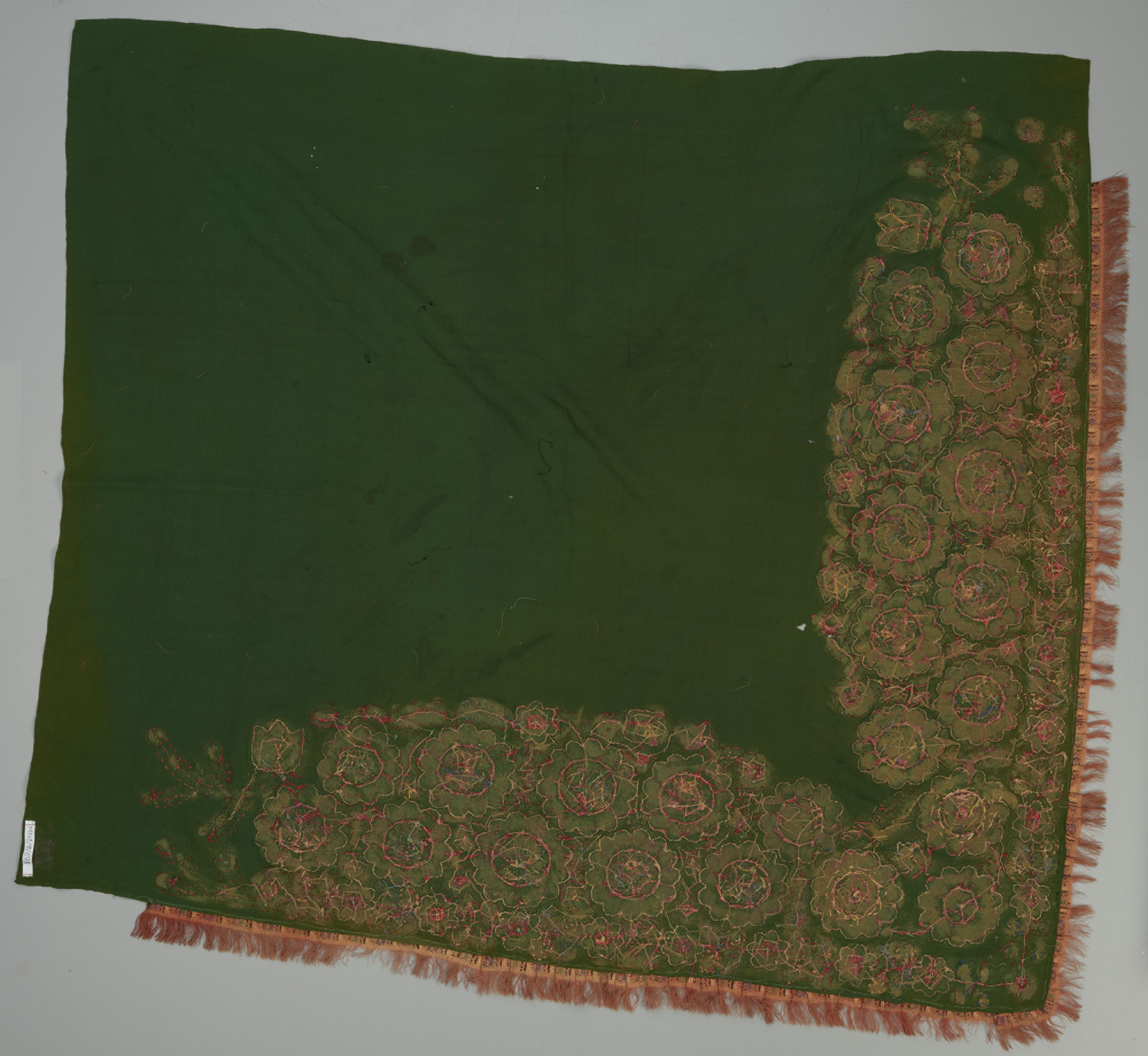 Chusta naramienna jest elementem pyrzyckiego stroju ludowego. Wykonana z cienkiej, wełnianej tkaniny koloru zielonego zdobiona jest różnokolorowym haftem płaskim kładzionym o motywach kwiatowych, z dominacją czerwieni. Umieszczony w rogu delikatny haft z napisem „Constantine Plath” oraz data „1866” wskazują na prawdopodobne personalia właścicielki i datę powstania chusty. Jej zielony kolor to informacja, że była to młoda, niezamężna kobieta, a bogactwo haftu, zastosowanie do jego podkreślenia złotego sznureczka i cekinów oraz lamówki z frędzlami świadczą o jej dobrej sytuacji materialnej. Bogato zdobiona chusta jest elementem odświętnego ubioru, którego zakup, nawet dla osób zamożnych, był wyzwaniem finansowym. Strój stanowił swoistą lokatę kapitału i często w całości lub częściowo przechodził z pokolenia na pokolenie. Chusta jest wyszywana tylko po jednej stronie, co wskazuje na dobrą sytuację materialną osoby ją noszącej. Tkanina na chusty z cienkiej wełny (w XIX wieku z fabrycznego kaszmiru) była droga. Uboższe pyrzyczanki haftowały chusty na całej ich powierzchni. Oszczędzając na materiale, na jednej połowie wykonywały haft „czerwony” do „wesołych” uroczystości, na drugiej połowie w hafcie dominował żałobny kolor niebieski. Gdy zaszła potrzeba składały chustę tą stroną do wierzchu, która odpowiadała zaistniałej sytuacji. Chusta pochodzi z lat sześćdziesiątych XIX wieku, czyli z okresu największego rozkwitu pyrzyckiego ubioru ludowego.