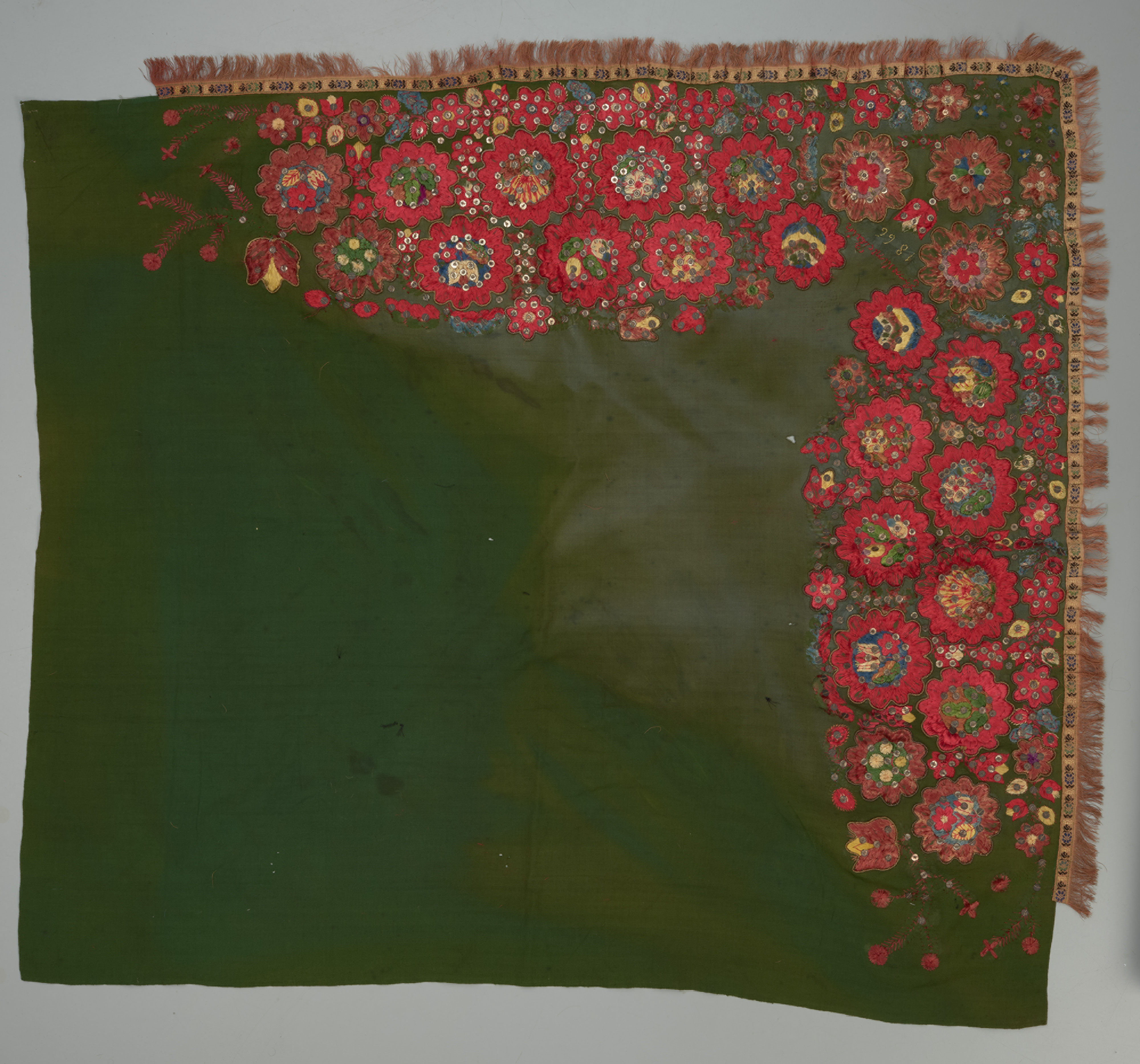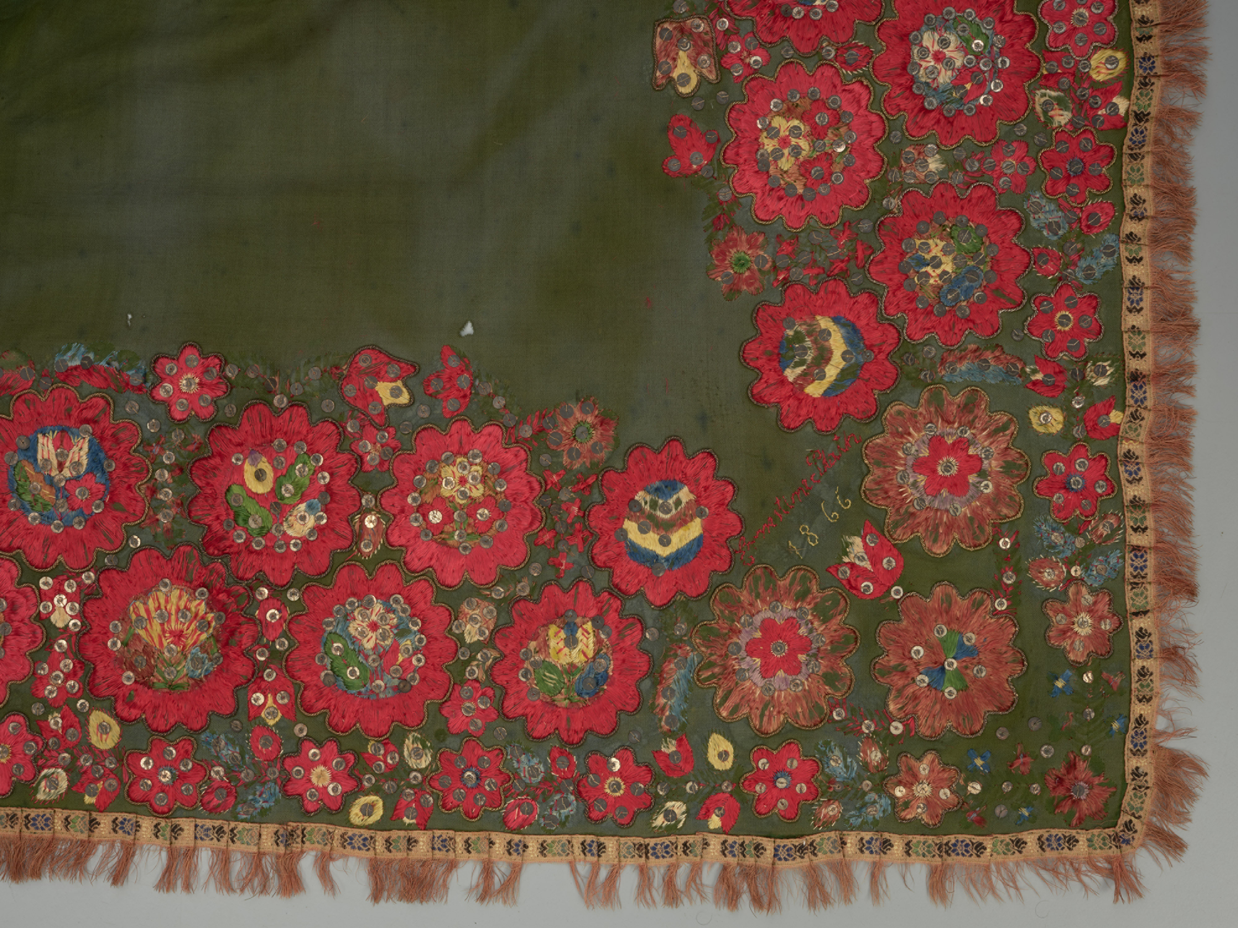 haft płaski kładziony, taśma pasmanteryjna, szych, cekiny, kordonek, tkanina wełniana