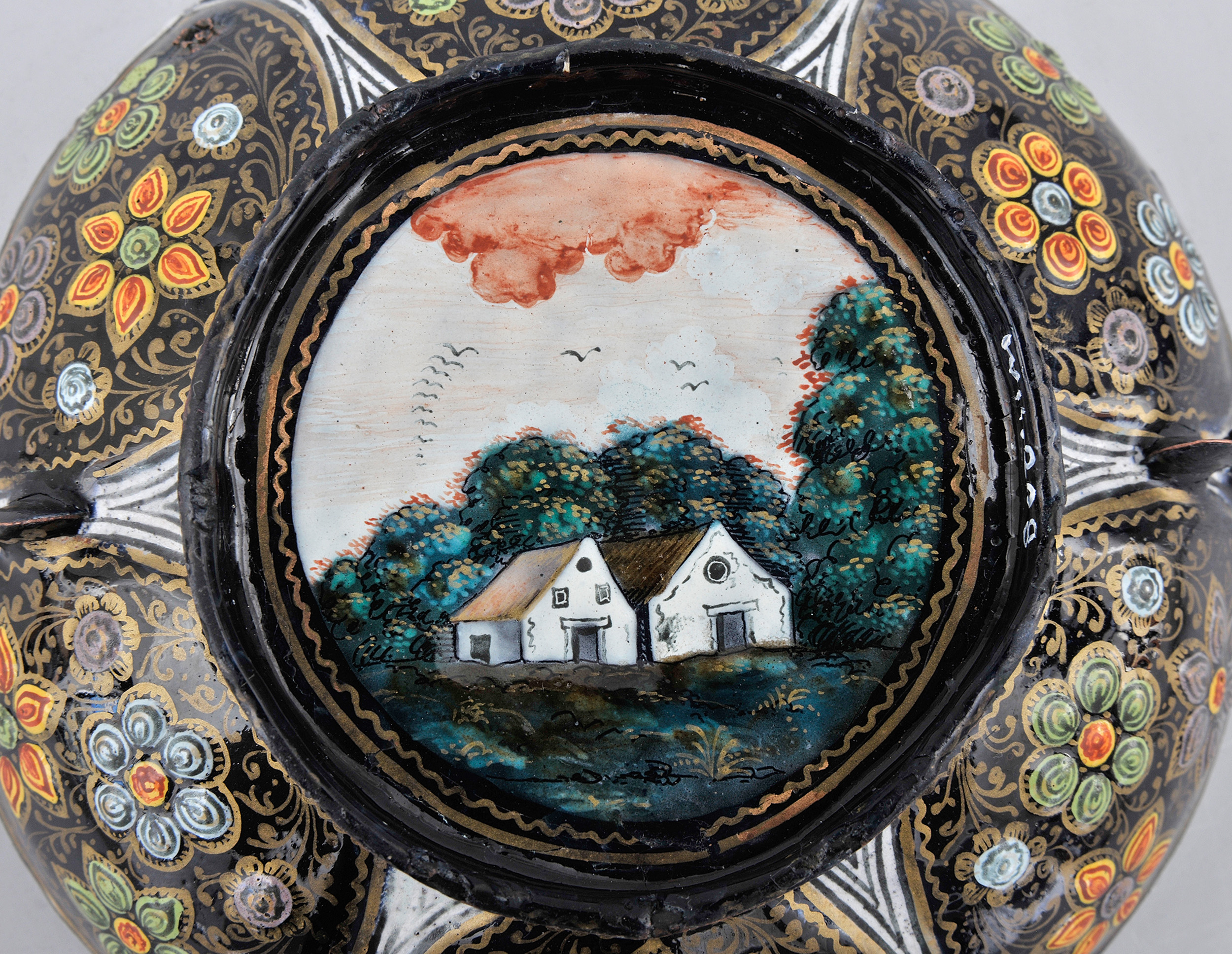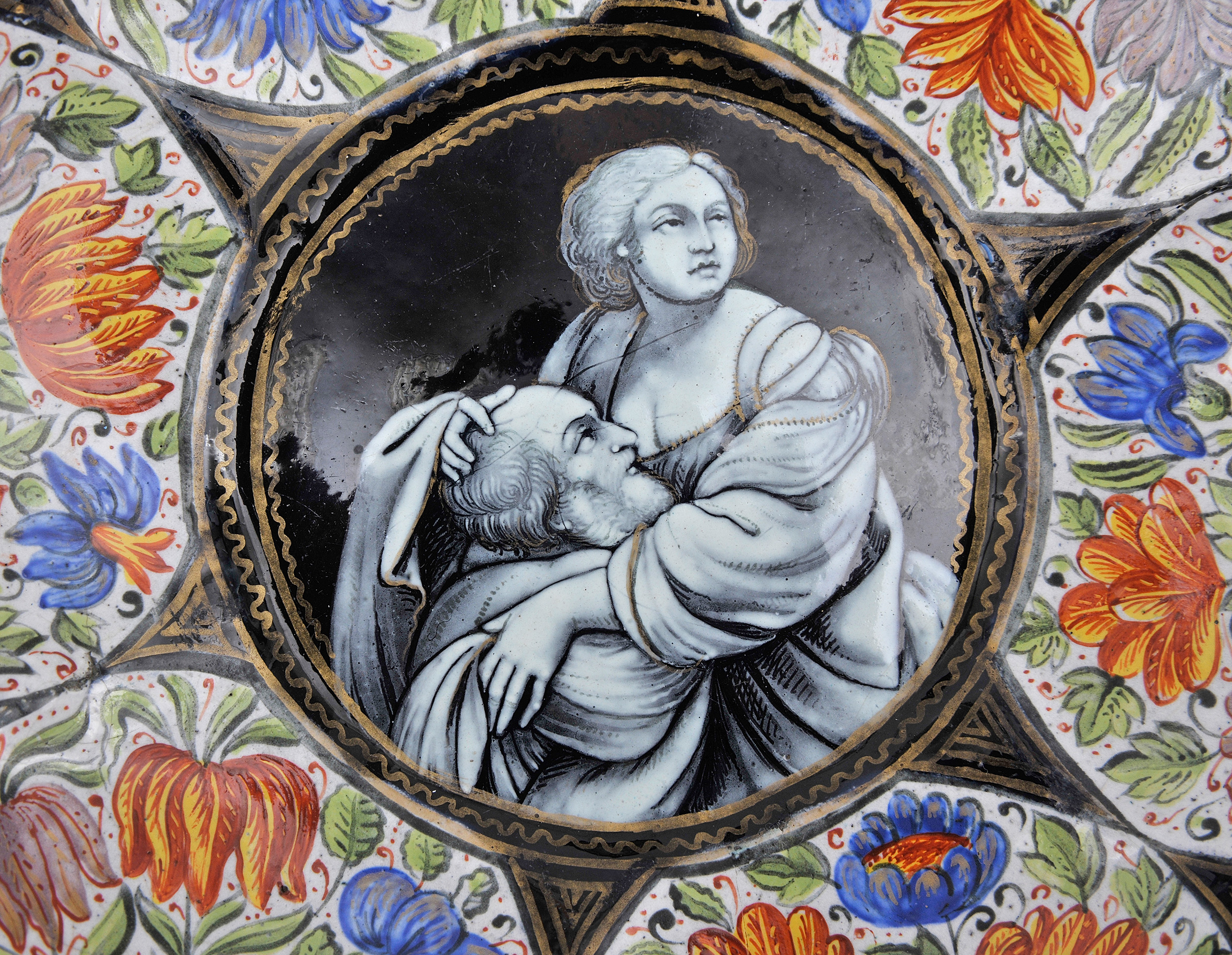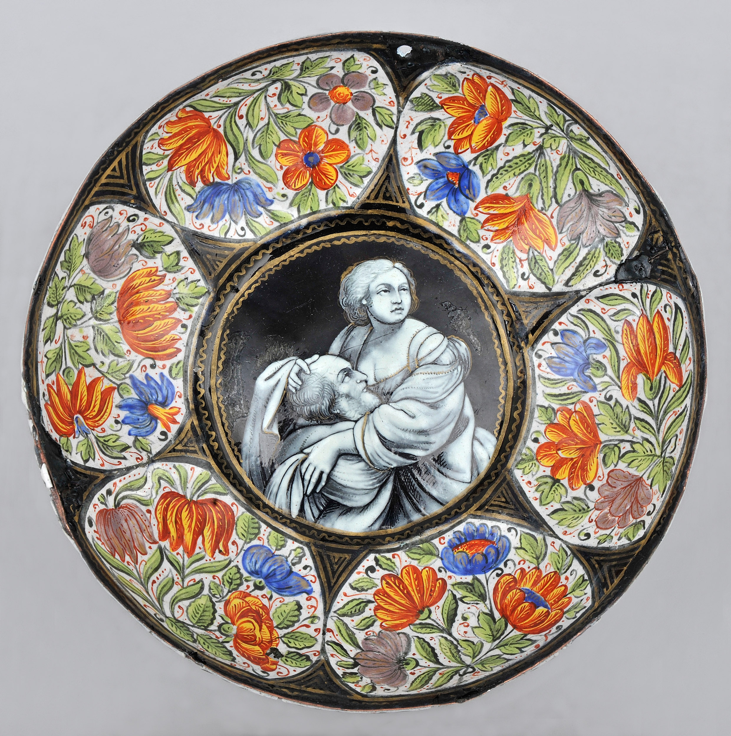 Okrągła czarka o kołnierzu modelowanym z sześciu wgłębień, jest dwustronnie pokryta dekoracją z motywami roślinnymi ujętymi w owalne rezerwy. Jej twórca w największym stopniu wykorzystał barwniki w kolorach: pomarańczowym, żółtym, zielonym i niebieskim. We wgłębieniach kołnierza dominują kolorowe kwiaty malowane na białym tle; na zewnątrz, na czarnym tle, wszystkie delikatnie złocone. Po bokach widoczne są fragmenty dwóch niezachowanych uchwytów. Owalne dno ma malowaną en grisaille na ciemnym tle scenę Caritas Romana. Zewnętrzną dekorację denka stanowi, pejzaż z dwoma domkami ze spadzistymi dachami, na tle grupy drzew. Taki zestaw motywów dekoracyjnych jest bardzo charakterystyczny dla tego typu naczyń, co potwierdzają egzemplarze zachowane w zbiorach Luwru czy w Victoria and Albert Museum.