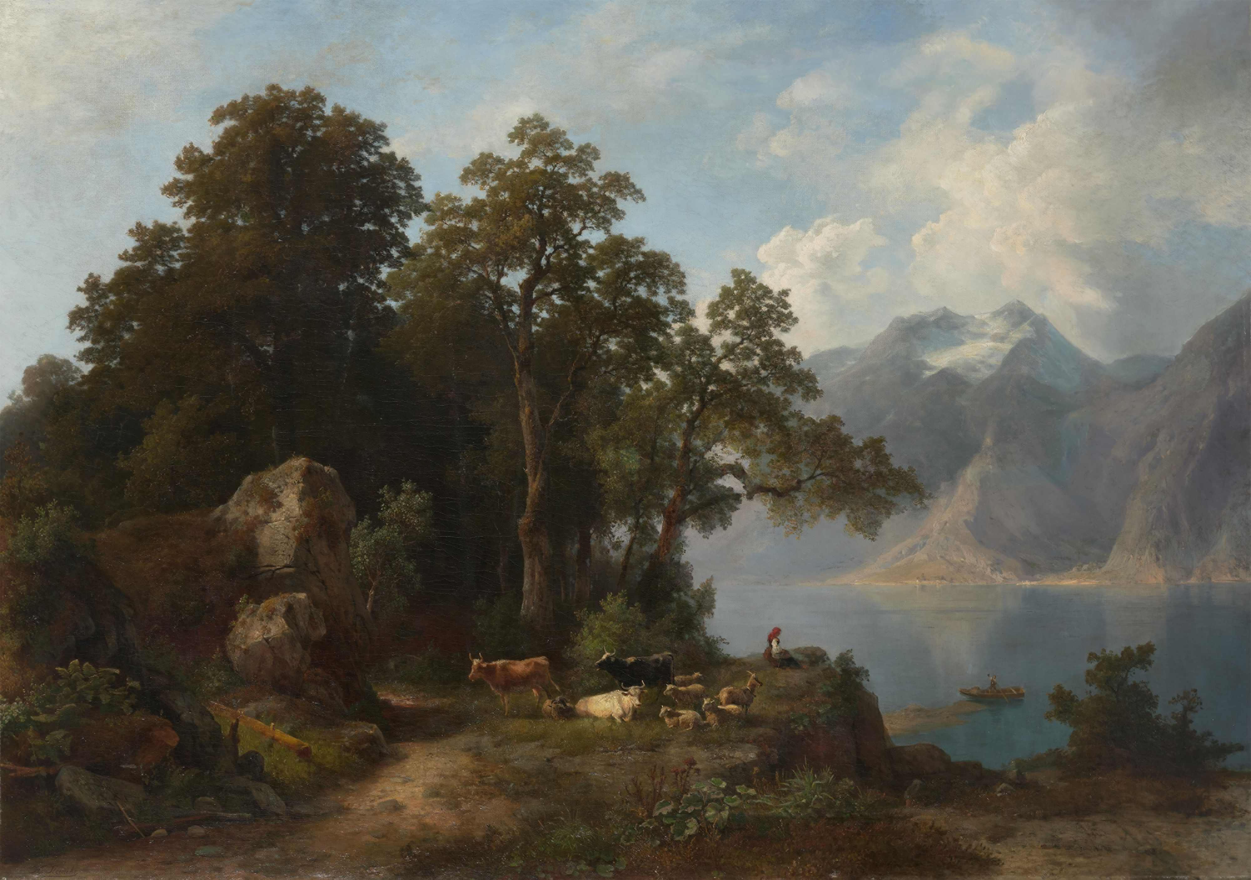 Johann Heinrich Steinike, znany i ceniony pejzażysta drugiej połowy XIX wieku, zasłynął przede wszystkim jako autor malowniczych pejzaży górskich. Artysta kształcił się początkowo na politechnice w Hanowerze. Odbył liczne podróże po Europie. Odwiedził Holandię, Bawarię, Szwajcarię, północną Italię i Norwegię, skąd czerpał inspiracje do późniejszych dzieł. Od 1852 roku na stałe zamieszkał w Düsseldorfie. Uczęszczał do tamtejszej akademii, która słynęła z wybitnych pejzażystów, łączących wnikliwe studia natury z romantyczną nastrojowością. Pochodzący z 1858 roku wielkoformatowy, utrzymany w chłodnej nastrojowej tonacji pejzaż ukazuje wyidealizowany krajobraz u podnóża Alp z widokiem na jezioro. Górski widok ujęty jest w sposób charakterystyczny dla artysty – z odległego punktu nieco wyniesionego ponad horyzont. Znaczną partię obrazu zajmuje wysoki brzeg jeziora porośnięty gęstymi drzewami, z niewielką łąką, na której pasą się zwierzęta. Pasterka siedząca na skraju brzegu zdaje się kontemplować naturę, zapewne spogląda na umieszczone z prawej strony kompozycji jezioro otoczone pasmem stromych gór. Inspiracją dla tego dzieła były malownicze okolice jeziora Chiemsee w południowej Bawarii, które było jednym z ulubionych motywów artysty w latach pięćdziesiątych XIX wieku. Wieloplanowa kompozycja, ożywiona sielskim sztafażem i zamknięta w oddali masywem wysokich gór, obrazuje tendencje malarstwa krajobrazowego typowe dla szkoły düsseldorfskiej początku drugiej połowy XIX stulecia. Obraz Steinikego pochodzi z kolekcji obrazów tworzonej z myślą o przyszłym szczecińskim muzeum. W 1880 roku został odnotowany w spisie tychże miejskich zbiorów jako Landschaft aus dem bayrischen Hochgebirge.