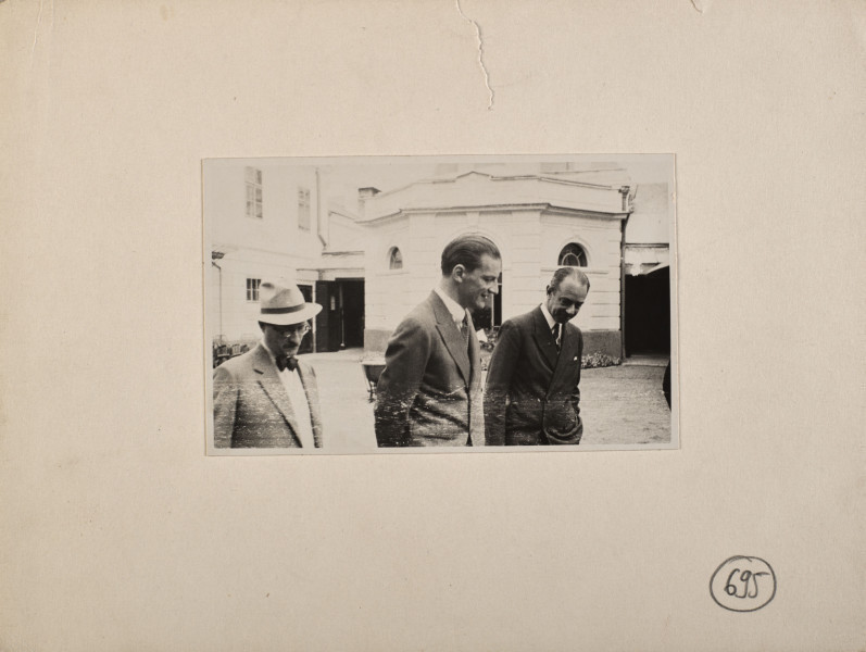 Fotografia przedstawiająca trzech mężczyzn gości Alfreda Antoniego Potockiego, IV ordynata łańcuckiego na Podwórzu W tle widoczny ryzalit Szorowni Galowej praz fragment zachodniego skrzydła Stajni Zamkowej. Fotografia z 2 poł. lat 30. XX wieku.