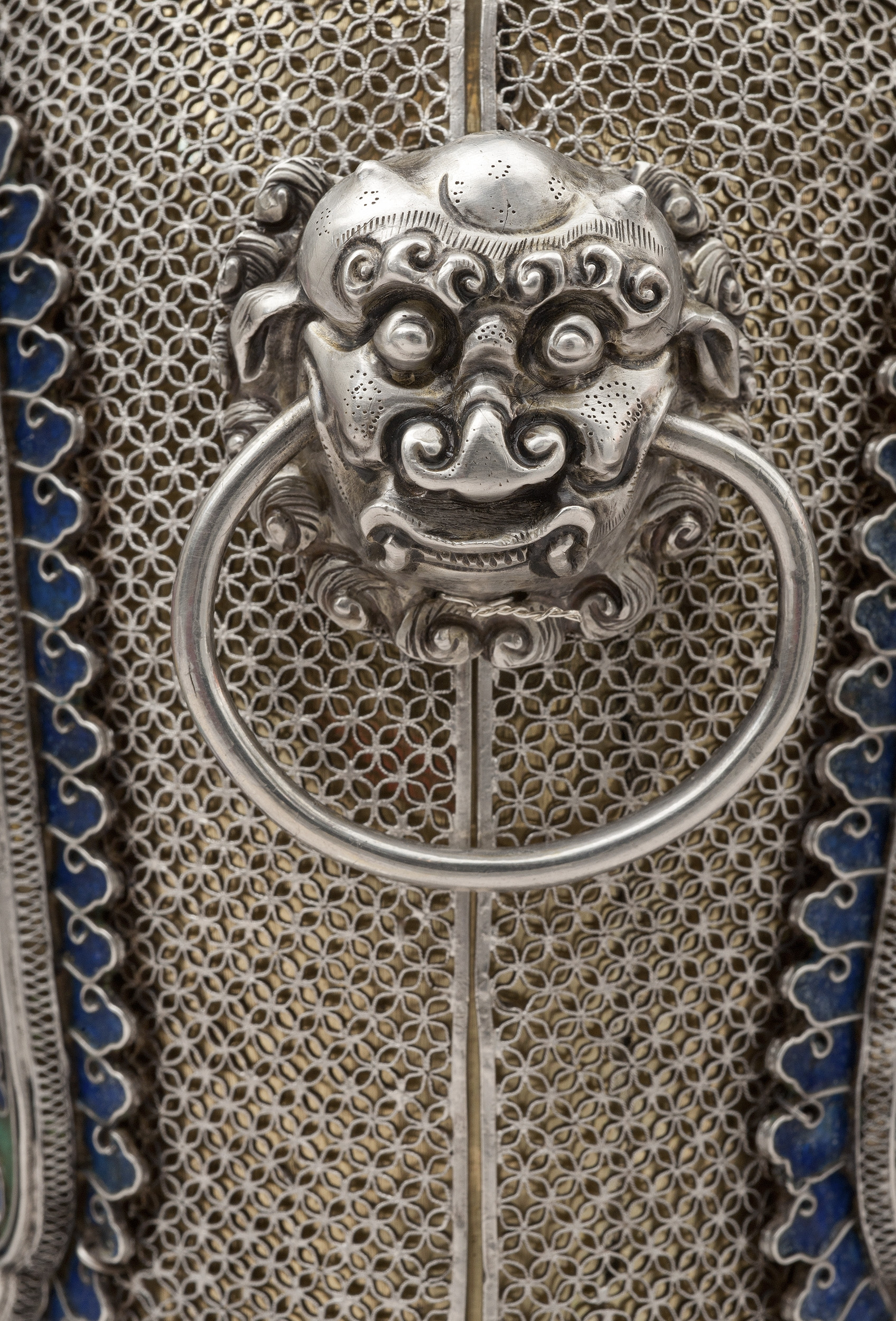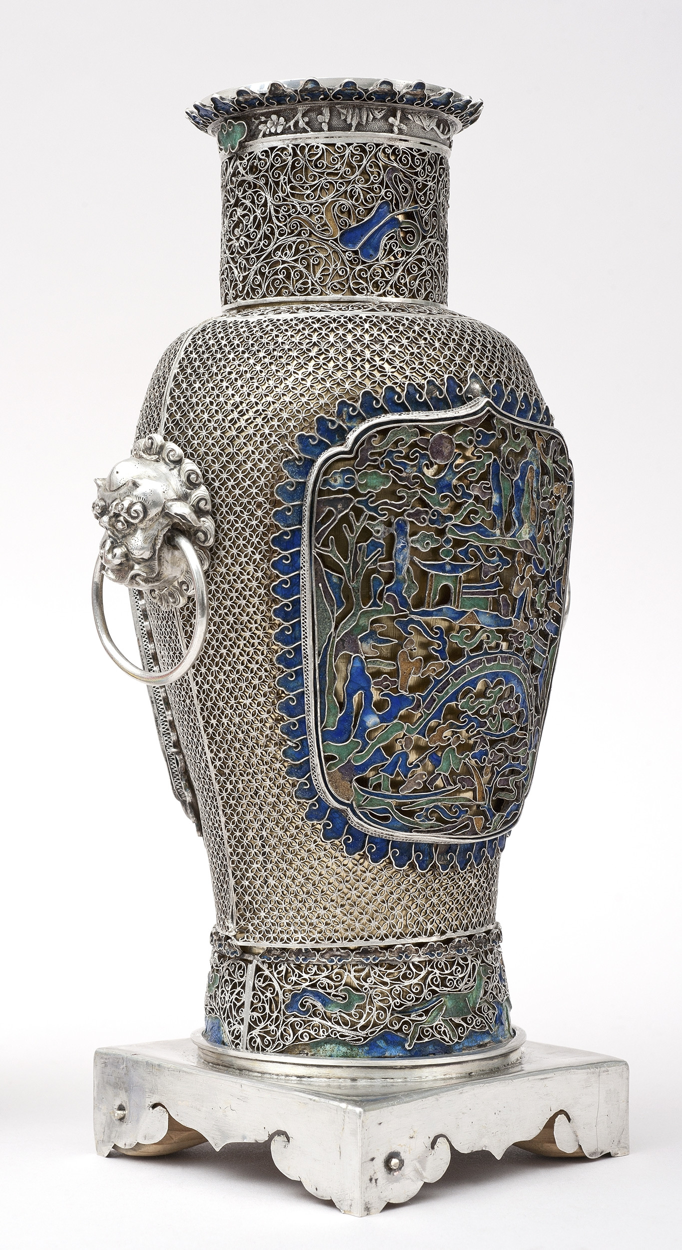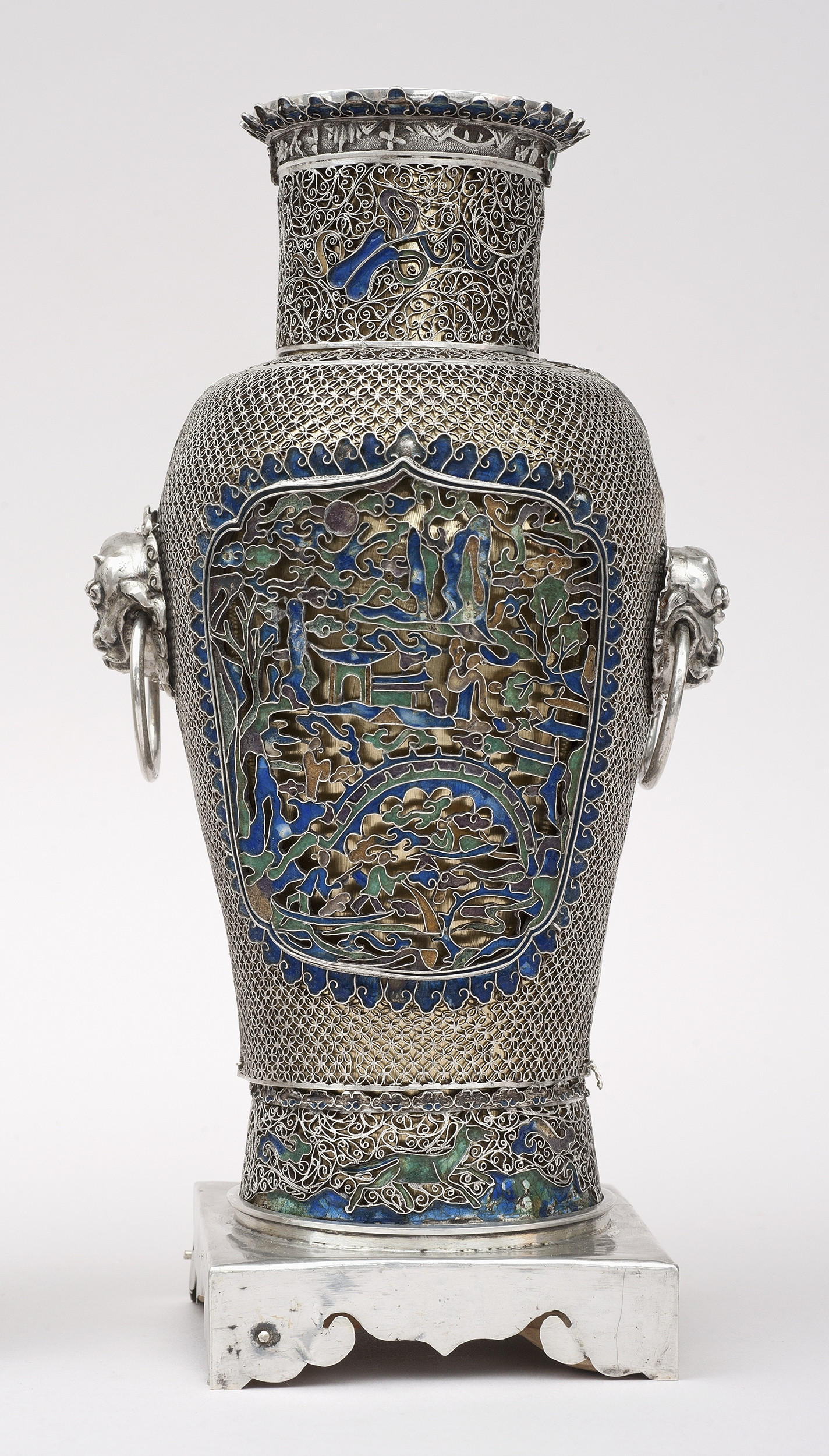 Gruszkowaty wazonik wykonany głównie z mosiądzu i srebra, zdobiony filigranem i emalią. Ten nietypowy przedmiot został osadzony na kwadratowej podstawie o drewnianej konstrukcji, z ozdobnie opracowaną dolną krawędzią. Gruszkowaty brzusiec przechodzi w wyraźniej węższą, cylindryczną szyjkę. Po bokach naczynia zamontowano dwie stylizowane głowy psów Fo, trzymających w paszczach okrągłe, ruchome uchwyty. Dekoracja niemal całego naczynia została ozdobiona srebrnym filigranem, wzbogaconym zdobieniami z fioletowej, niebieskiej, zielonej i żółtej emalii, utrzymanej w dość chłodnej tonacji. Na obu stronach brzuśca znajdują się dwie rozległe rezerwy, czyli pola wyodrębnione krawędzią, wypełnione dekoracją. W tym przypadku są to chińskie przedstawienia pejzażowo – architektoniczne, w których można dostrzec mniejsze scenki rodzajowe.