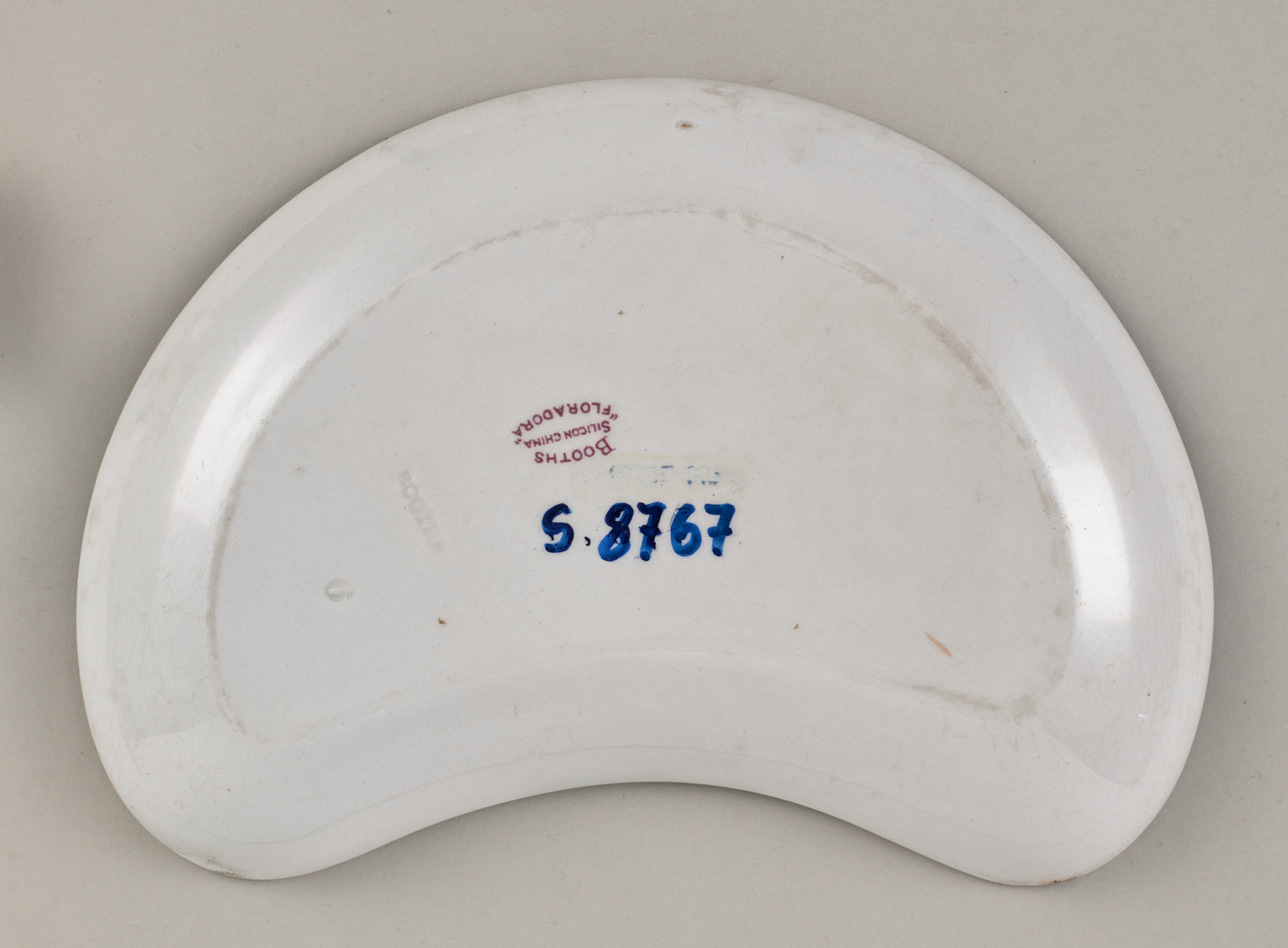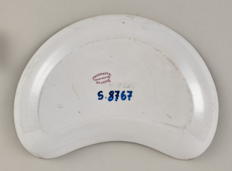 Rewers naczynia posiada płaską podstawkę, w jej centrum znajduje się stemplowana w masie sygnatura producenta „BOOTHS”, (dalsza część odcisku - nieczytelna). Na to nałożono stempel w kolorze bordowego karminu „BOOTHS/SILICON CHINA/”FLORADORA”. Szkliwo cienkowarstwowe, przejrzyste, pokryte siatką spękań.