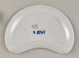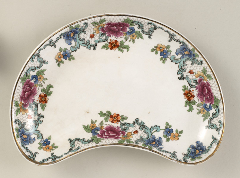 Płytki talerzyk o małych rozmiarach, wykonany z białego fajansu, służący do podawania przystawek obiadowych. Kształt naczynia nawiązuje do rynienki w formie nerki lub półksiężyca. Obiekt zdobiony wielobarwną kalkomanią, złożoną z czterech jednakowych, asymetrycznych kompozycji roślinnych, odpowiednich sztuce rokoko lub dalekowschodniej. Elementy te łączą się ze sobą, złożone są detali w kolorze morskiej zieleni, pośród której wplatają się dwie duże piwonie koloru różowego. Dookoła żółte i niebieskie kwiaty z liśćmi w kolorze jasnej zieleni. Pomiędzy nimi, a brzegiem talerzyka delikatny wzór siatki z wydłużonymi oczkami, zaznaczonymi drobnymi brązowymi punktami. Brzeg talerzyka obwiedziony złotą lamówką.
