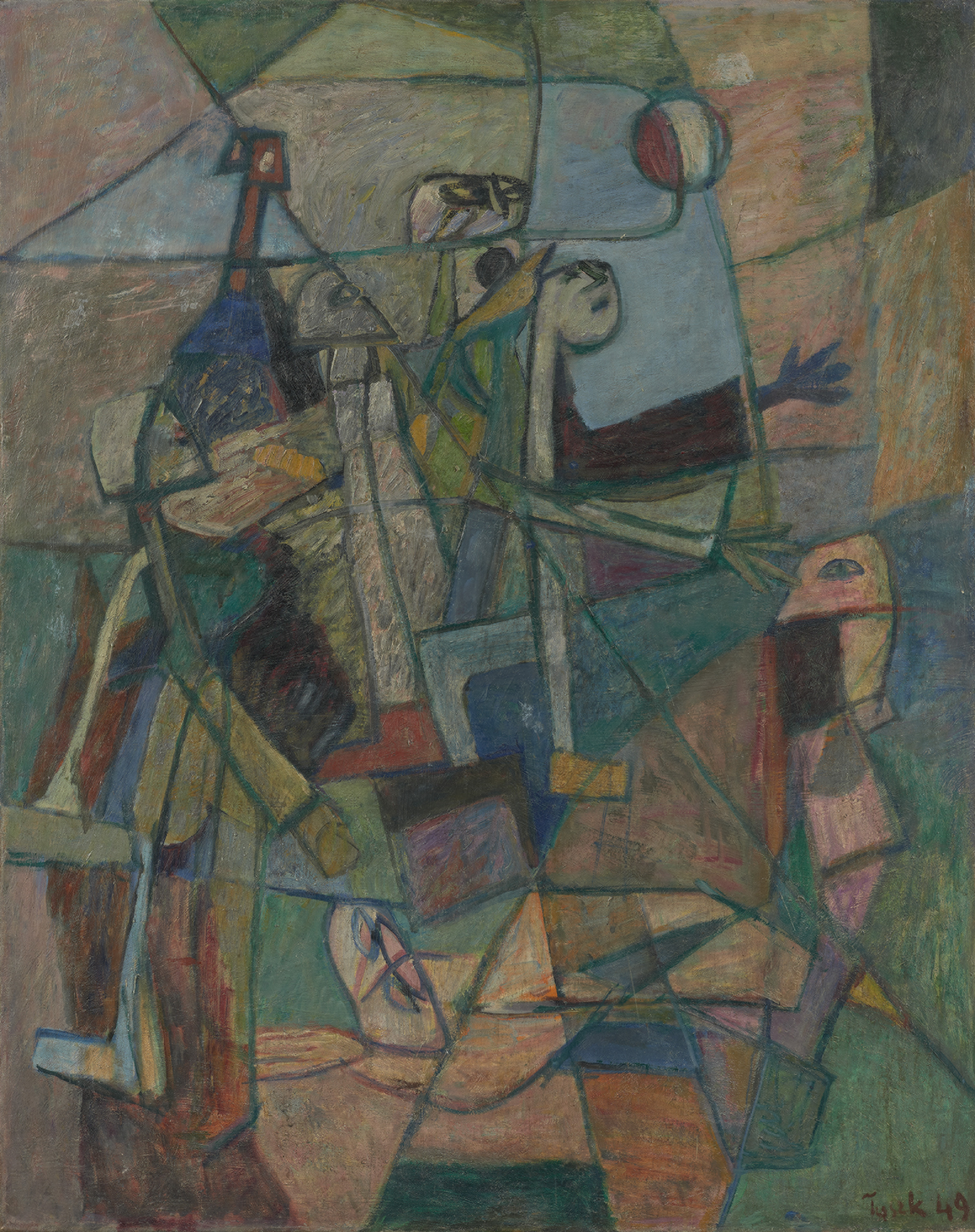 Teresa Tyszkiewicz studiowała w warszawskiej Akademii Sztuk Pięknych u Tadeusza Pruszkowskiego w latach 1928–1933, lecz dyplom obroniła pod opieką Felicjana Szczęsnego Kowarskiego w gronie pierwszych powojennych absolwentów tej uczelni (1946). W latach trzydziestych XX wieku najbliżsi byli jej krakowscy koloryści i ówczesna twórczość Tytusa Czyżewskiego, a krytyka dostrzegała bezpośrednie – i znamienne dla polskiej sztuki tej dekady – związki malarstwa Tyszkiewiczowej z postimpresjonistyczną tradycją francuską. Rok 1945 nie przyniósł zasadniczych przesunięć w geografii artystycznej, jednak dominującą tendencją stawał się kubizujący surrealizm. O jego roli na rodzimej scenie artystycznej zadecydowała ekspozycja francuskich malarzy i rysowników, prezentowana w 1946 roku w Warszawie, Krakowie i Poznaniu, podczas której pokazano między innymi prace Andrégo Fougerona, Léona Gischii, Andrégo Massona czy Édouarda Pignona. W tym samym czasie pod patronatem Tadeusza Kantora zawiązała się ogólnopolska Grupa Młodych Plastyków, do której dołączyła Tyszkiewicz zafascynowana teorią Carla Gustawa Junga. W 1947 roku wzięła udział w pierwszej wystawie ruchu w warszawskim Klubie Młodych Artystów i Naukowców. Kulminacją okresu eksperymentów była Wystawa Sztuki Nowoczesnej w Krakowie na przełomie 1948/1949 roku, na którą malarka wysłała cztery mocno wyabstrahowane kompozycje zbudowane z grubych czarnych linii wypełnionych barwnymi polami. Obraz szczeciński reprezentuje tę picassowsko-witrażową stylistykę. Tematyka związana z piłką nożną należała już do klasycznych zainteresowań sztuki nowoczesnej. Instytucjonalnie wspierał ją Międzynarodowy Komitet Olimpijski, który od 1912 roku organizował równolegle do zmagań sportowców Olimpijskie Konkursy Sztuki. Ostatni, z udziałem polskich twórców, odbył się w 1948 roku, jednak wciąż kontynuowano jego krajową edycję.