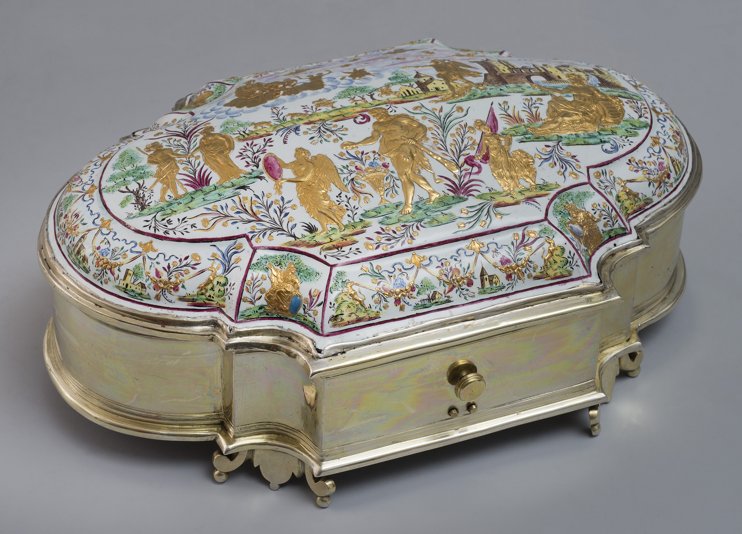 Szkatuła należy do dziesięcioelementowego kompletu toaletowego zawierającego ponadto parę lichtarzy jednoświecowych, dwie pary różnej wielkości szkatułek, dwie tabakierki w kształcie muszli, oprawę do szczotki (do Wil.519). Srebra z serwisu są dziełem berlińskiego złotnika działającego w 1. poł. XVIII w., podpisującego się jako Röhner. O unikatowej wartości artystycznej tego serwisu stanowi dekoracja powierzchni całkowicie pokrytych emalią i ozdobionych nakładkami wykonanymi z czystego złota, zw. emalią saksońską. Zamawiającym i dystrybutorem tego typu luksusowych wyrobów był Pierre Fromery, płatnerz i handlarz wyrobami galanteryjnymi, który w 1685 r. przybył do Berlina z Paryża. Serwis należy do grupy wyjątkowych dzieł, zdobiących najbogatsze skarbce władców w Monachium, Wiedniu, Danii oraz muzealne zbiory w Hamburgu czy Bostonie.
