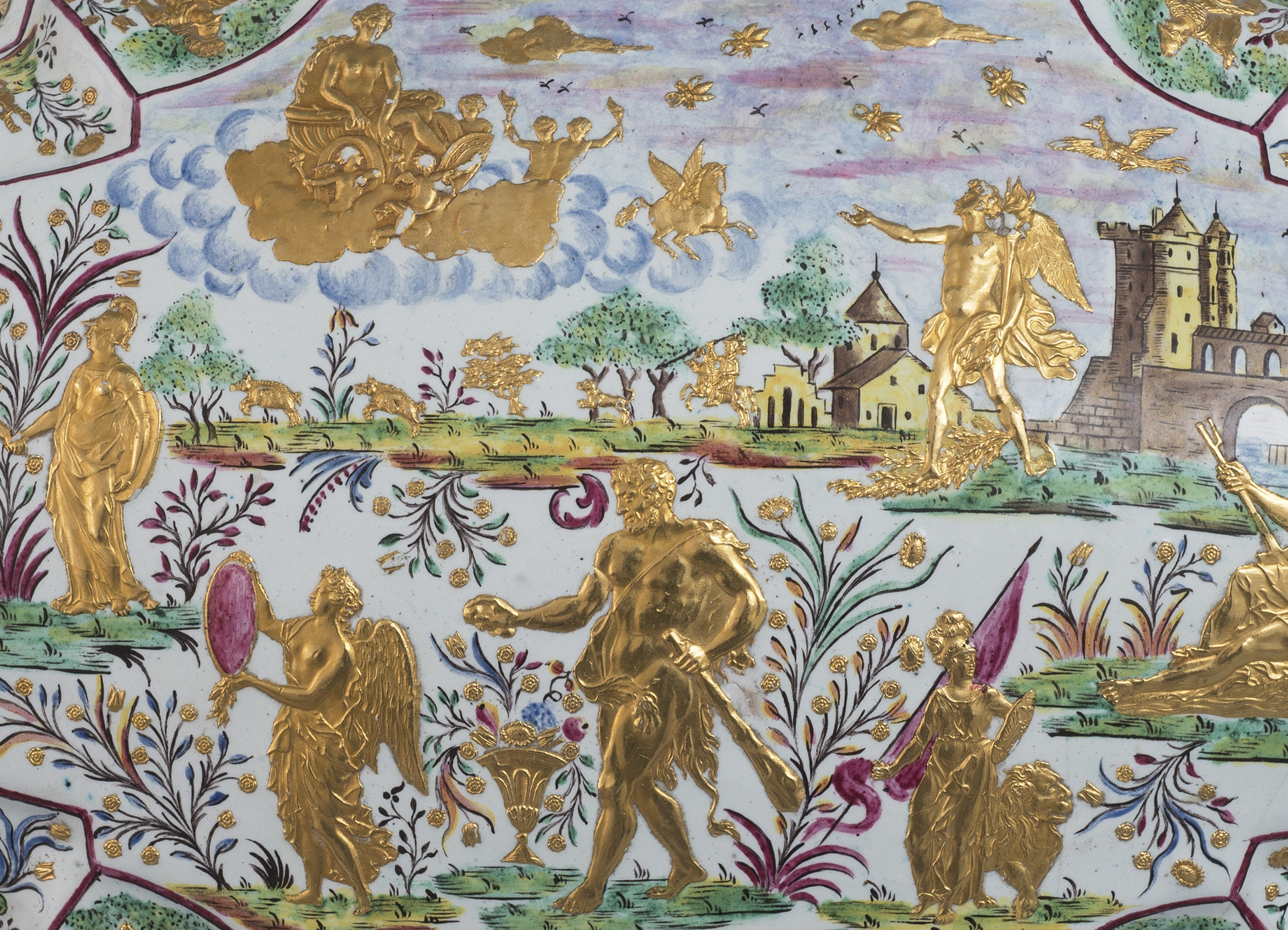 Centralną część dekoracji pokrywki stanowi rezerwa wypełniona pejzażem z kilkoma złotymi nakładkami. Imaginowany krajobraz z pojedynczymi drzewami i krzewami ograniczony jest w drugim planie, po prawej, sylwetką zamczyska z owalną wieżą i murowanym, zwieńczonym arkadowo mostem nad błękitną rzeką. W centrum widoczna dwuelementowa budowla z dwuspadowym dachem i górującą nad nim wieżą. Obok niej, po lewej, ukazano niższe zabudowanie o schodkowym profilu fasady. Symetrycznie skomponowane złote nakładki przedstawiają Neptuna, Herkulesa oraz Minerwę i Marsa. W drugim planie nakładka z wyobrażeniem rydwanu w chmurach, a po prawej stronie – postać kroczącego Merkurego (?). Po dwóch stronach Herkulesa mniejsze nakładki z postaciami uskrzydlonej famy oraz bogini z lwem u boku.