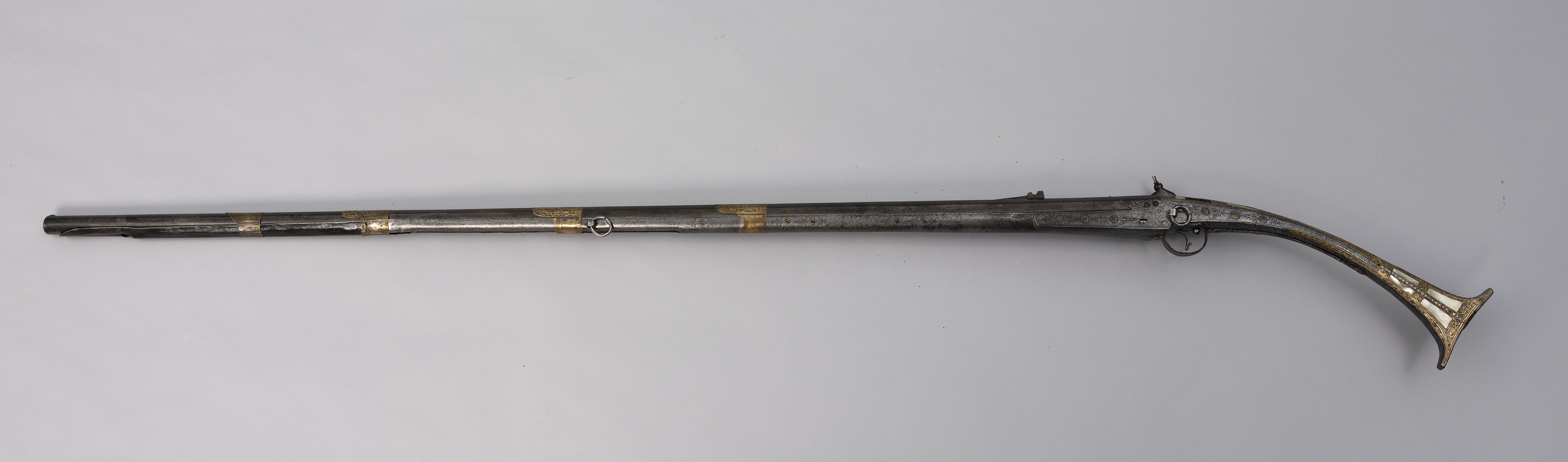 Charakterystyczne dla tego typu broni było też obicie kolby i łoża w całości metalem. W przypadku prezentowanego egzemplarza są to dwa rodzaje surowca o różnej barwie z dodatkową inkrustacją z masy perłowej na kolbie. Powierzchnia kolby jest ornamentowana grawerowanymi motywami roślinnych wici i wzorów geometrycznych oraz srebrnymi i miedzianymi nitami. Broń posiada zamek skałkowy typu śródziemnomorskiego nazywany miquelet. Na boku przy zamku oraz od spodu łoża przytwierdzone są stalowe koła do przymocowania pasa, pozwalającego przewiesić broń przez ramię w trakcie marszu.