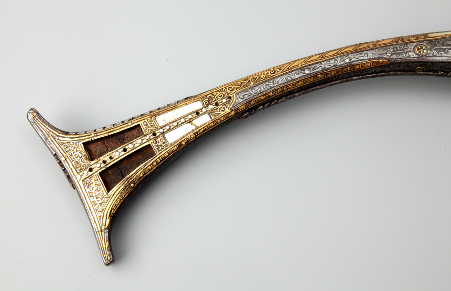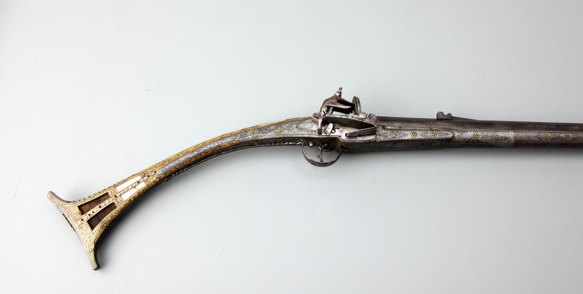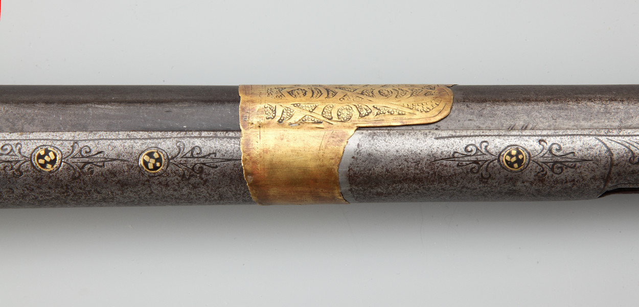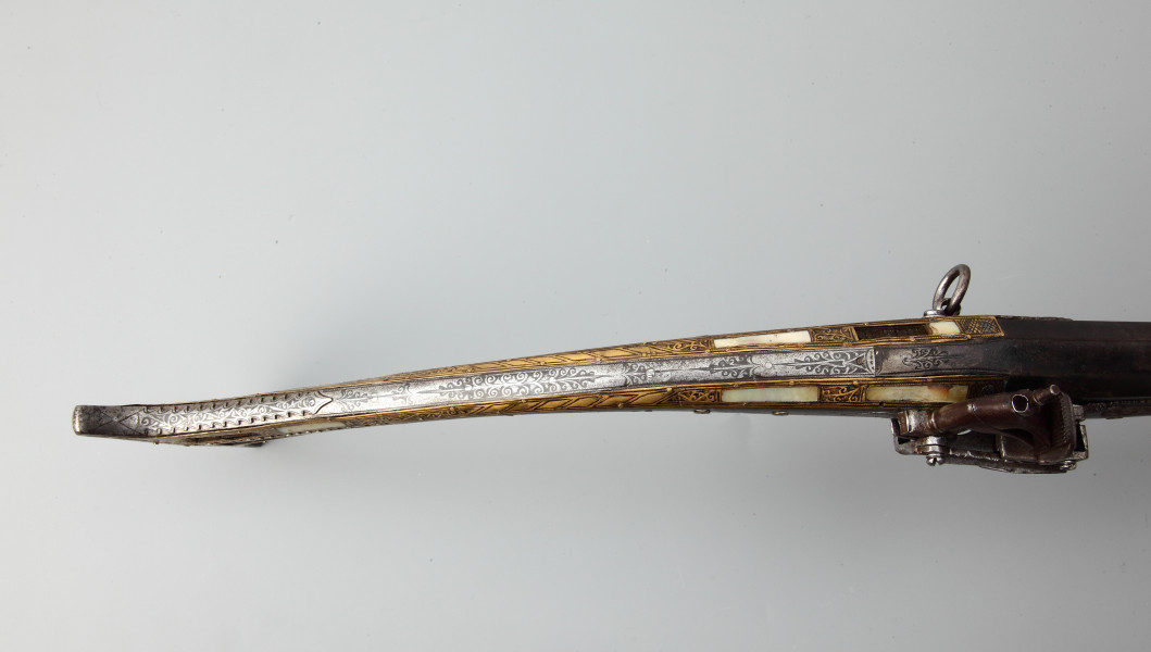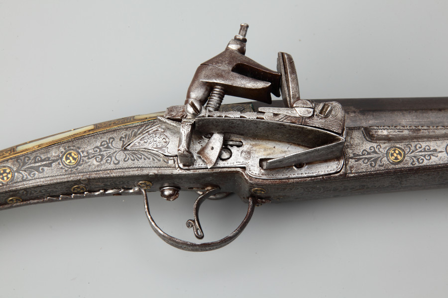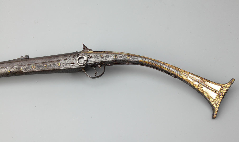 Charakterystyczne dla tego typu broni było też obicie kolby i łoża w całości metalem. W przypadku prezentowanego egzemplarza są to dwa rodzaje surowca o różnej barwie z dodatkową inkrustacją z masy perłowej na kolbie. Powierzchnia kolby jest ornamentowana grawerowanymi motywami roślinnych wici i wzorów geometrycznych oraz srebrnymi i miedzianymi nitami. Broń posiada zamek skałkowy typu śródziemnomorskiego nazywany miquelet. Na boku przy zamku oraz od spodu łoża przytwierdzone są stalowe koła do przymocowania pasa, pozwalającego przewiesić broń przez ramię w trakcie marszu.