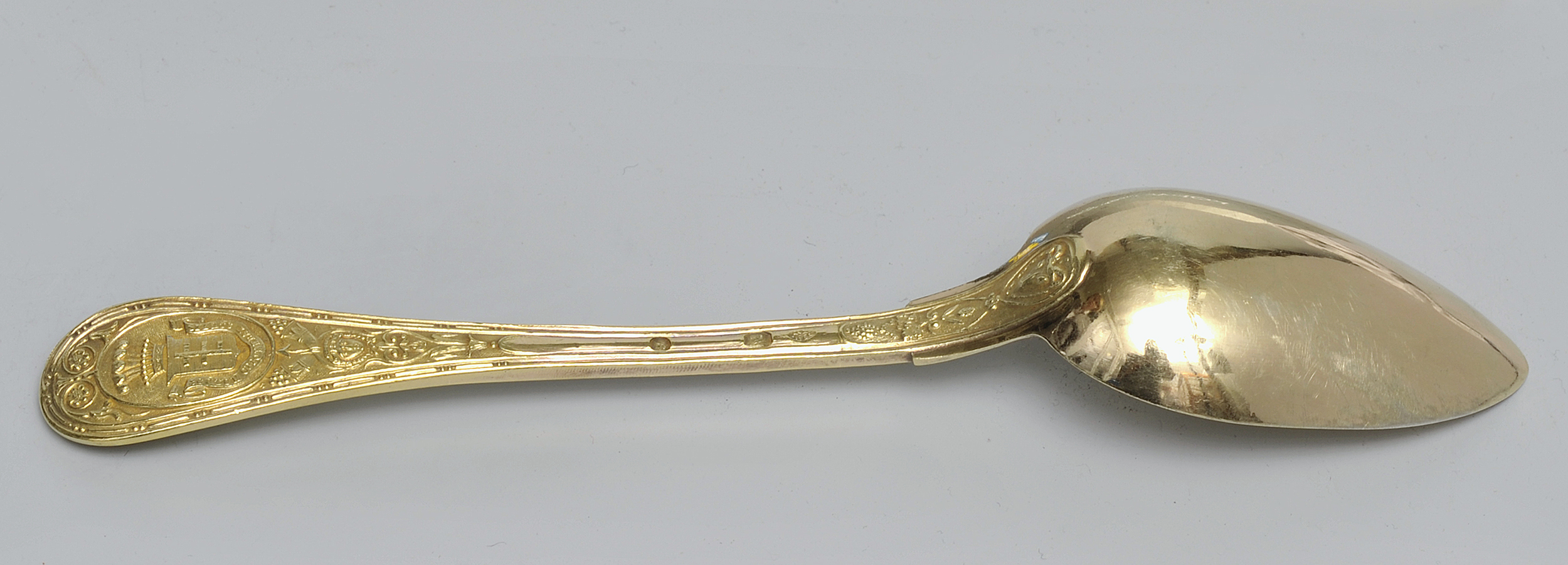 Łyżka deserowa o wydłużonym owalnym czerpaku jest jedną z siedemdziesięciu dwóch łyżek zachowanych w wilanowskiej kolekcji.