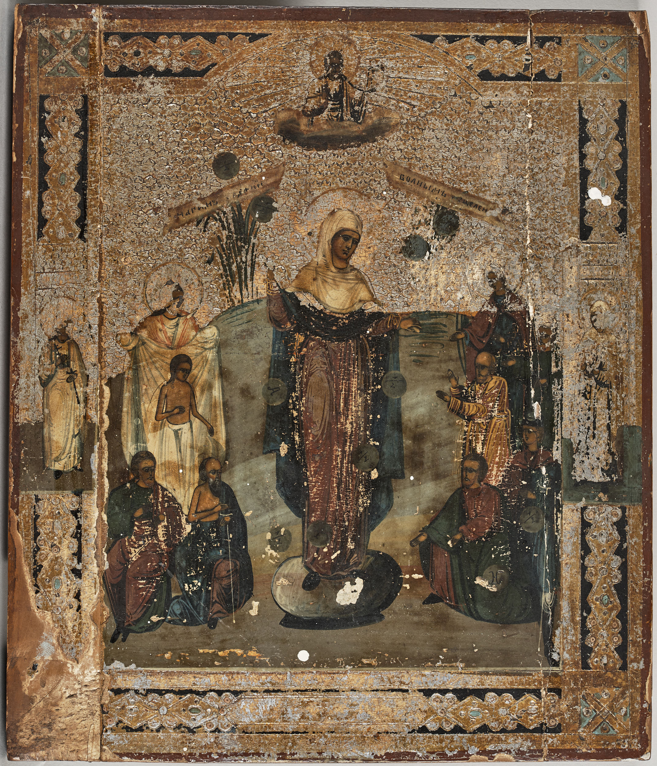 Słowa modlitewnej pieśni liturgicznej – stichiry ku czci Bogurodzicy ”Radości wszystkich strapionych i Orędowniczko pokrzywdzonych…” zapoczątkowały nazwę ikony Radość Strapionych lub Radość Wszystkich Strapionych. Pierwszy obraz pod tym tą nazwą namalował w 1683 r. Iwana Bezmin, malarz zatrudniony w pracowni działającej przy moskiewskim kremlowskim skarbcu-zbrojowni zwanym Orużejnaja Pałata. Obraz oparty był na wzorcach europejskiej sztuki, które przesiąkły środowisko moskiewskie w XVII w. Nie wiadomo czy na pewno trafił on do moskiewskiej cerkwi Przemienienia Pańskiego na Ordynce. W 1688 r. pochodząca ze wspomnianej cerkwi ikona Radość Strapionych stała się źródłem łaski cudownego uzdrowienia Eutymii – siostry patriarchy Joachima. Od tego czasu na ikonach Radość Strapionych zaczęto umieszczać w otoczeniu Bogurodzicy chorych i potrzebujących, patrz S.12800MŁ, S.12806MŁ, S.12835MŁ, S.12863MŁ. Powszechnie czczony i powielany wizerunek spopularyzował się w wielu różniących się między sobą wariantach. Legenda głosi, że jedną z takich ikon wyłowiono z Newy w Petersburgu. Obraz stał się własnością kupców Kurakinych i przez małżeństwo przeszedł do rodziny Matwiejewych, którzy umieścili go w drewnianej podmiejskiej kaplicy stojącej w pobliżu fabryki szkła. W 1888 r. podczas silnej burzy w kaplicę trafił piorun zwęglając jej wnętrze. Jedynie ikona Radość Starpionych nie doznała uszczerbku, ale dwanaście monet, rozrzuconych uderzeniem pioruna ze stojącej w pobliżu skarbonki, trwale przywarło do lica obrazu. Odtąd ikonę, która zasłynęła cudami, nazwano Bogurodzica Radość Strapionych z grosikami. Na wykonanych z niej kopiach domalowywano w tle monety, jak na prezentowanym wizerunku. Osobne święto ustanowiono dla niej na 5 sierpnia (23 lipca wg kalendarza juliańskiego), niezależnie od święta moskiewskiej ikony z 6 listopada (24 października wg kalendarze juliańskiego).