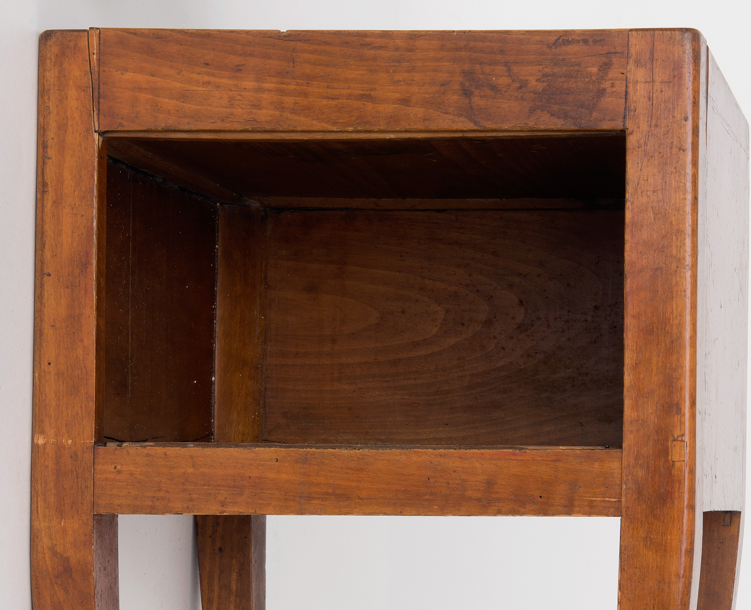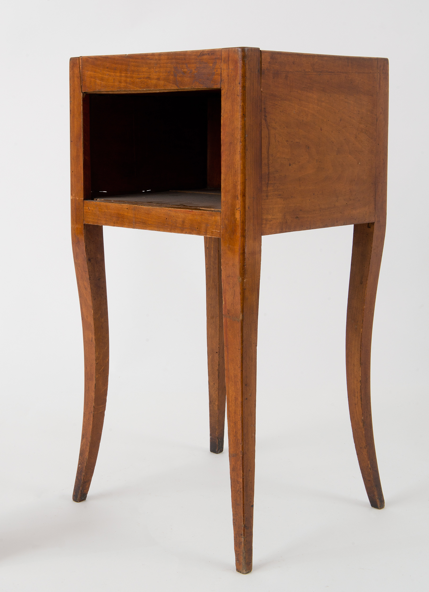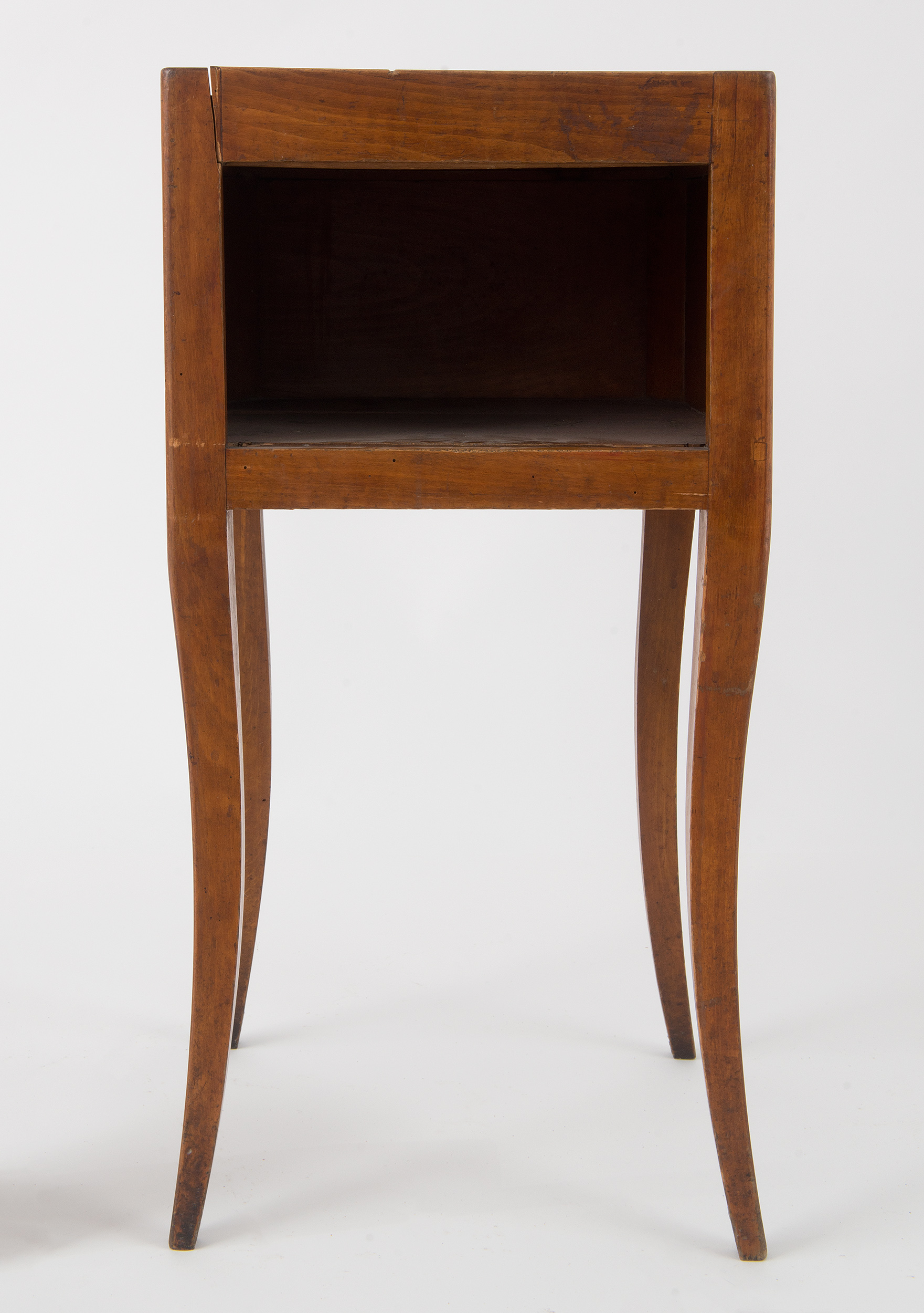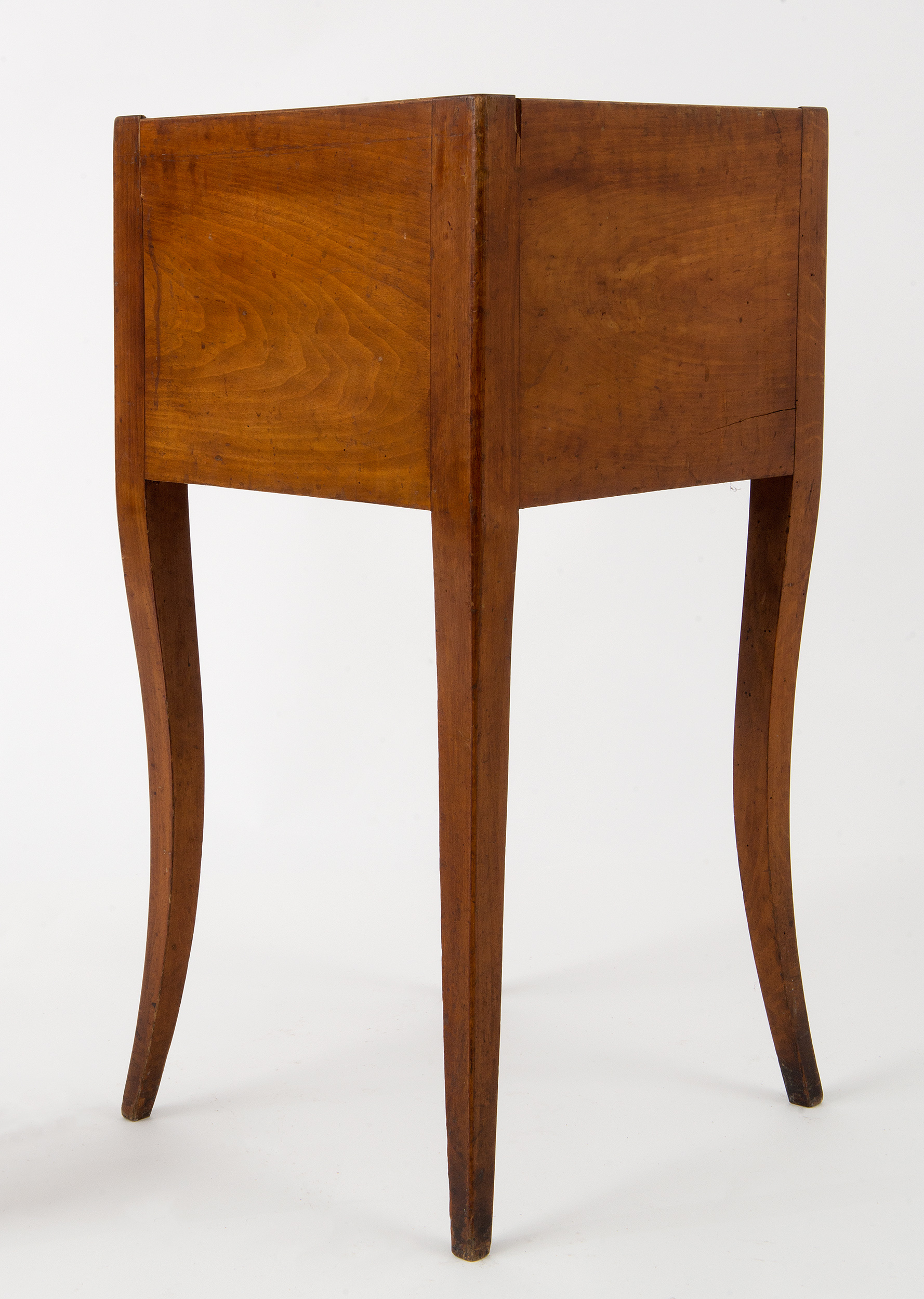 Stolik nocny jest skromną formą francuskiego table de chevet w stylu Ludwika XV. Niemal na każdym przedstawieniu rokokowej sypialni odnajdujemy tego typu mebelek. Jego konstrukcja jest niezwykle prosta: korpus ma kształt prostopadłościanu pozbawionego przedniej ścianki, który w swym wnętrzu mieści tylko jedną komorę. Narożniki korpusu płynnie przechodzą w cztery smukłe, lekko wygięte nóżki o przekroju kwadratu, zwężające się ku dołowi. Wierzch kryty jest białym marmurem; nieco wyższe ścianki tworzą wokół niego galeryjkę zabezpieczającą drobne przedmioty na nim kładzione przed spadaniem.
