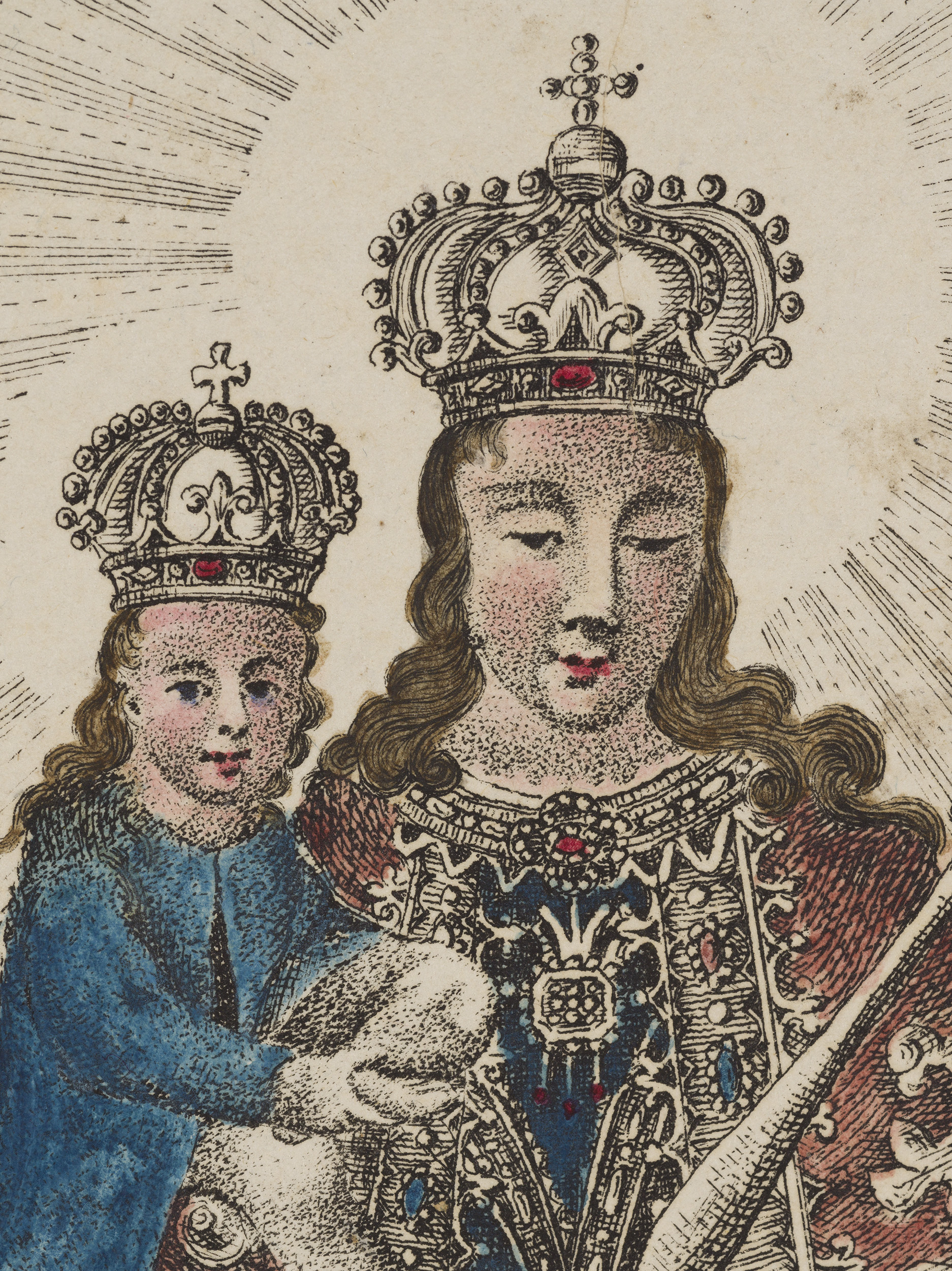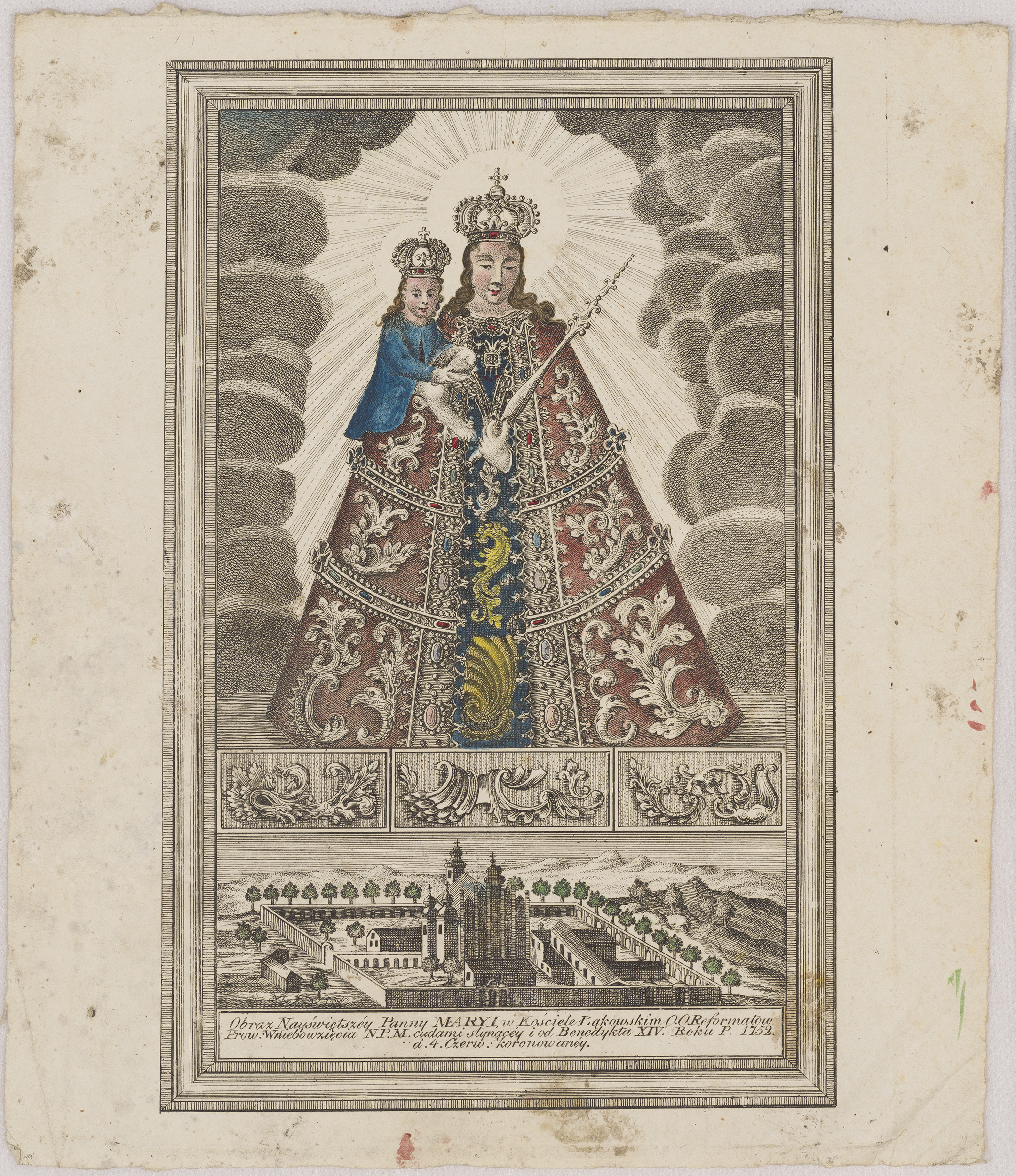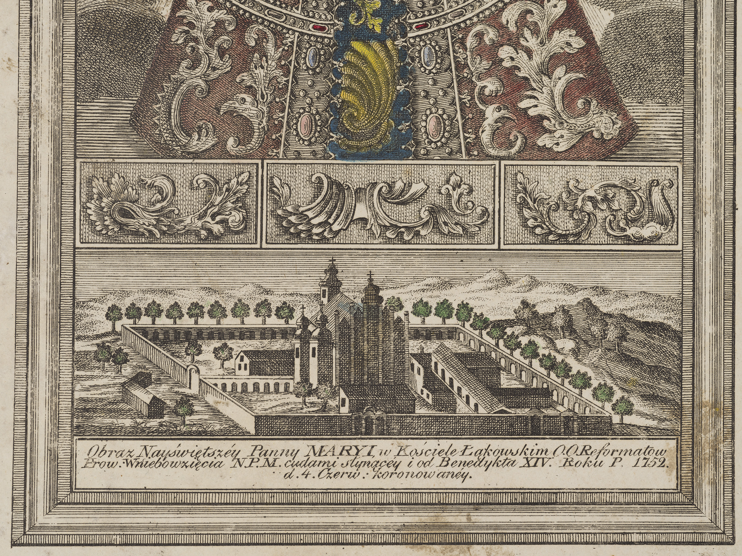 Na rycinie przedstawiono uznawaną za cudowną gotycką figurę Matki Boskiej Łąkowskiej i zabudowania kościoła Wniebowzięcia Najświętszej Marii Panny i klasztoru reformatów w Łąkach Bratiańskich, położonych między Bratianem a Nowym Miastem Lubawskim. Na dole ryciny znajduje się tekst: Obraz Nayświętszéy Panny Maryi, w Kościele Łąkowskim o.o. Reformatow Prow. Wniebowzięcia N.P.M. cudami słynącéy i od Benedykta XIV. roku P. 1752. d. 4. czerw. koronowanéy. Matka Boska jest odziana w długi płaszcz, w lewej dłoni dzierży berło. Dzieciątko na Jej prawym ramieniu charakterystycznym gestem podtrzymuje dłonią swoją stopę. Widoczna w niej rana (w zasadzie nieczytelna w rycinie, ale widoczna w figurze) może być interpretowana jako symbol zmazania grzechu pierworodnego lub zapowiedź przyszłej męki. Trudno o precyzyjne wskazanie początków kultu Matki Boskiej Łąkowskiej, sięgających XIV lub nawet XIII wieku. Wedle jednej z legend płynąca figura Madonny ukazała się dzieciom pasącym bydło nad Drwęcą. Przeniesiono ją do kościoła w Nowym Mieście, ale zniknęła stamtąd, by ukazać się ponownie na drzewie. Po łaskach uzdrowień postanowiono w tym miejscu wybudować kaplicę. Ok. 1631 roku Paweł Działyński sprowadził tu franciszkanów-reformatów (pierwotnie osiedlonych w Nowym Mieście), którym kilka lat później ufundował murowane klasztor i kościół.