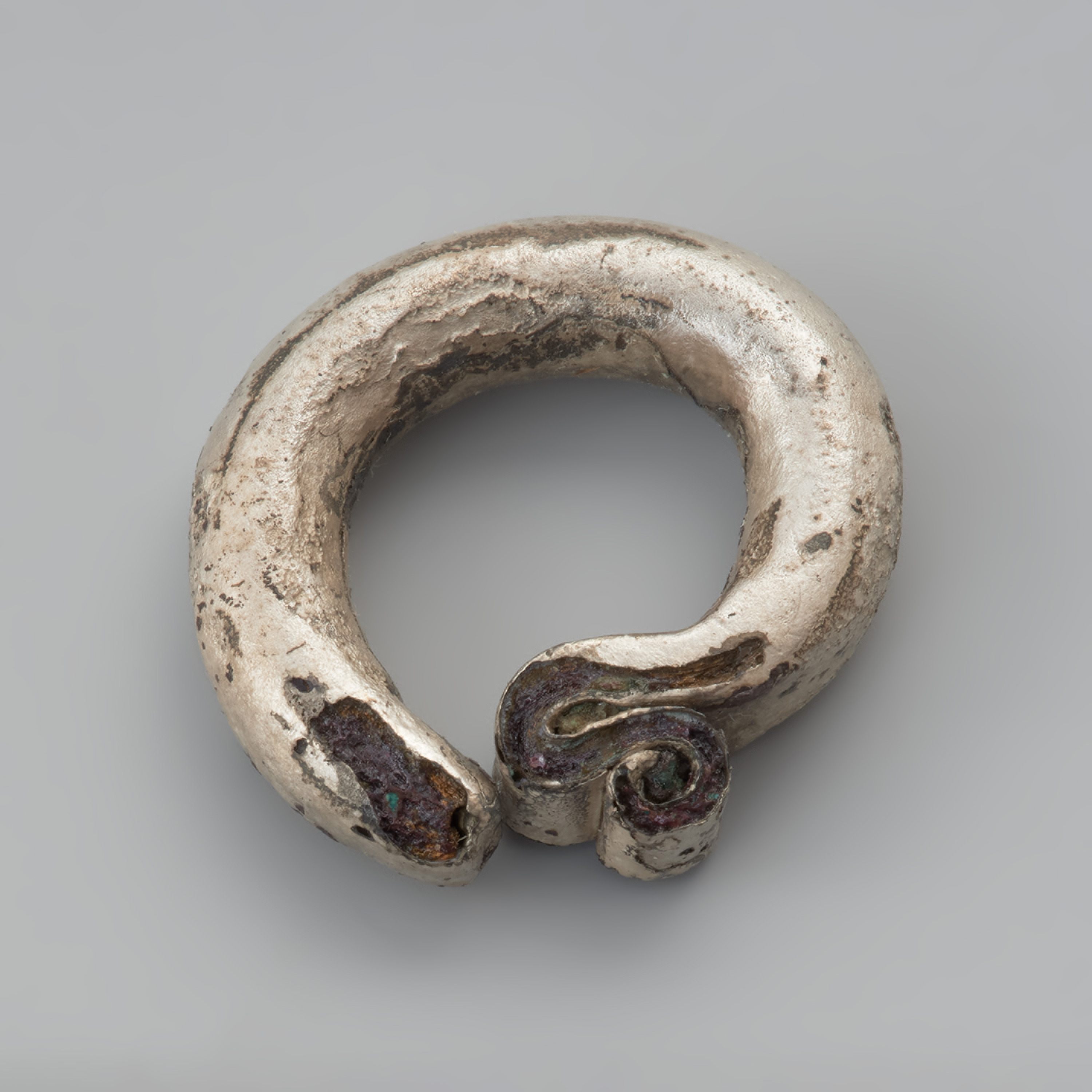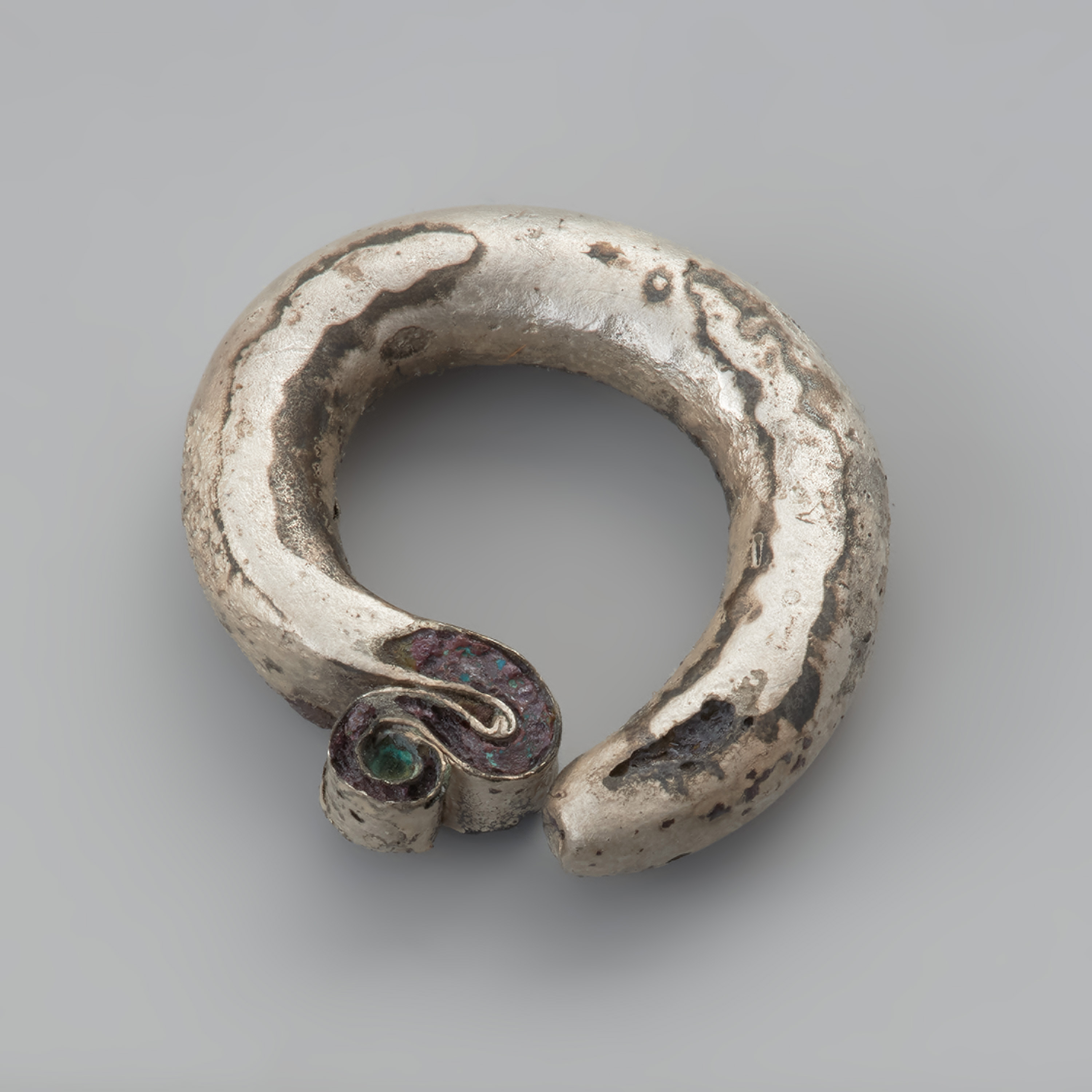 Kabłączek skroniowy odkryty w 1979 roku podczas badań wykopaliskowych na cmentarzysku wczesnośredniowiecznym w Cedyni, w grobie zawierającym pochówek dziecka jest wykonany z drutu, z jednym końcem prosto ściętym, drugim uformowanym w esowate spłaszczone uszko zwinięte w dwie spirale. Kabłączki skroniowe były najbardziej charakterystyczną ozdobą głowy kobiet na terenie wczesnośredniowiecznej Słowiańszczyzny. Występowały na Pomorzy Zachodnim od VII do początków XIV wieku. W tym czasie współwystępowały ze sobą różne ich formy, od obręczy o obu końcach prosto ściętych, poprzez formy z jednym końcem uciętym, a drugim uformowanym w haczyk, lub w esowate uszko, po egzemplarze w dwoma końcami zwiniętymi w uszka. Do wykonania większości z nich wykorzystywano druty różnej grubości. Zdobienie takich okazów obejmowało jedynie wierzchnie części taśmowatych uszek.