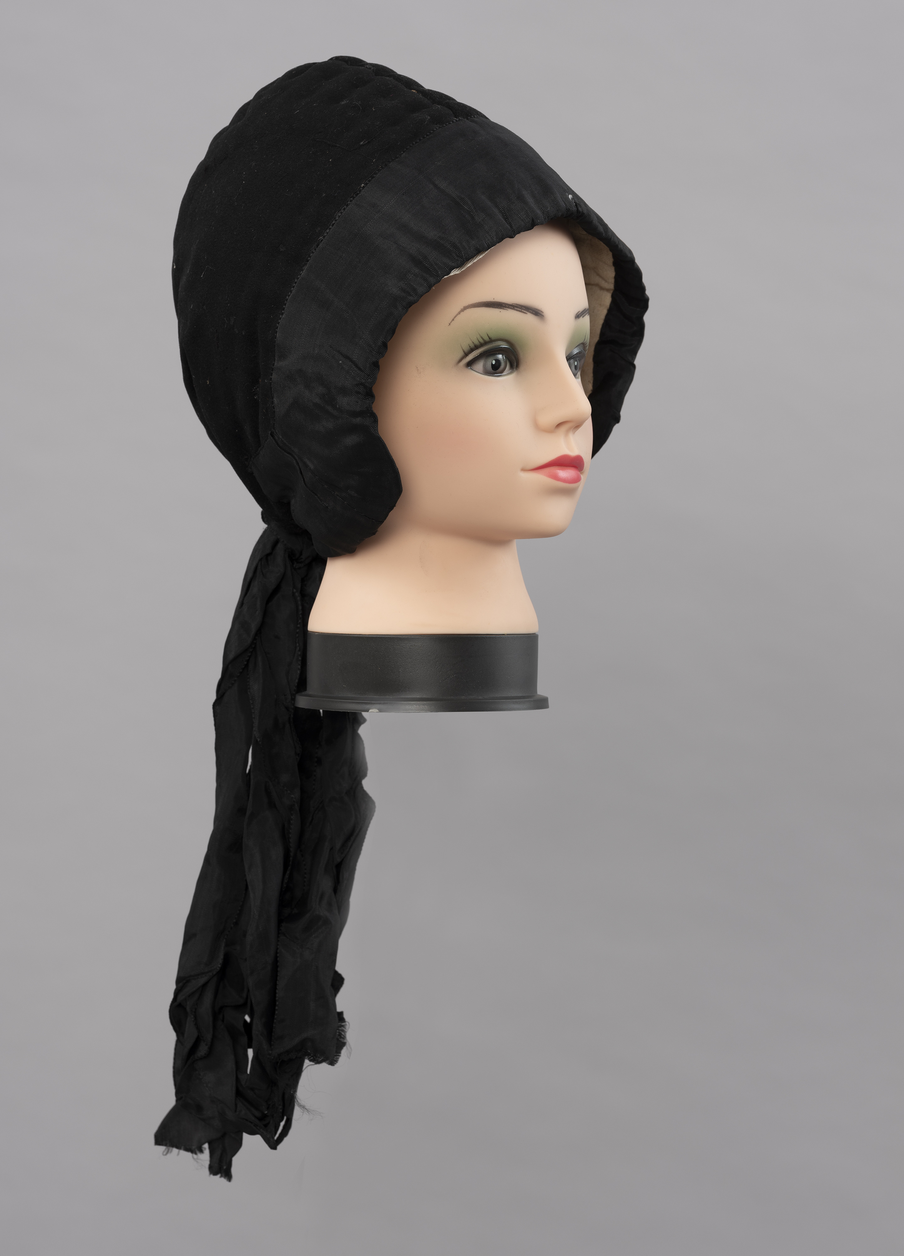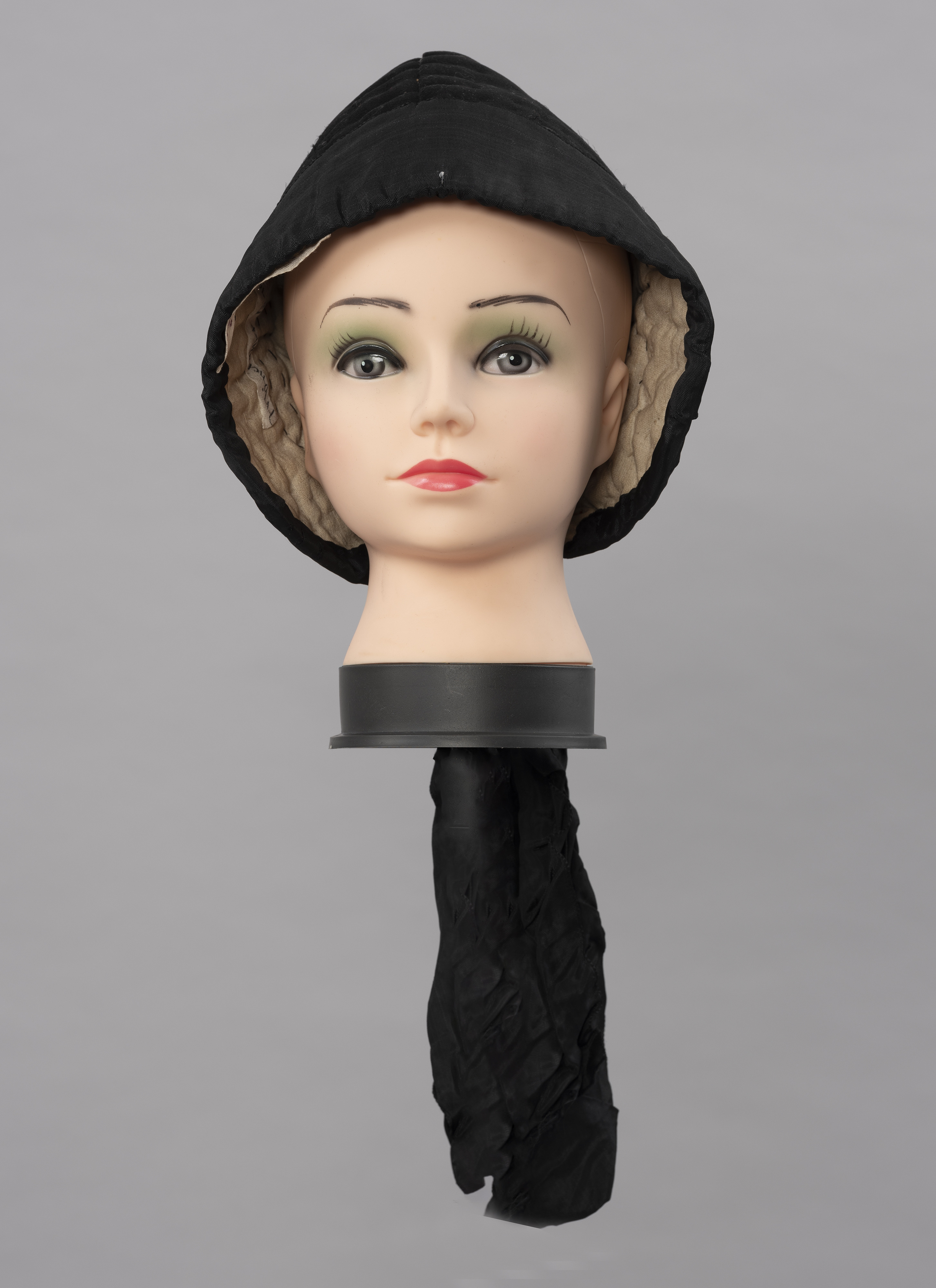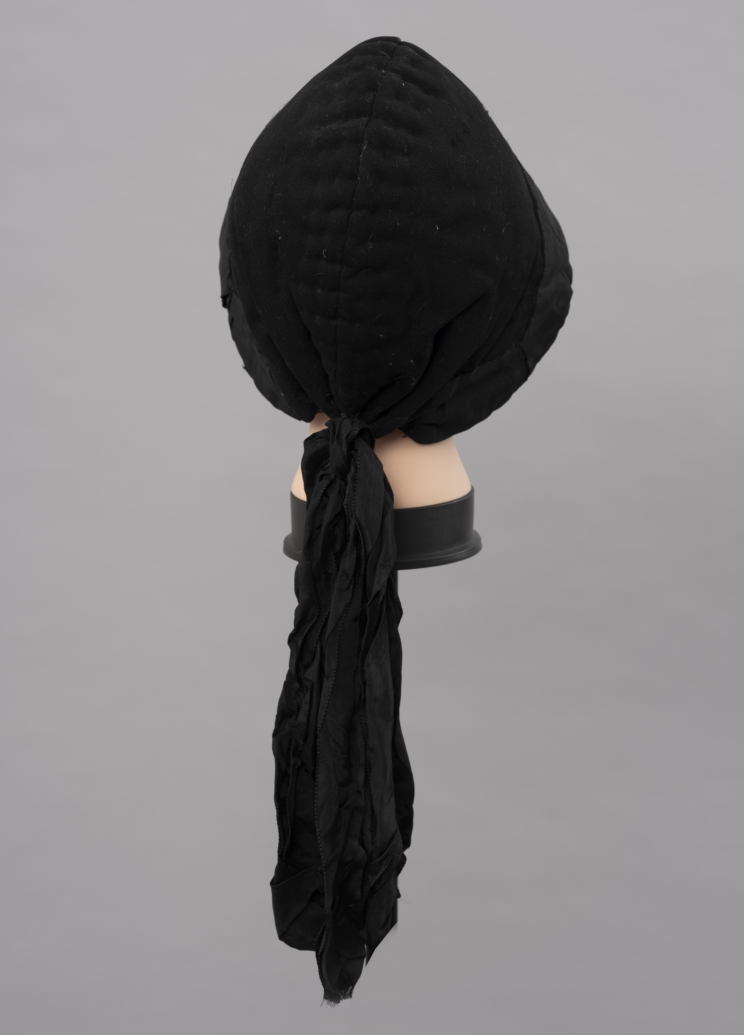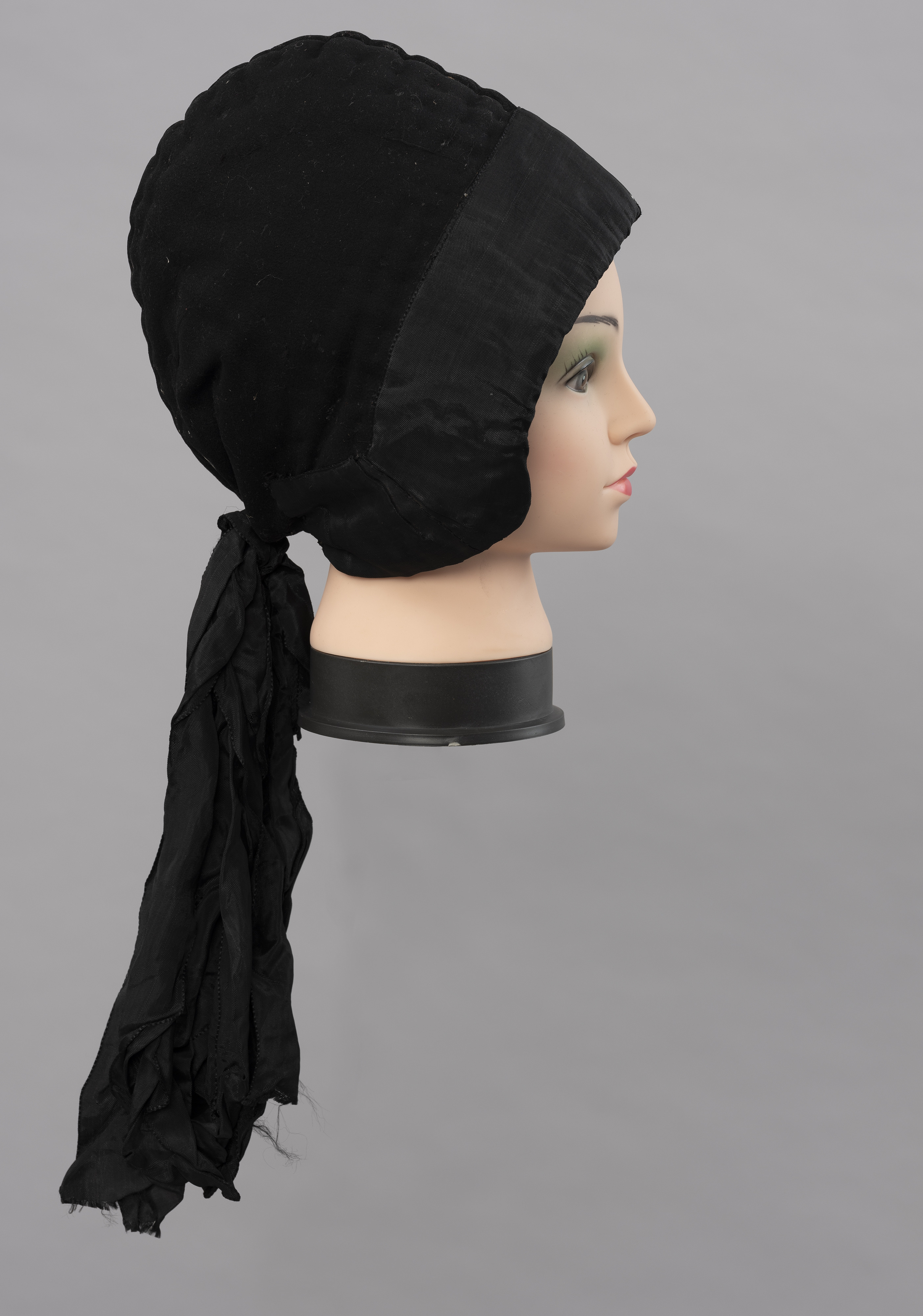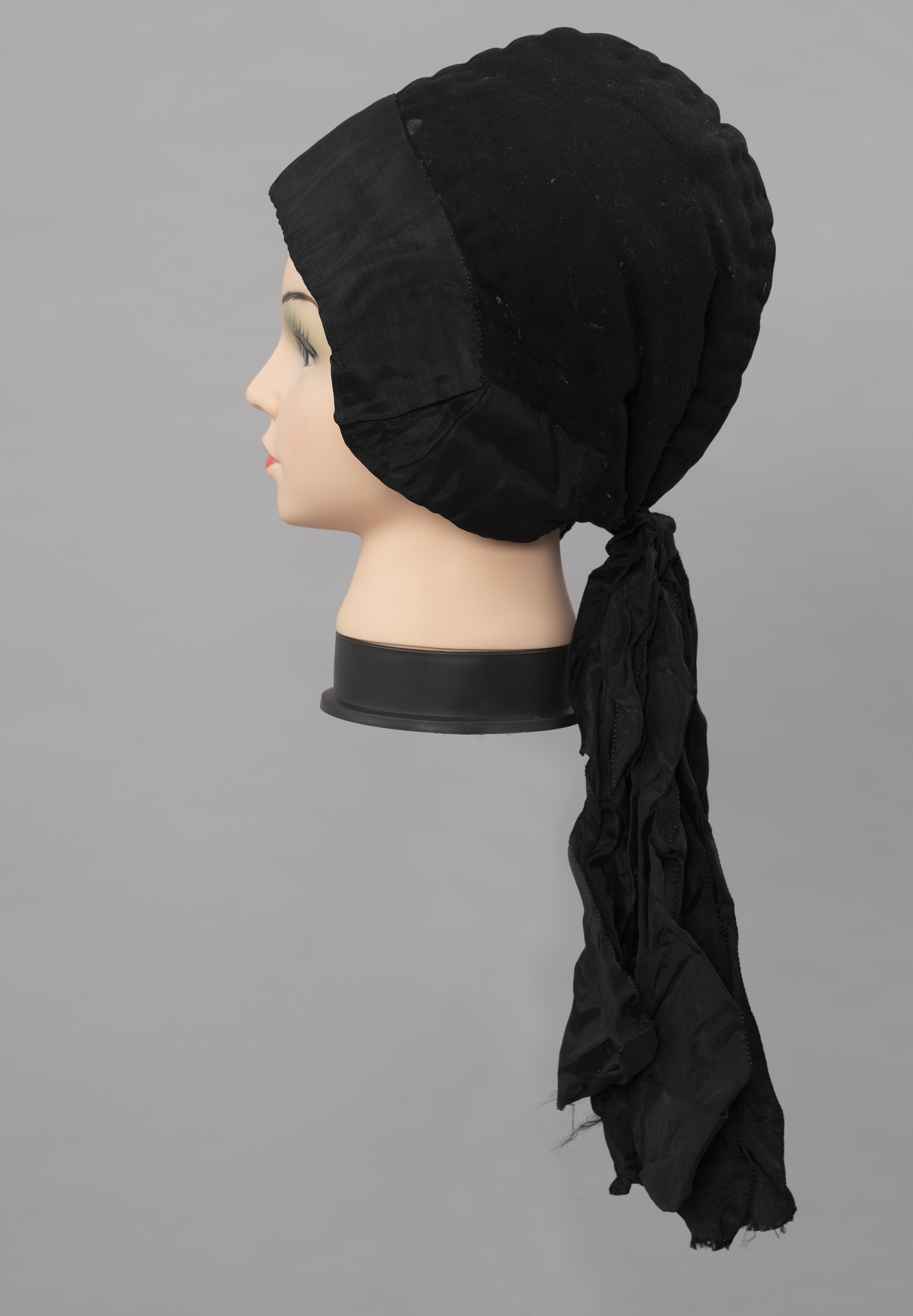 Naszyta dookoła główki czarna atłasowa wstążka czepka wskazuje, że należał on do mężatki. Takie nakrycia głowy niezależnie od pory roku i stanu cywilnego mieszkanki Mönchgut nosiły zawsze, nie zdejmując ich nawet w domu.