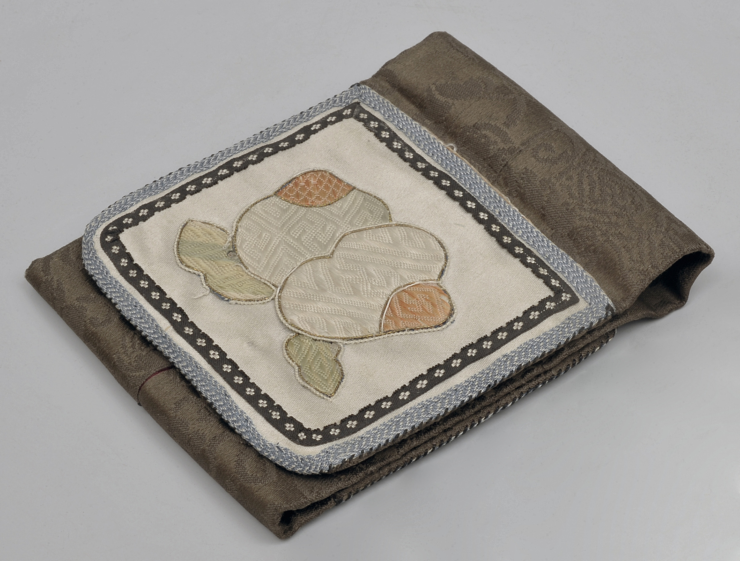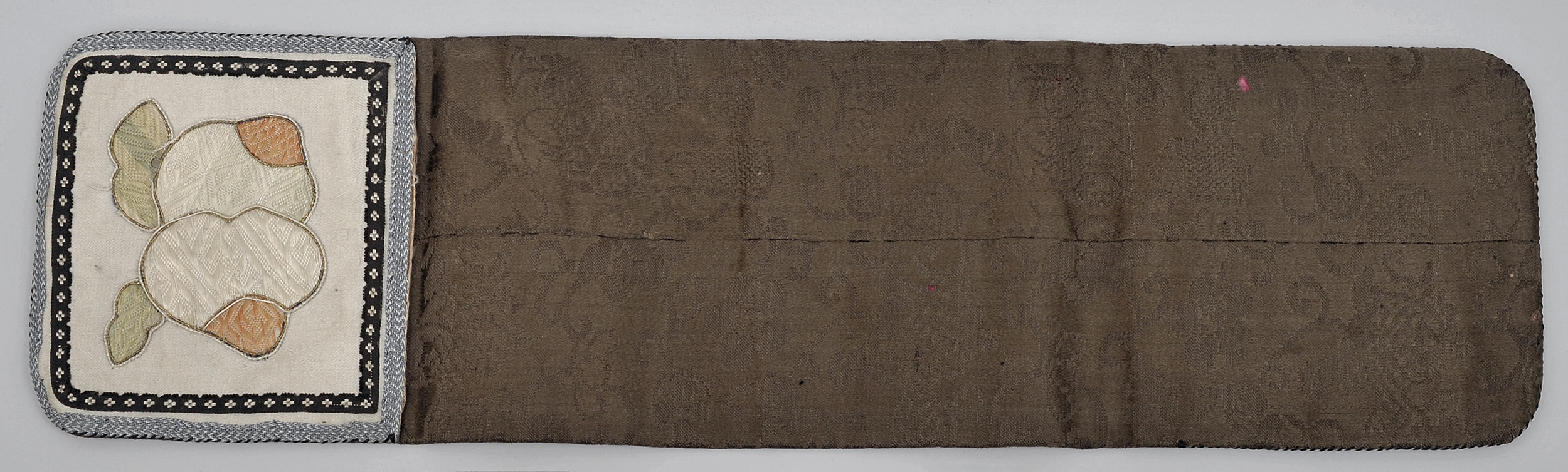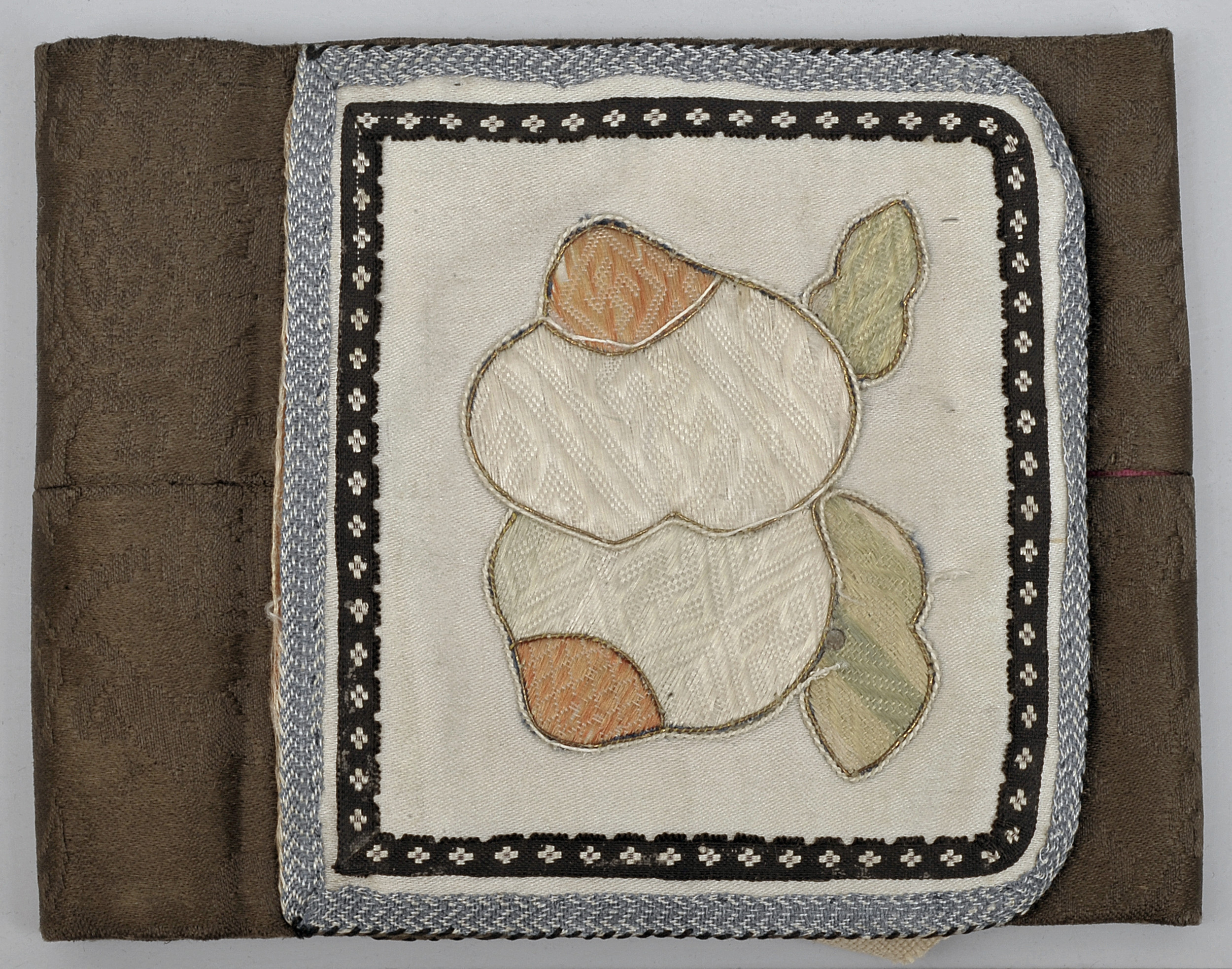 Chiński portfel wykonany z brązowego jedwabiu o kształcie wydłużonego prostokąta, miękko składany, z usztywnionymi dwiema kieszonkami. Obie strony przedmiotu zostały ozdobione haftowanymi aplikacjami przedstawiającymi parę owoców. Niniejszy portfel mógł służyć do przechowywania dekoracyjnie oprawionych lusterek.