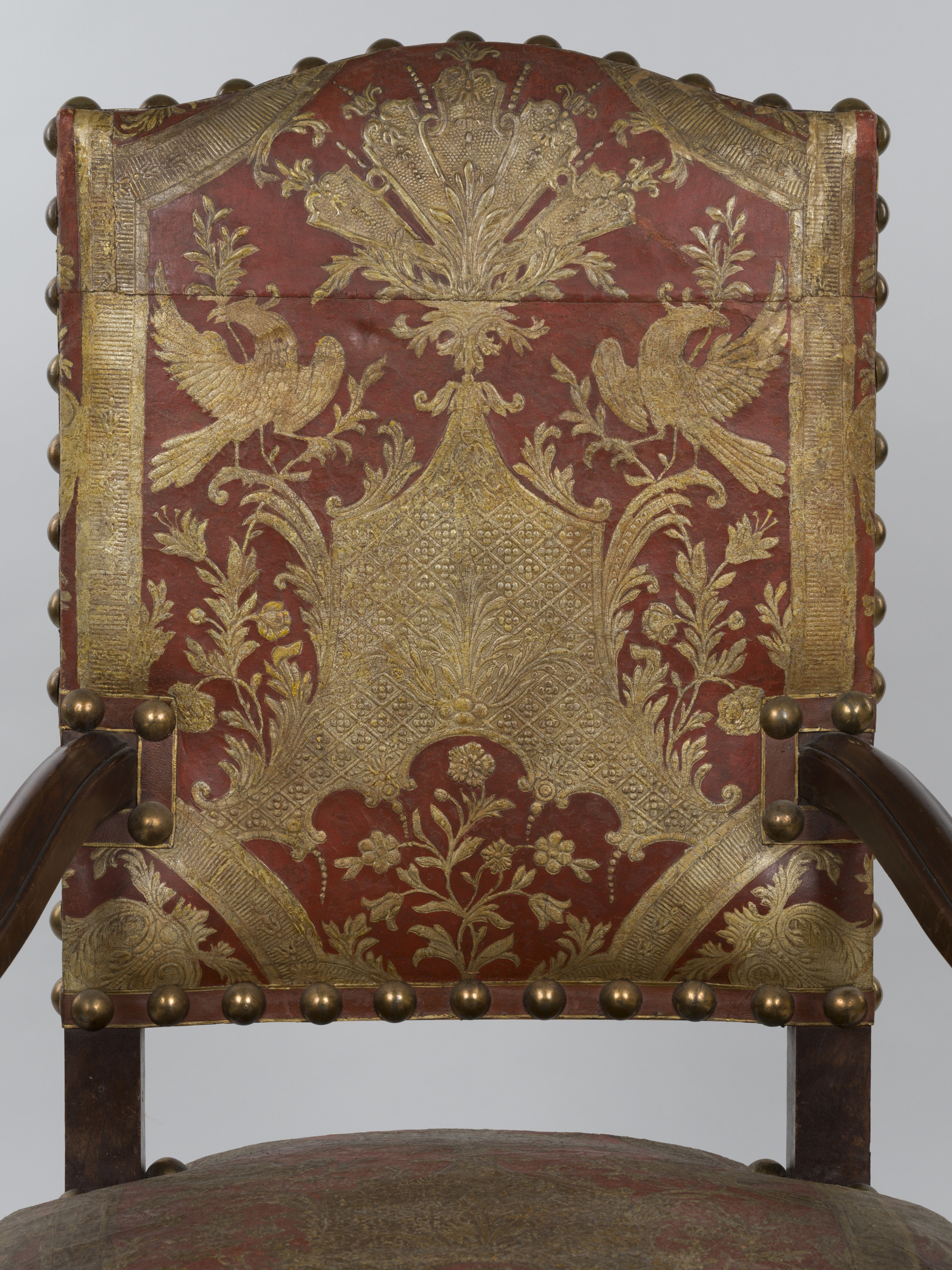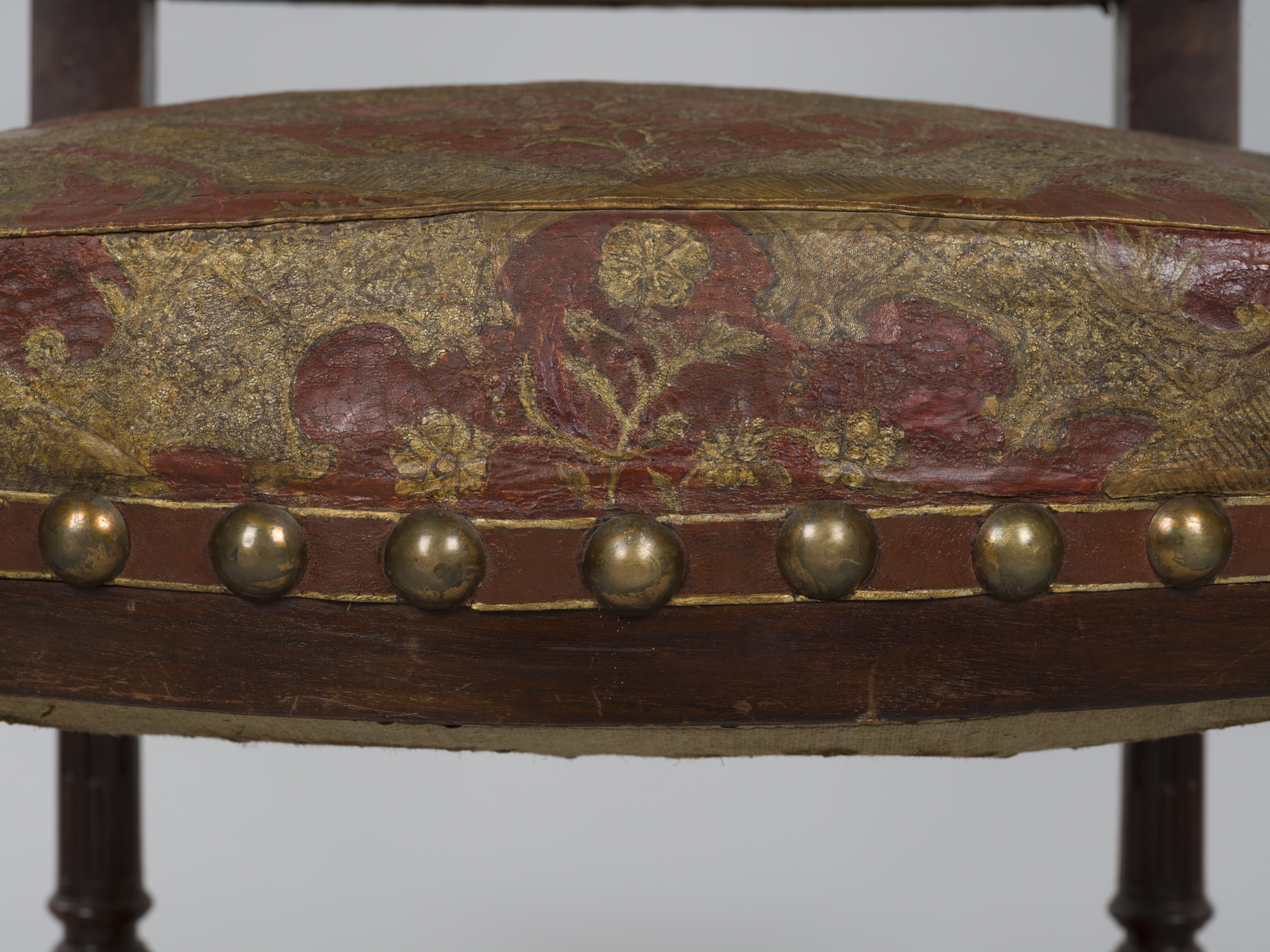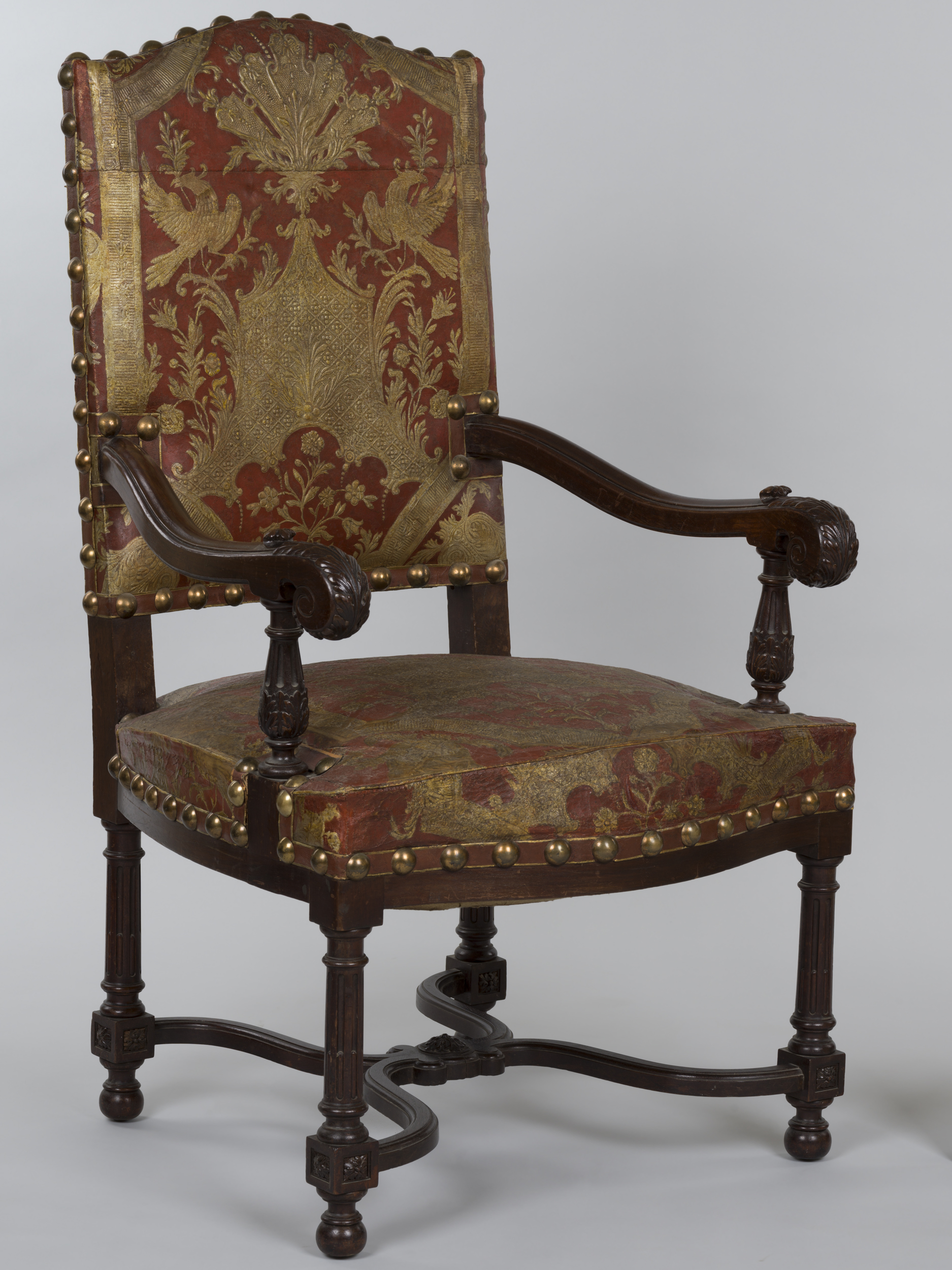 Fotel z tapicerowanym siedziskiem w kształcie trapezu o lekko wybrzuszonych krawędziach wspartym jest na czterech toczonych nogach zakończonych kulkami. Łączy je wiązanie w kształcie litery X z wygiętymi esowato ramionami. Miejsca połączenia wiązania z nogami ujęte są sześciobocznymi kostkami, dekorowanymi rzeźbionymi rozetkami. Prostokątne, tapicerowane oparcie pleców z lekkim wzniesieniem na górnej krawędzi połączone jest z siedziskiem bocznymi, prostymi listewkami z zachowaniem prześwitu. Lekko wygięte poręcze zakończone wolutami połączone są z siedziskiem tralkowattmi podpórkami. Powierzchnia eksponowanych części konstrukcyjnych jest rzeźbiona z zastosowaniem motywów liści akantu, kanelowania, profilowanych pierścieni. Oparcie pleców kryte jest od przodu i tyłu barwioną na czerwono skórą z wytłaczną i złoconą symetryczną kompozycją złożoną z kratki regencyjnej palmety, liści akantu, kampanull i ornamentu wstęgowego, Wśród nich dwa ptaki siedzące na krzewach z zerwanymi gałązkami w dziobach. Siedzisko również pokryte jest sztukowanymi fragmentami tej samej skóry. Krawędzie pokrycia mocowane są na cardze dużymi dekoracyjnymi mosiężnymi ćwiekami.