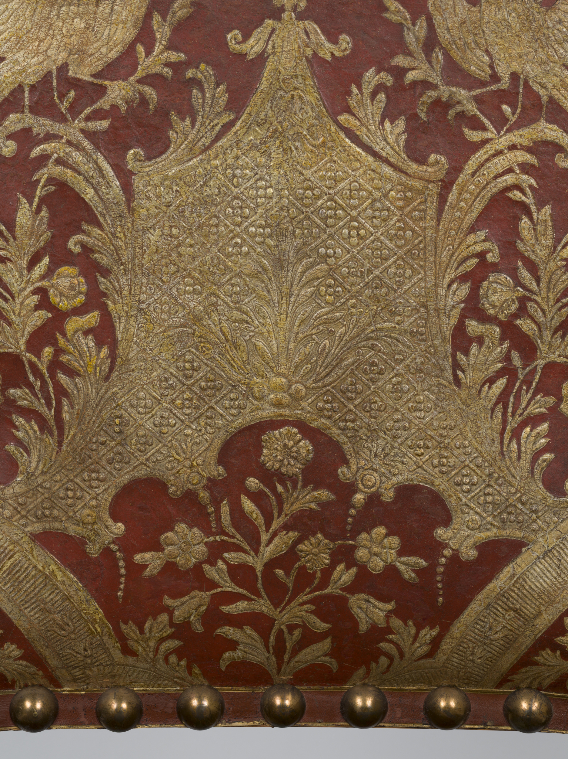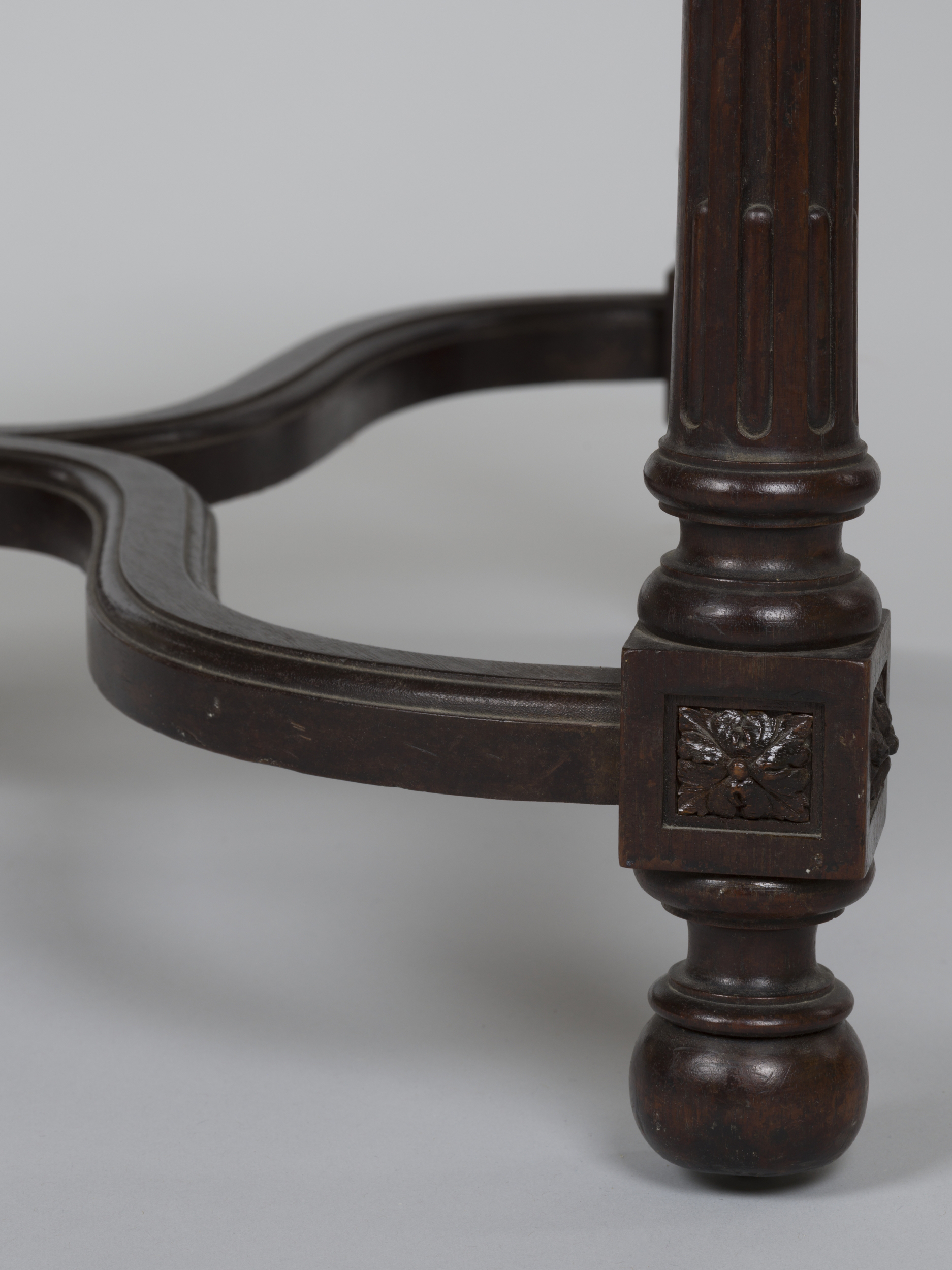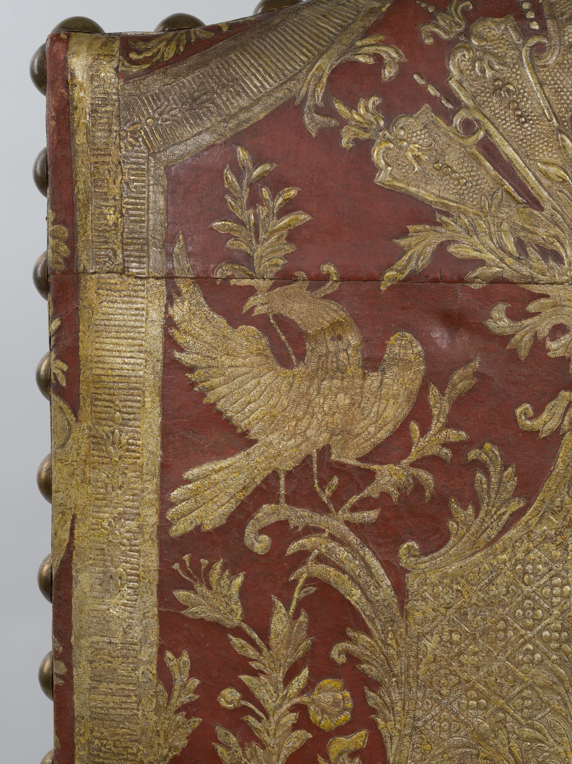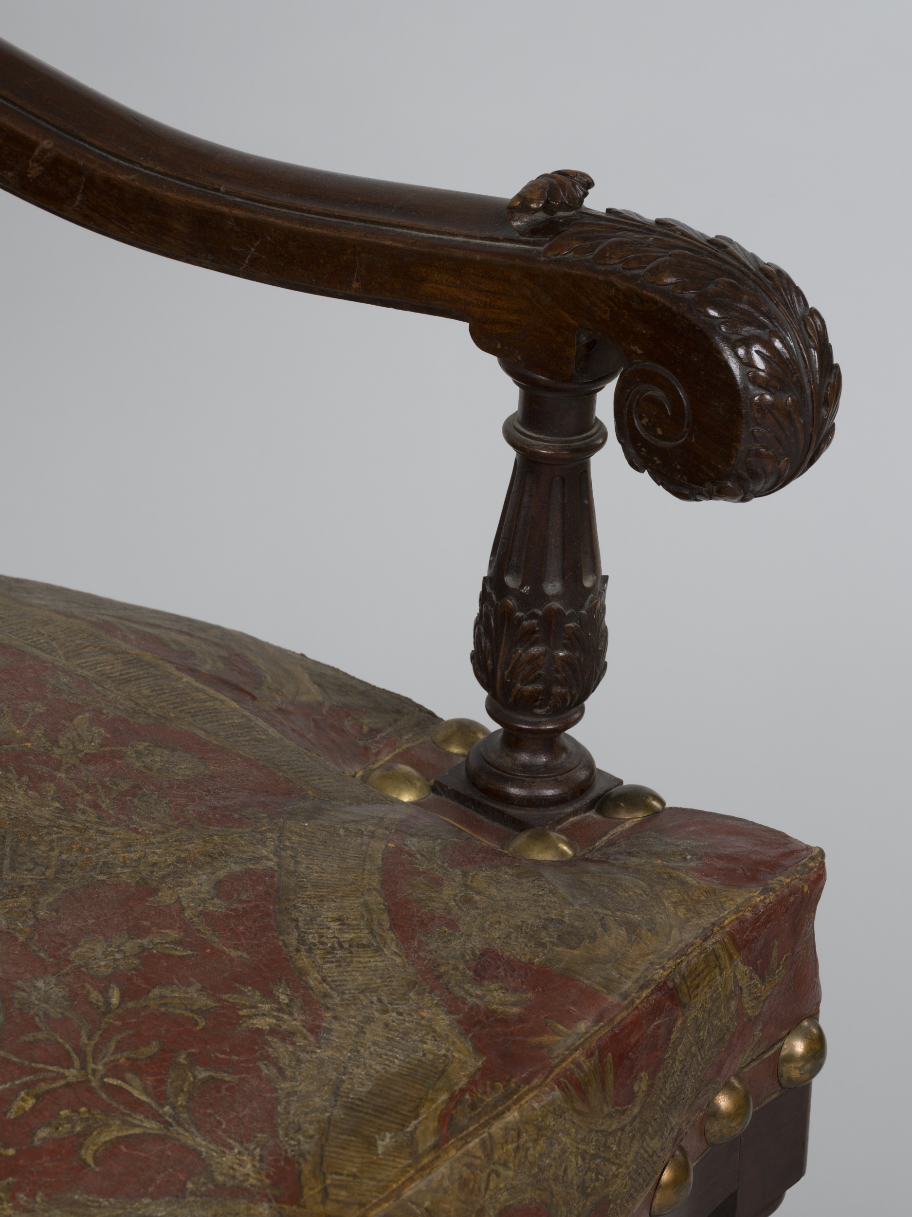 Fotel z tapicerowanym siedziskiem w kształcie trapezu o lekko wybrzuszonych krawędziach wspartym jest na czterech toczonych nogach zakończonych kulkami. Łączy je wiązanie w kształcie litery X z wygiętymi esowato ramionami. Miejsca połączenia wiązania z nogami ujęte są sześciobocznymi kostkami, dekorowanymi rzeźbionymi rozetkami. Prostokątne, tapicerowane oparcie pleców z lekkim wzniesieniem na górnej krawędzi połączone jest z siedziskiem bocznymi, prostymi listewkami z zachowaniem prześwitu. Lekko wygięte poręcze zakończone wolutami połączone są z siedziskiem tralkowattmi podpórkami. Powierzchnia eksponowanych części konstrukcyjnych jest rzeźbiona z zastosowaniem motywów liści akantu, kanelowania, profilowanych pierścieni. Oparcie pleców kryte jest od przodu i tyłu barwioną na czerwono skórą z wytłaczną i złoconą symetryczną kompozycją złożoną z kratki regencyjnej palmety, liści akantu, kampanull i ornamentu wstęgowego, Wśród nich dwa ptaki siedzące na krzewach z zerwanymi gałązkami w dziobach. Siedzisko również pokryte jest sztukowanymi fragmentami tej samej skóry. Krawędzie pokrycia mocowane są na cardze dużymi dekoracyjnymi mosiężnymi ćwiekami.