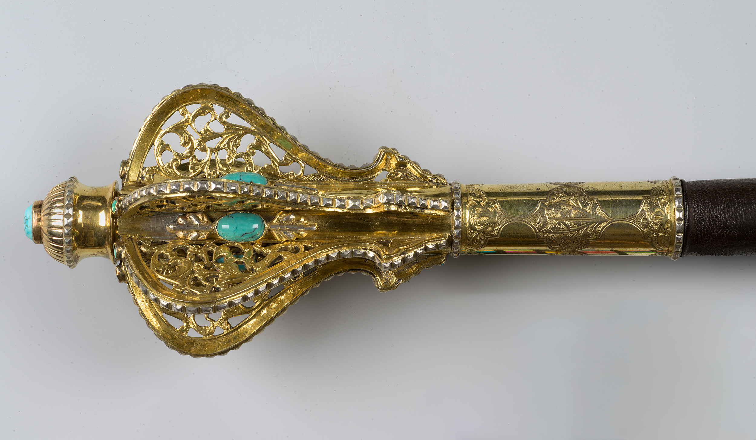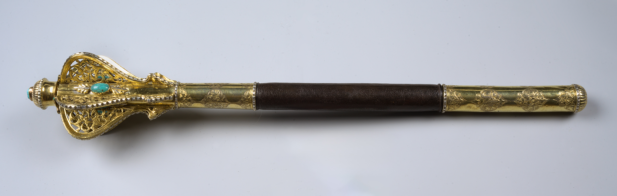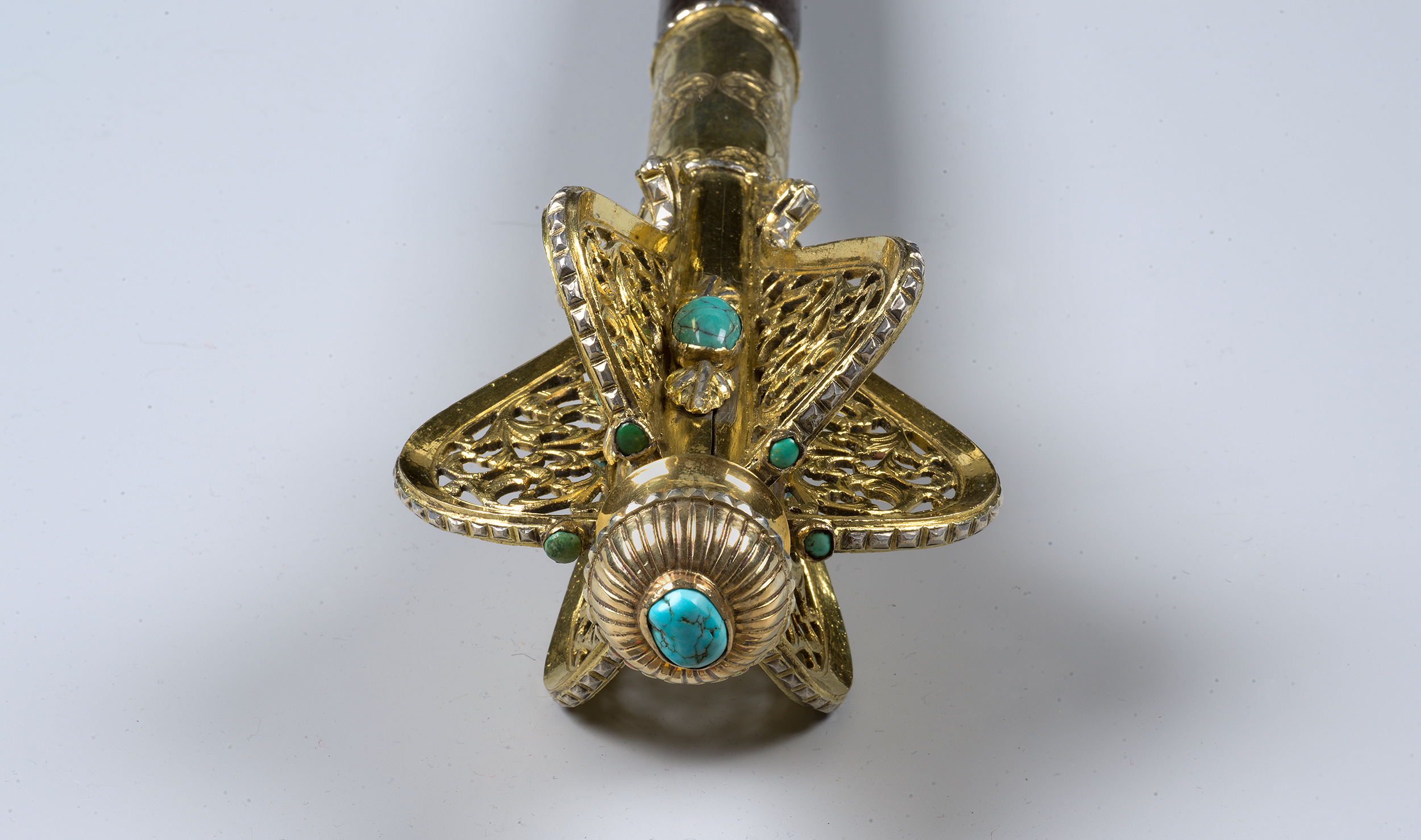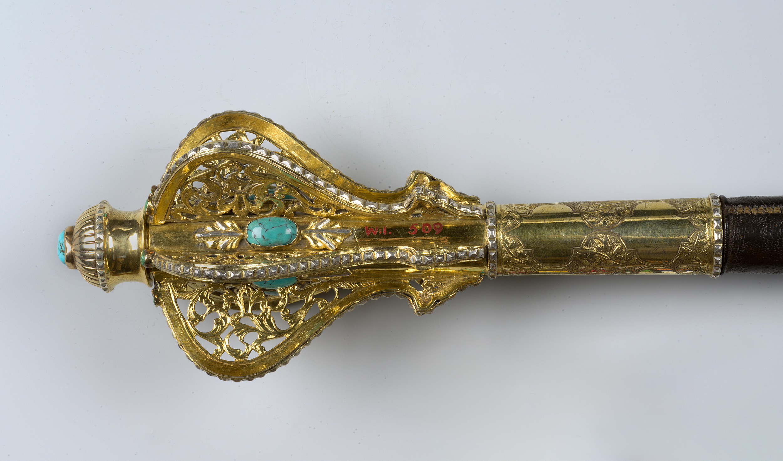 Buzdygan oficerski, nr inw. Wil.509, pochodzi z pierwszej połowy XVIII wieku. Rękojeść buzdyganu składa się z dwóch srebrnych i pozłacanych tulei osadzonych w górnej i dolnej partii drewnianego trzona. Środkowa część rękojeści obciągnięta jest czarną skórą. Każdą część trzona oddziela karbowany pierścień z metalu. Metalowe powierzchnie tulei zdobione są kartuszami, zawierają dekoracje ze stylizowanych motywów roślinnych. Takie zdobienia są charakterystyczne dla ornamentyki perskiej oraz tureckiej. Zakończenie trzonka stanowi głowica złożona z sześciu ażurowych piór o esowatym wykroju. Profile piór pokrywają bogate dekoracje roślinne: stylizowane, lancetowate, strzępiaste i mocno wygięte liście. Między piórami – na trzonie, na wierzchołkach piór oraz na szczycie głowicy widocznych jest sześć eliptycznych kaszt, w których osadzono turkusy.